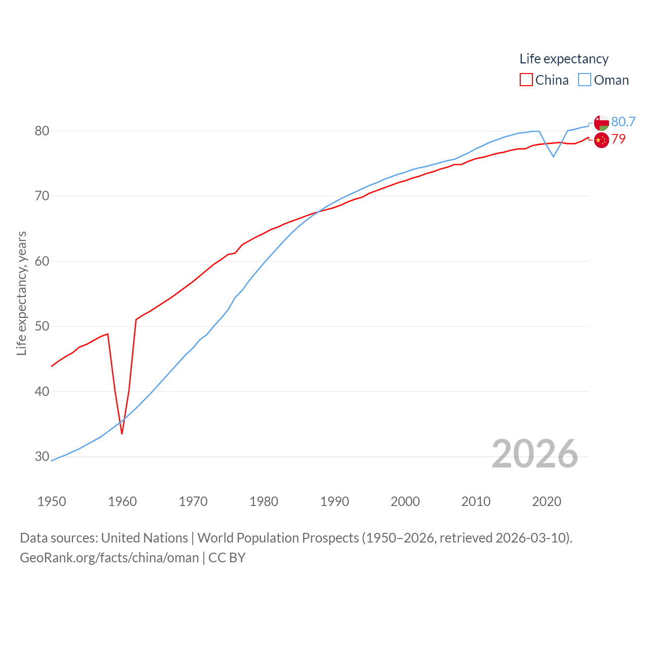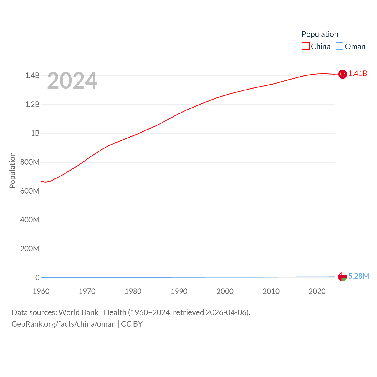 China has a population of 1.41B (ranked 2/197), compared with 5.28M in Oman (ranked 124/197). China's land area is 3,624,808 sq mi versus 119,499 sq mi for Oman (ranked 2nd vs. 68th).