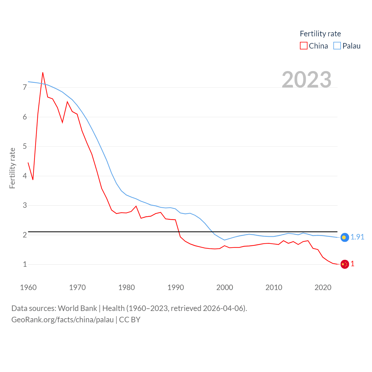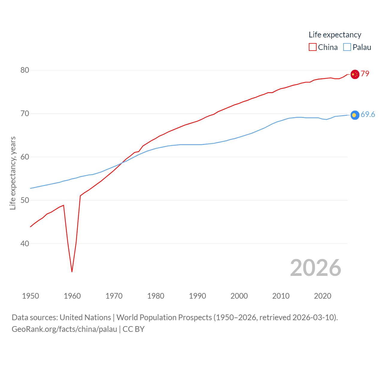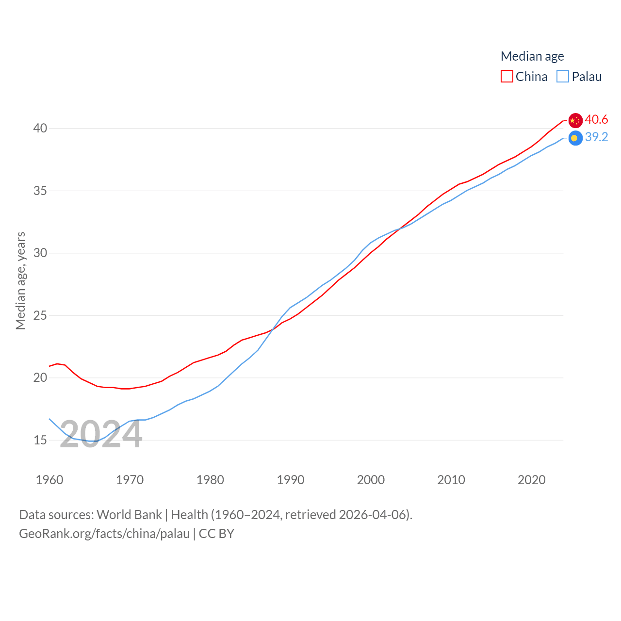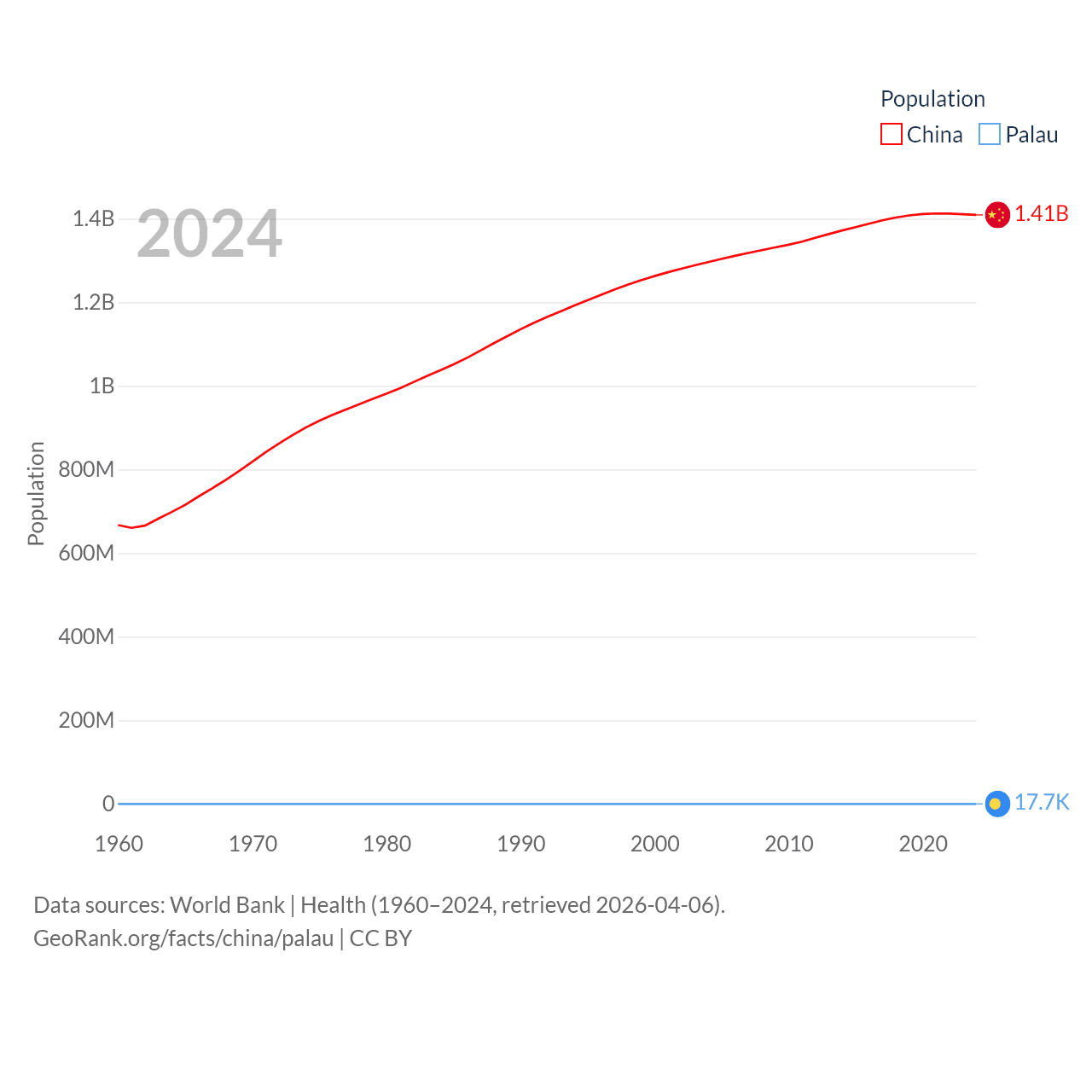 China has a population of 1.41B (ranked 2/197), compared with 17.7K in Palau (ranked 194/197). China's land area is 3,624,808 sq mi versus 177.6 sq mi for Palau (ranked 2nd vs. 180th).