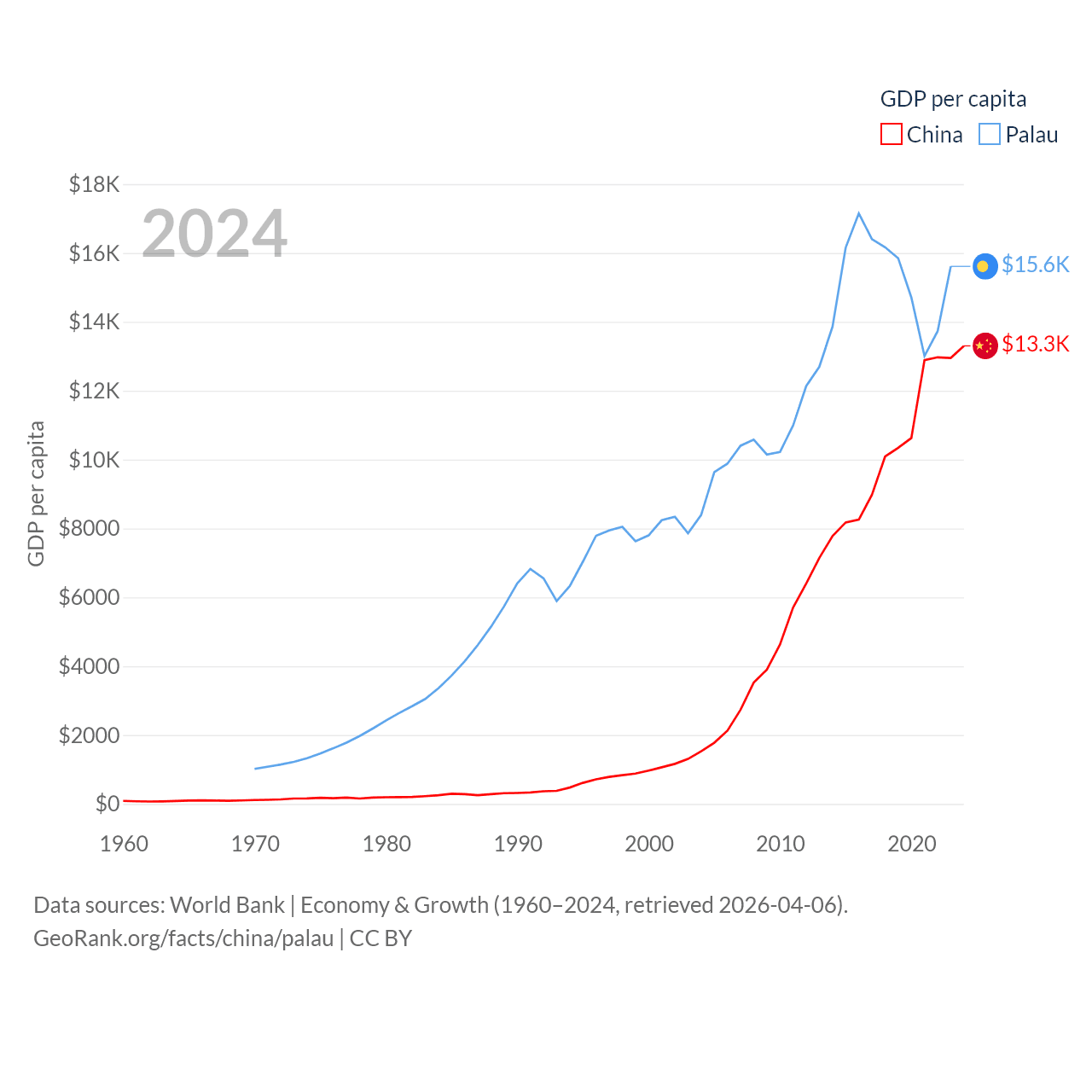 By GDP, China ranks 2/197 ($18.7T) and Palau ranks 194/197 ($277M). By GDP per capita, China ranks 76/197 ($13,303), while Palau ranks 67/197 ($15,611).