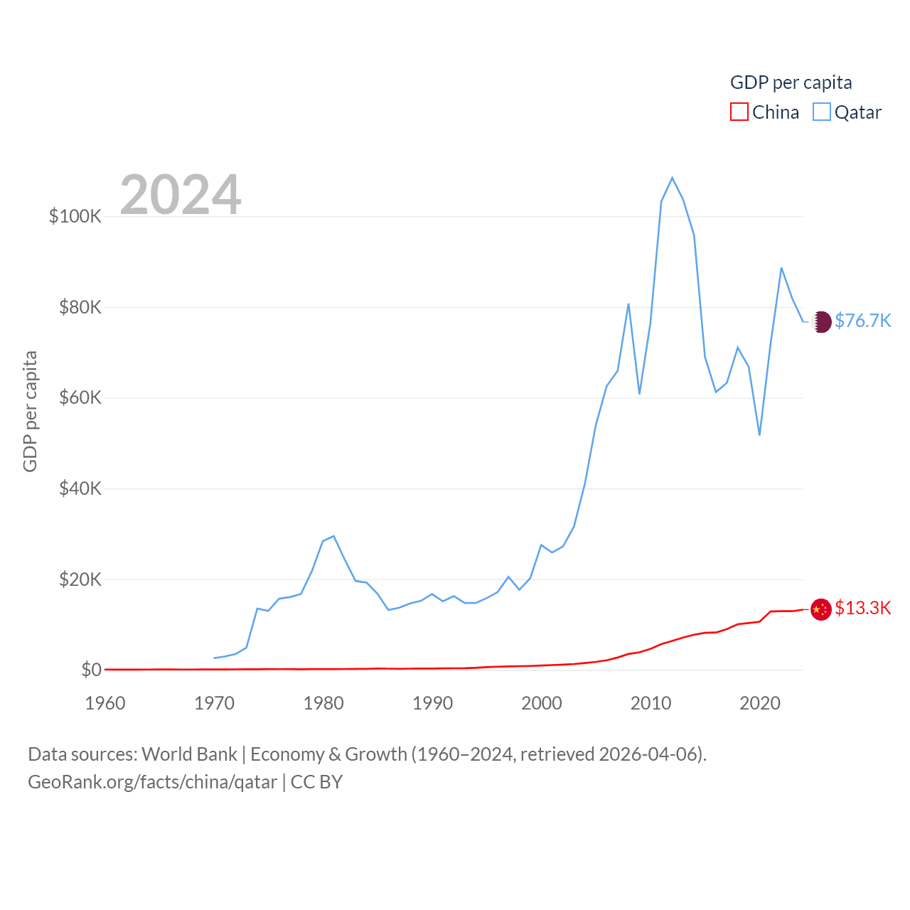 By GDP, China ranks 2/197 ($18.7T) and Qatar ranks 56/197 ($219B). By GDP per capita, China ranks 76/197 ($13,303), while Qatar ranks 11/197 ($76,689).