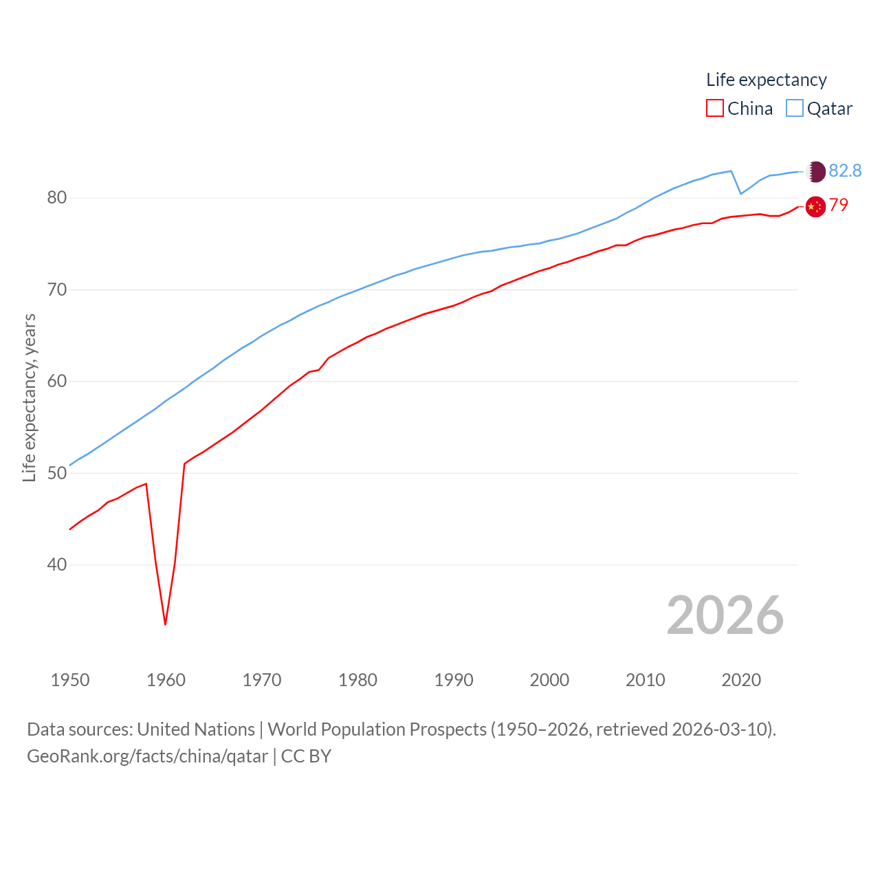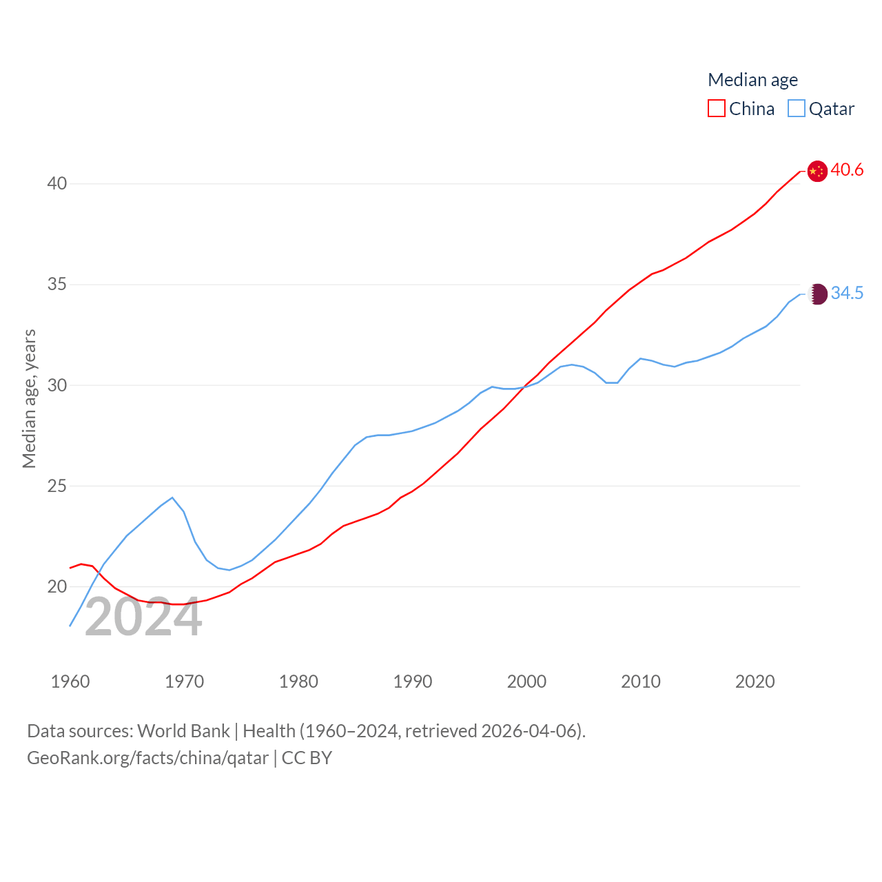 China has a population of 1.41B (ranked 2/197), compared with 2.86M in Qatar (ranked 138/197). China's land area is 3,624,808 sq mi versus 4,436 sq mi for Qatar (ranked 2nd vs. 158th).