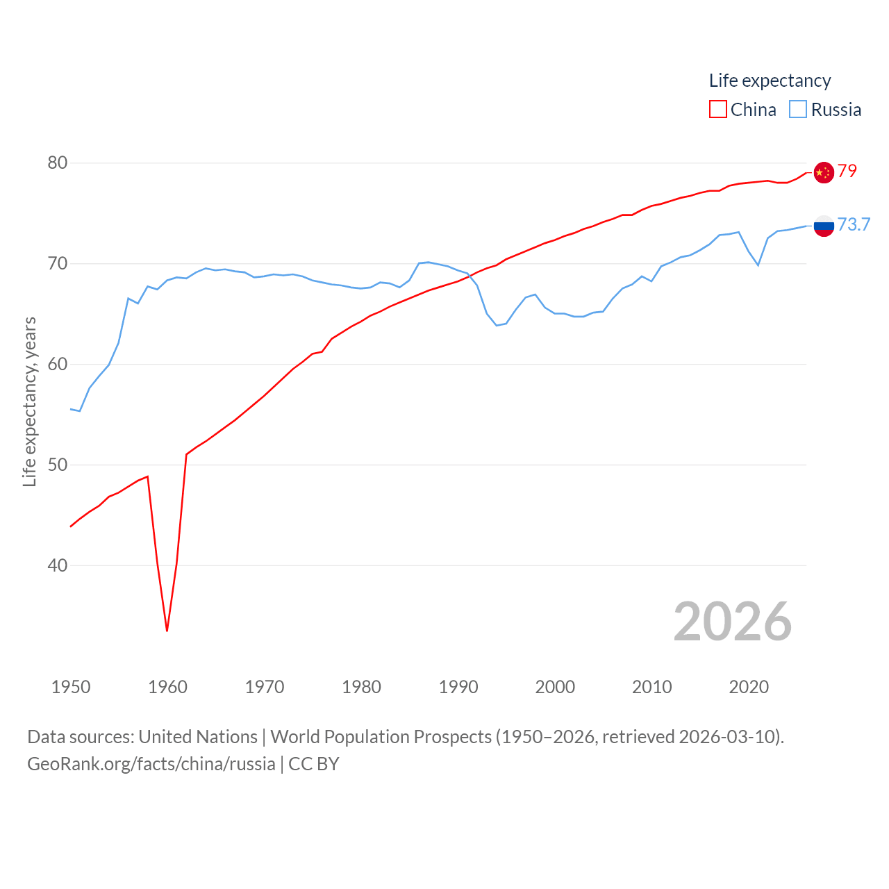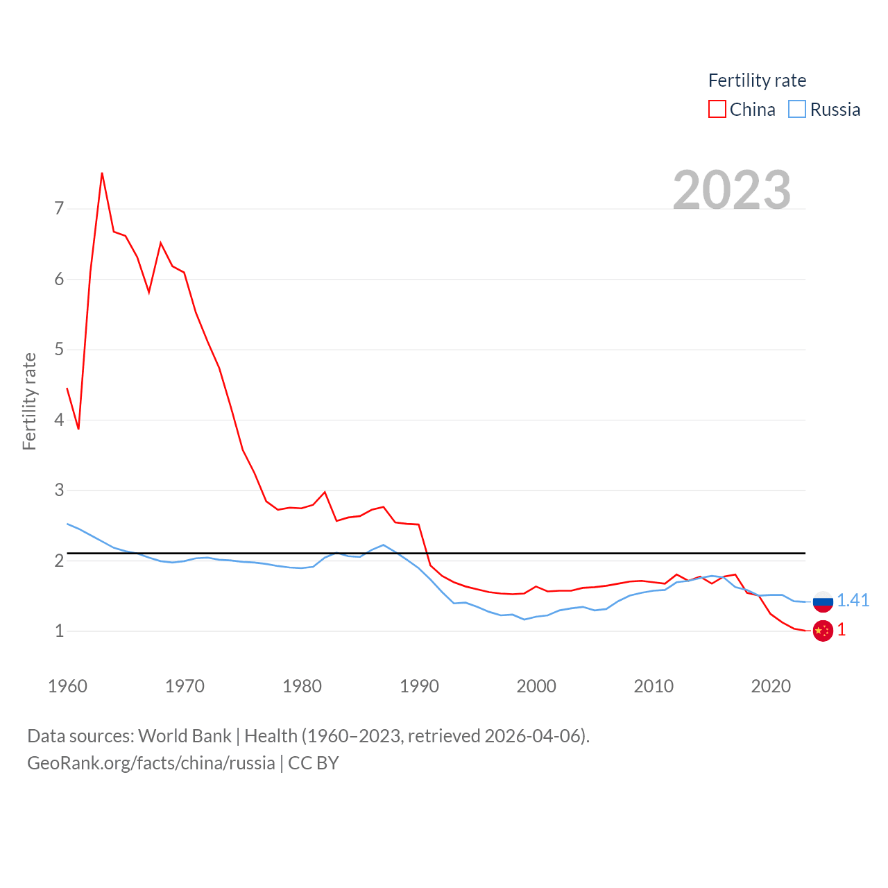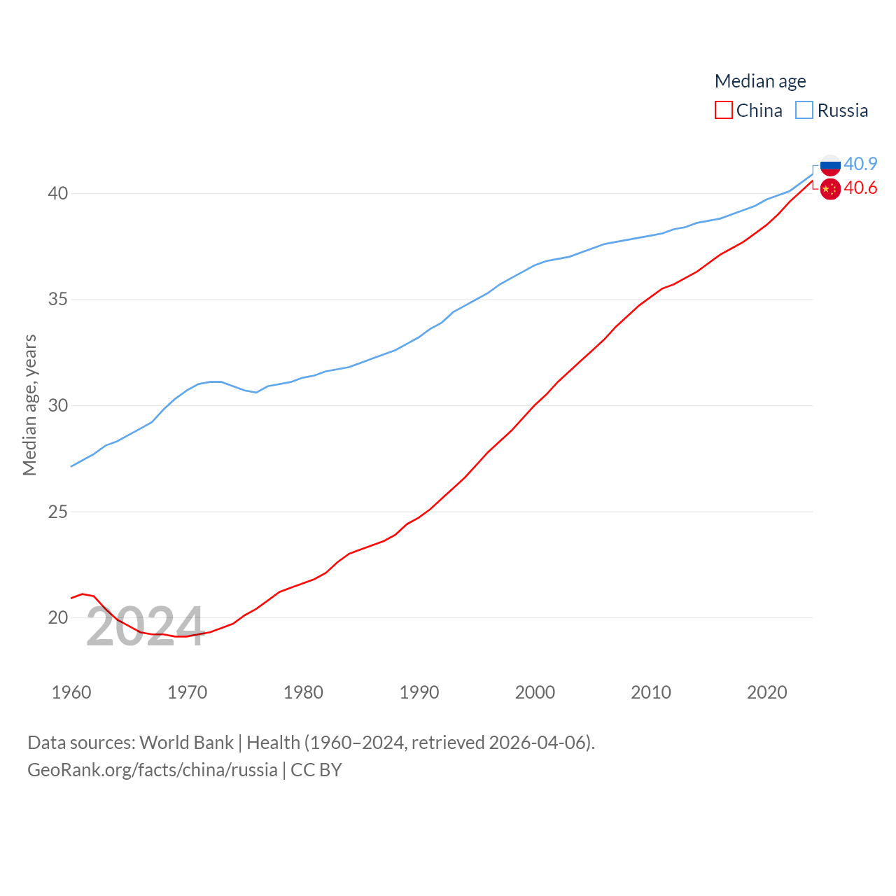China has a population of 1.41B (ranked 2/197), compared with 144M in Russia (ranked 9/197). China's land area is 3,624,808 sq mi versus 6,323,145 sq mi for Russia (ranked 2nd vs. 1st).