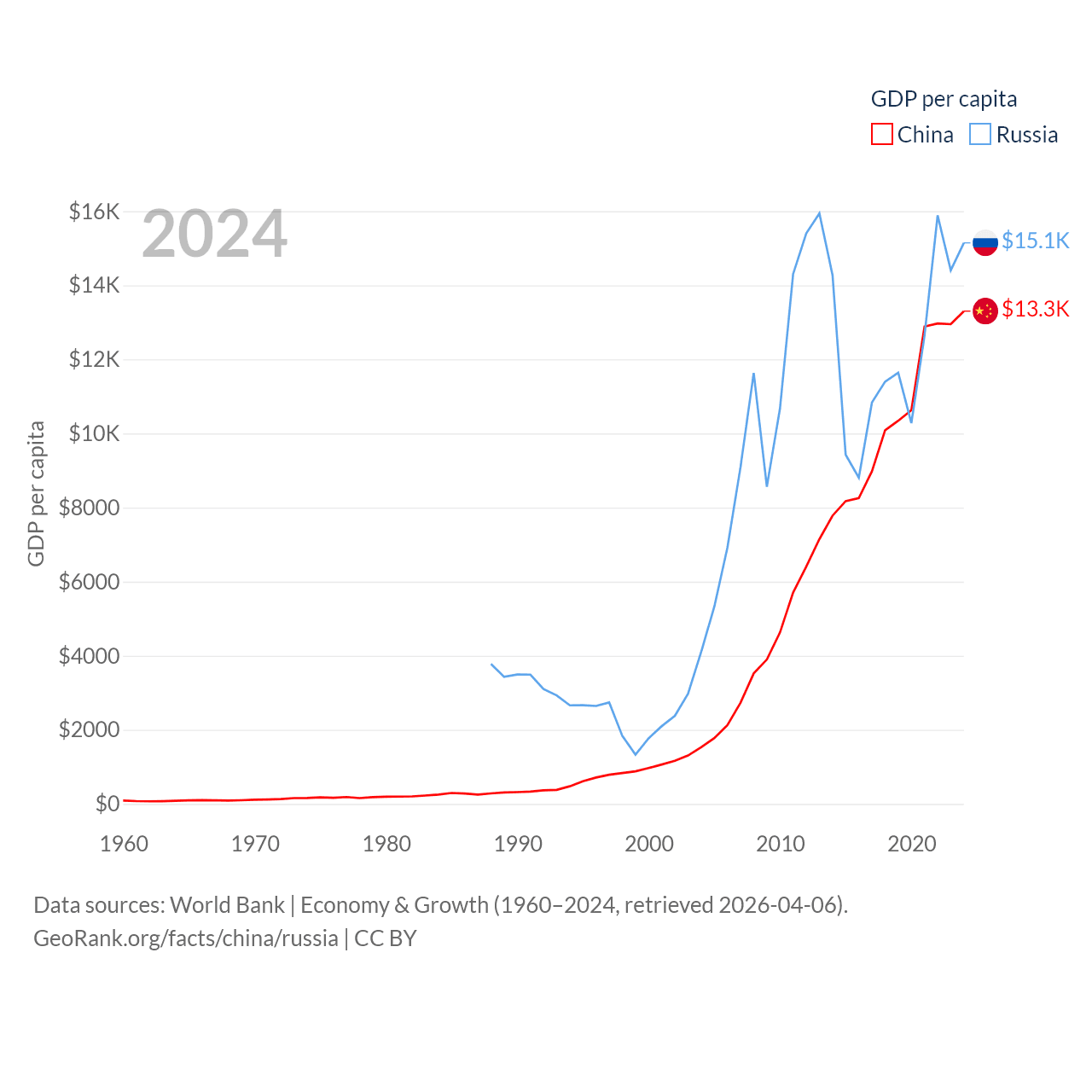 By GDP, China ranks 2/197 ($18.7T) and Russia ranks 11/197 ($2.17T). By GDP per capita, China ranks 76/197 ($13,303), while Russia ranks 68/197 ($15,145).