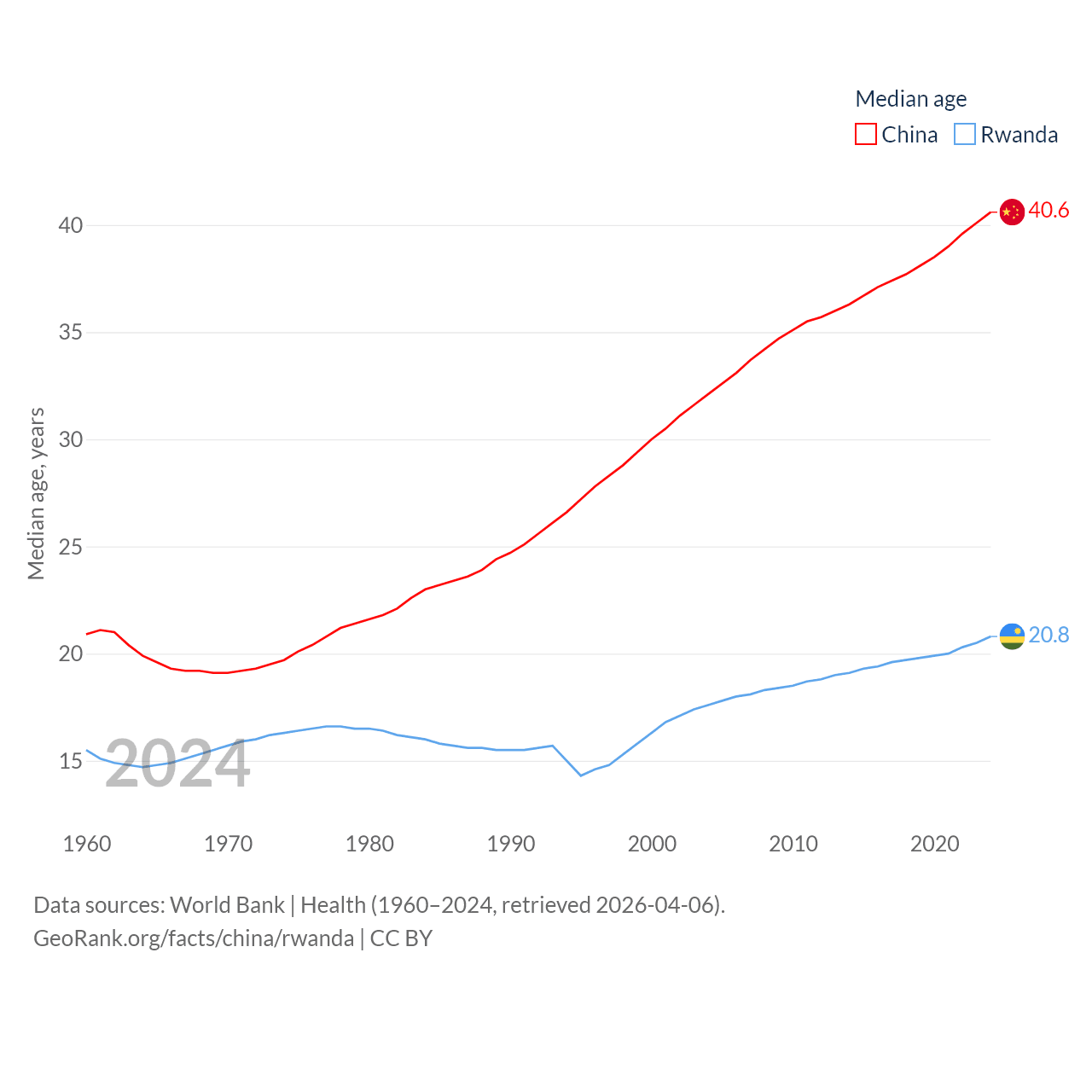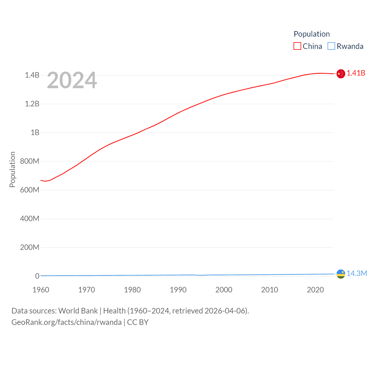 China has a population of 1.41B (ranked 2/197), compared with 14.3M in Rwanda (ranked 77/197). China's land area is 3,624,808 sq mi versus 9,525 sq mi for Rwanda (ranked 2nd vs. 146th).