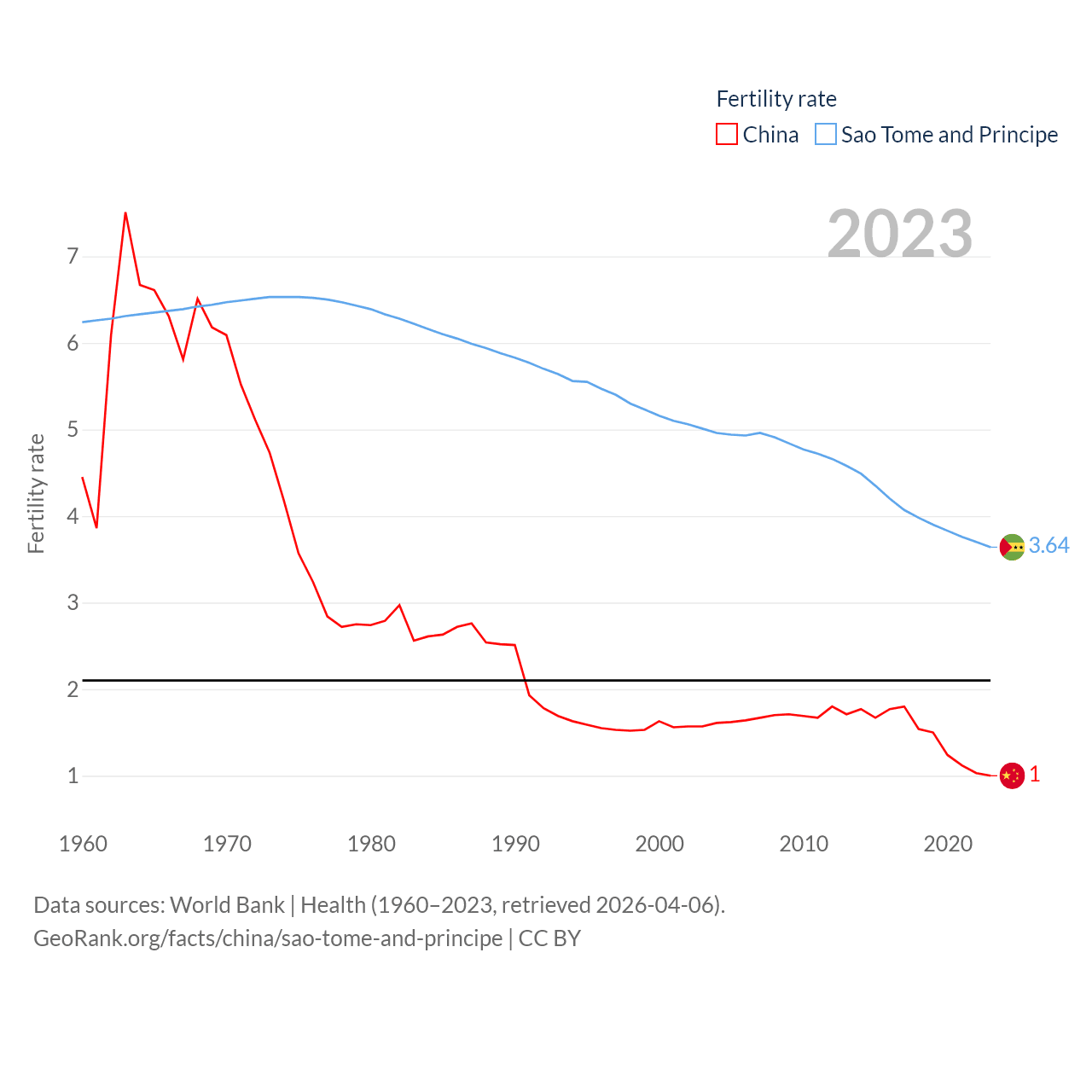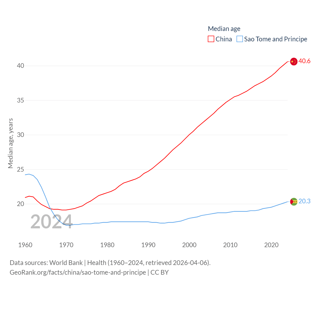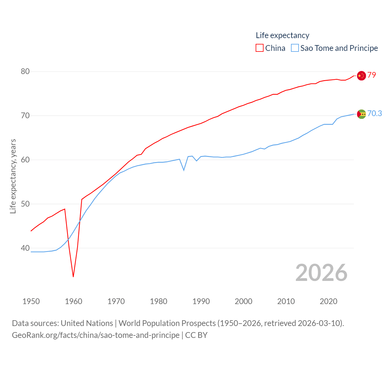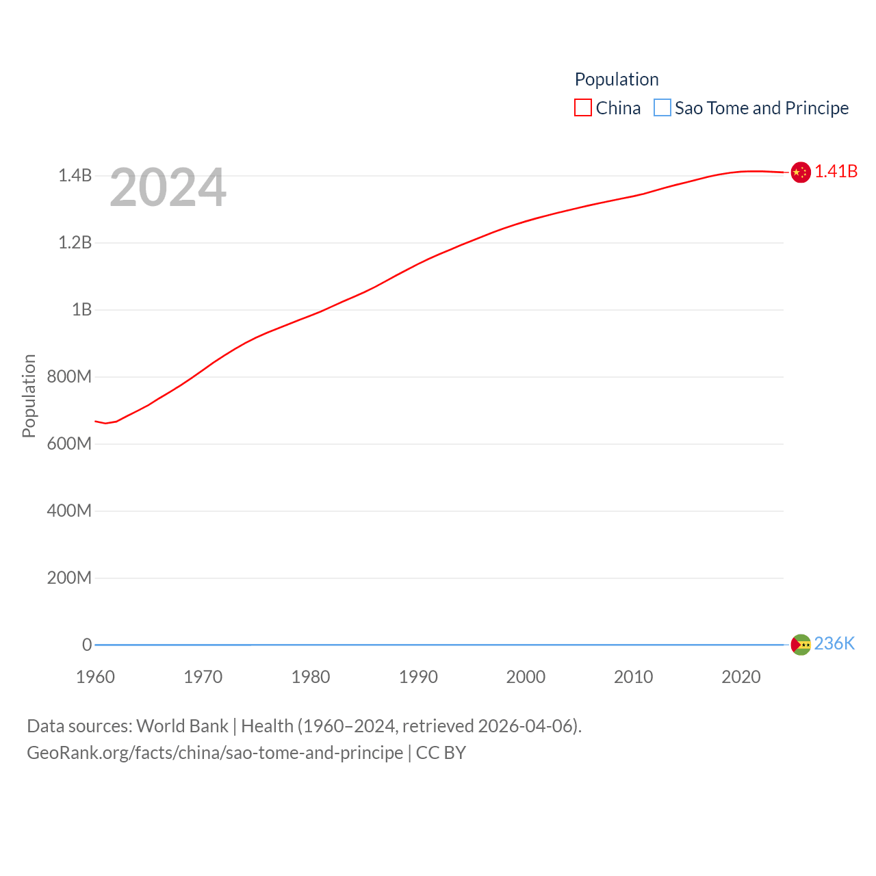 China has a population of 1.41B (ranked 2/197), compared with 236K in Sao Tome and Principe (ranked 176/197). China's land area is 3,624,808 sq mi versus 371 sq mi for Sao Tome and Principe (ranked 2nd vs. 172nd).