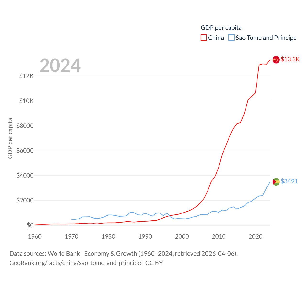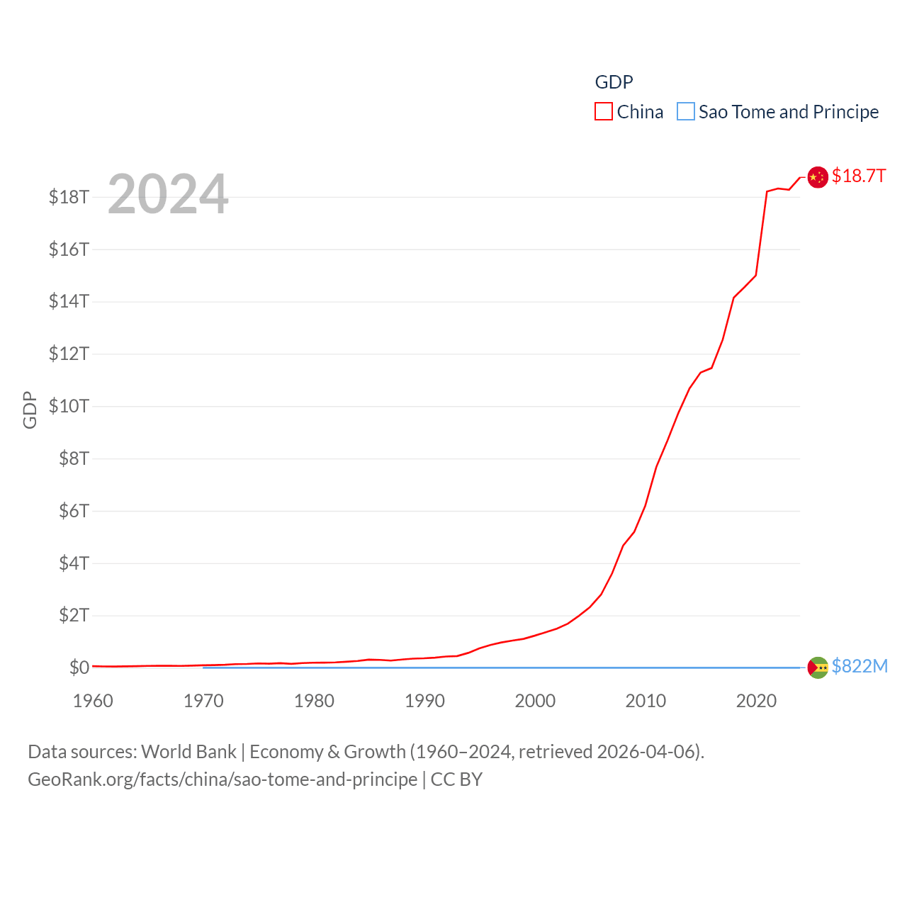 By GDP, China ranks 2/197 ($18.7T) and Sao Tome and Principe ranks 189/197 ($822M). By GDP per capita, China ranks 76/197 ($13,303), while Sao Tome and Principe ranks 134/197 ($3,491).