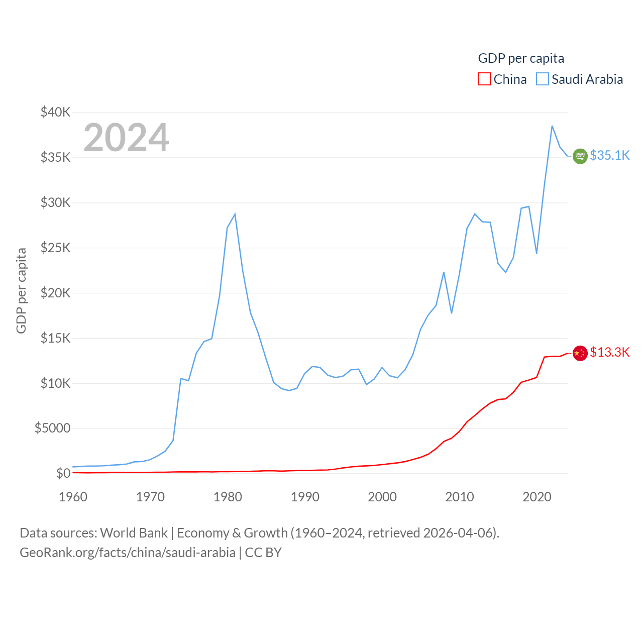 By GDP, China ranks 2/197 ($18.7T) and Saudi Arabia ranks 18/197 ($1.24T). By GDP per capita, China ranks 76/197 ($13,303), while Saudi Arabia ranks 33/197 ($35,122).