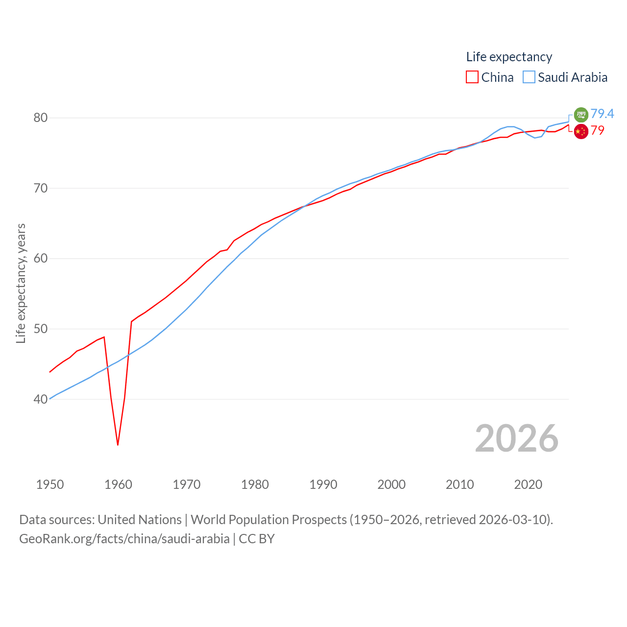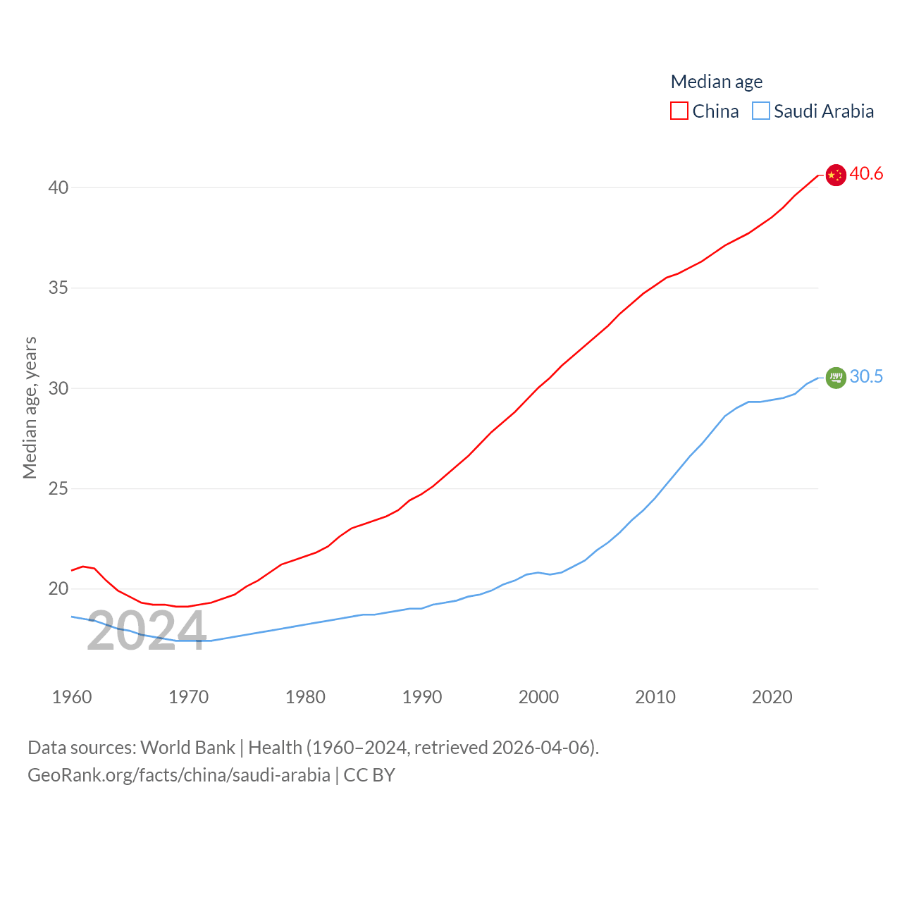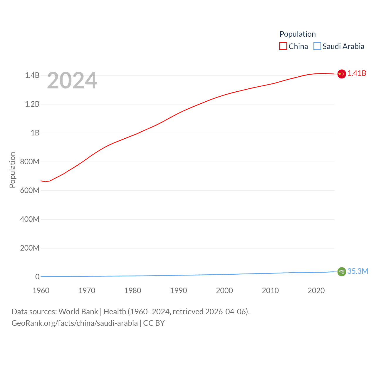 China has a population of 1.41B (ranked 2/197), compared with 35.3M in Saudi Arabia (ranked 45/197). China's land area is 3,624,808 sq mi versus 830,000 sq mi for Saudi Arabia (ranked 2nd vs. 12th).