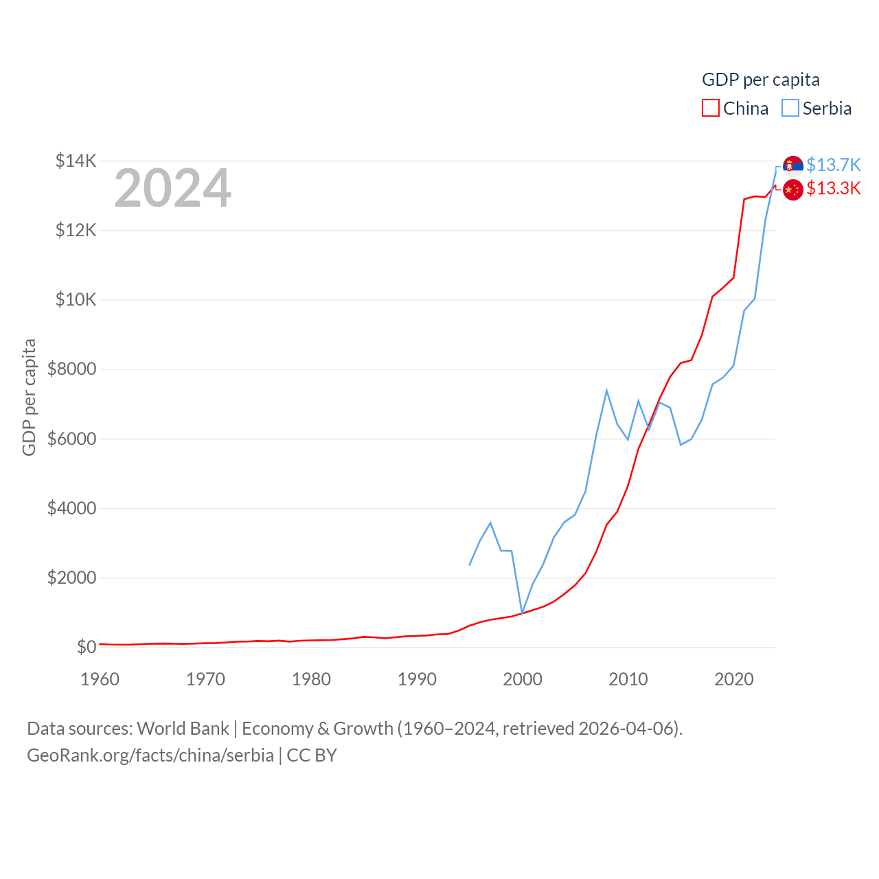 By GDP, China ranks 2/197 ($18.7T) and Serbia ranks 76/197 ($90.1B). By GDP per capita, China ranks 76/197 ($13,303), while Serbia ranks 73/197 ($13,679).