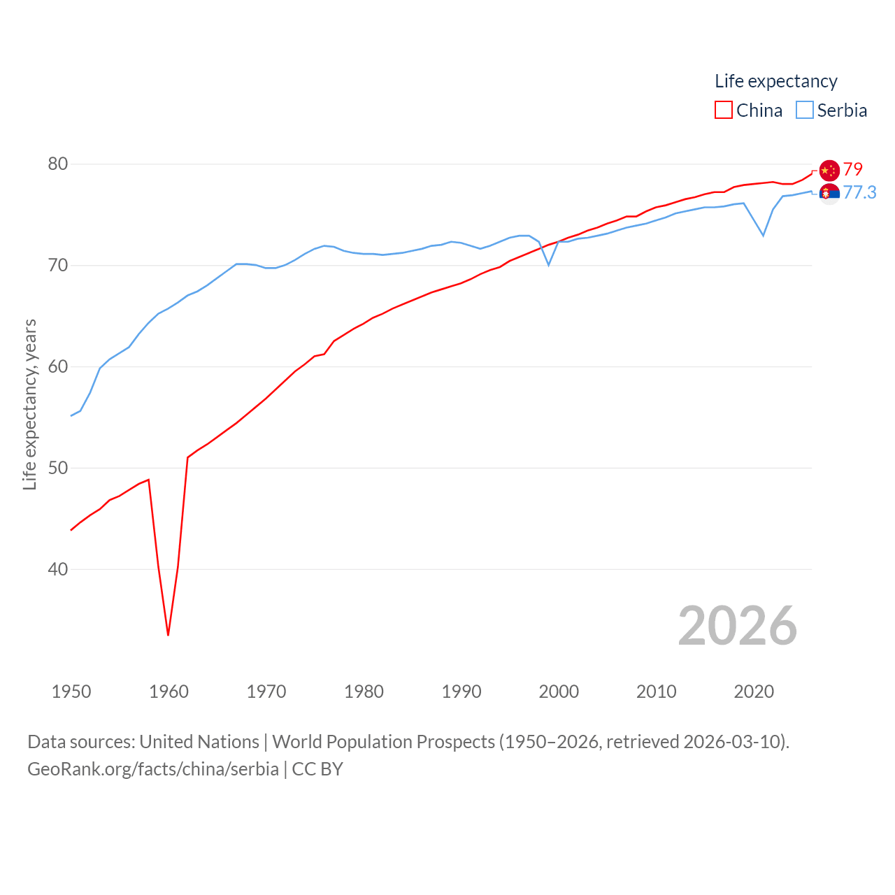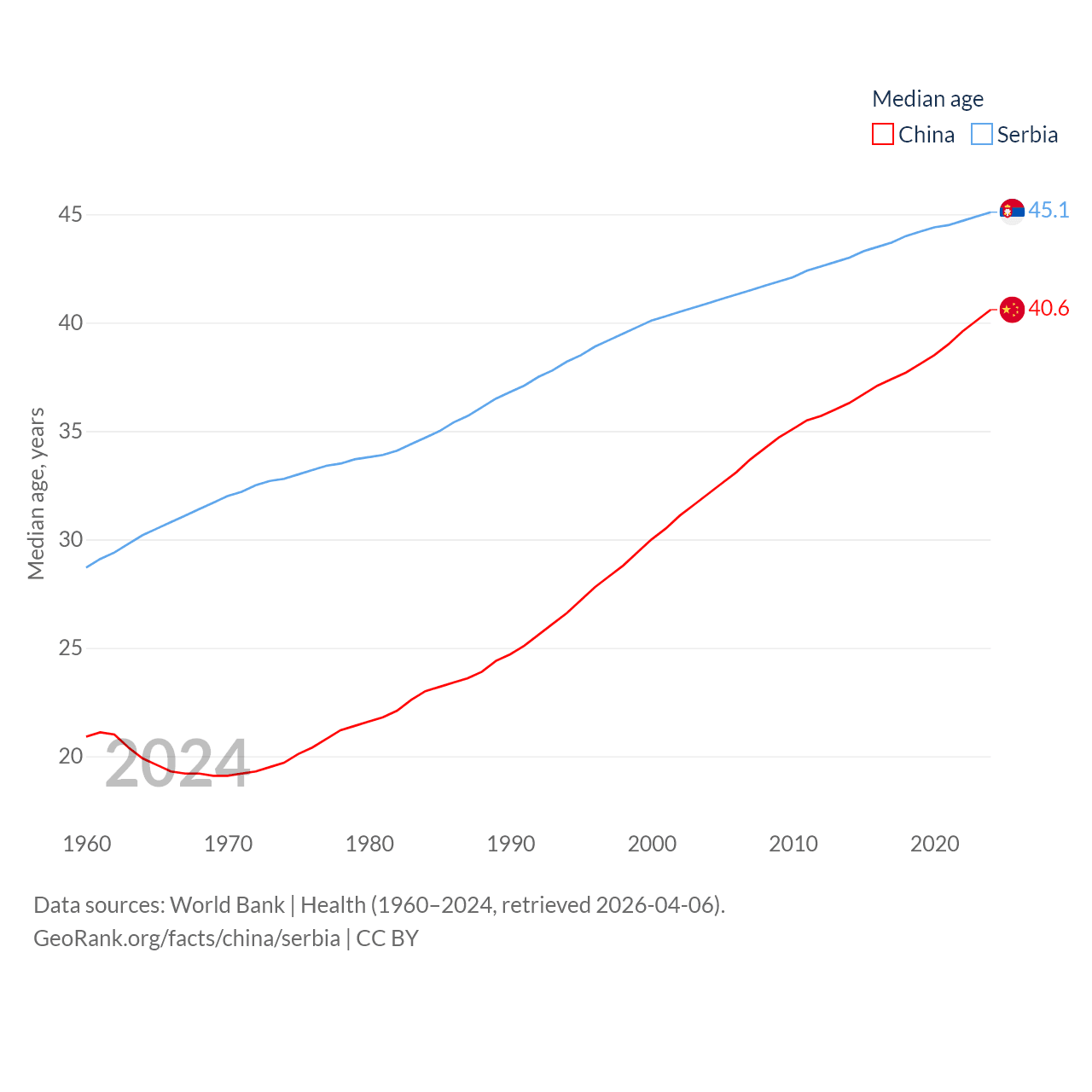 China has a population of 1.41B (ranked 2/197), compared with 6.59M in Serbia (ranked 109/197). China's land area is 3,624,808 sq mi versus 32,467 sq mi for Serbia (ranked 2nd vs. 111th).