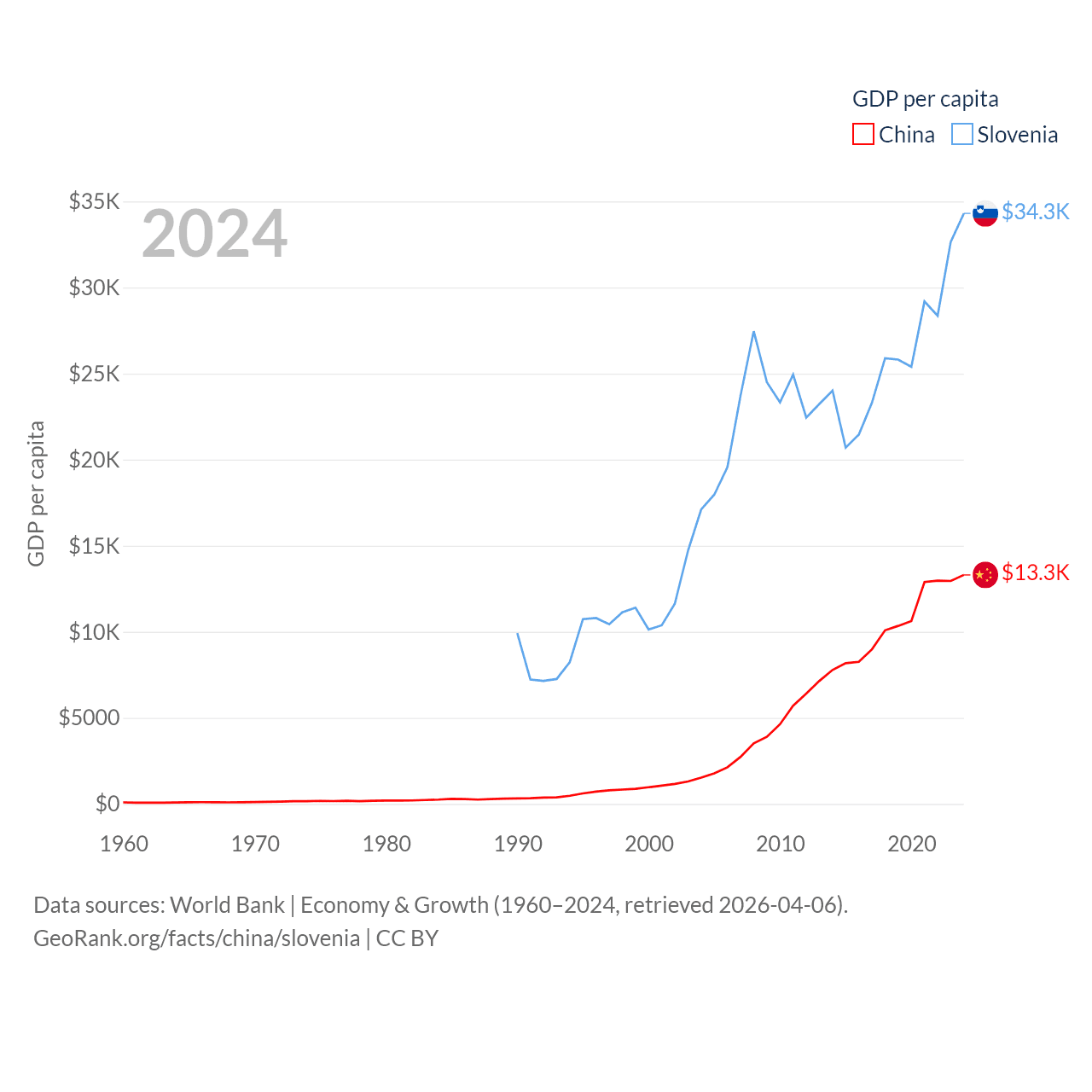 By GDP, China ranks 2/197 ($18.7T) and Slovenia ranks 86/197 ($73B). By GDP per capita, China ranks 76/197 ($13,303), while Slovenia ranks 34/197 ($34,301).