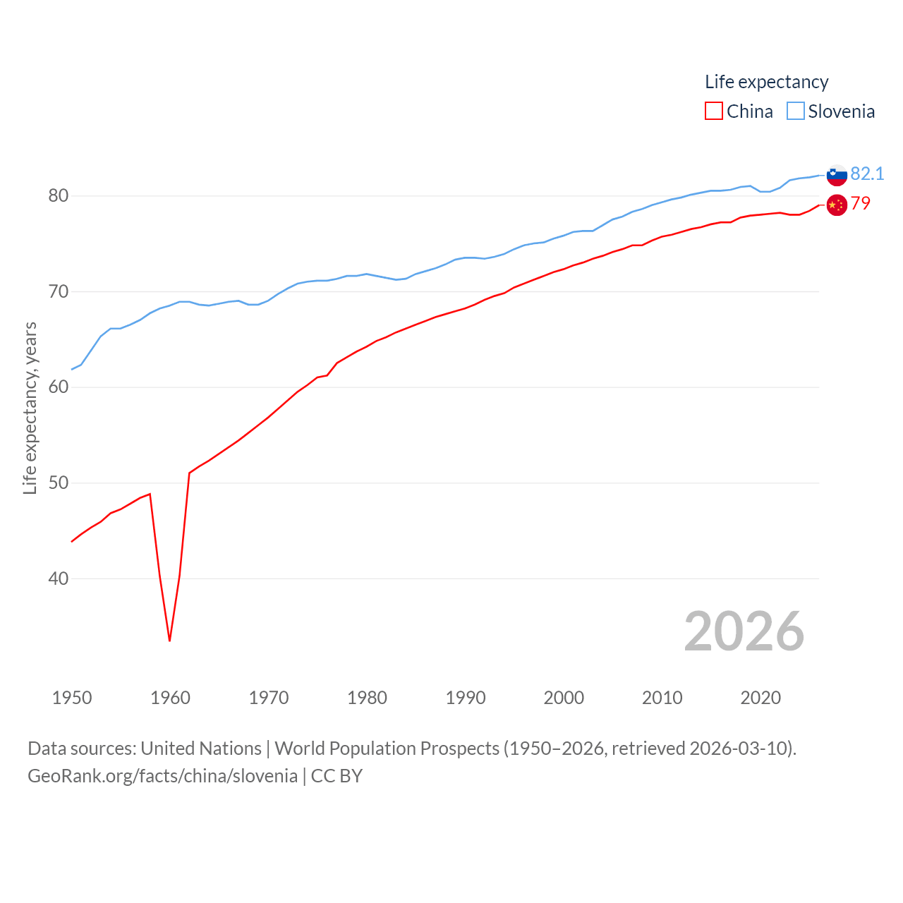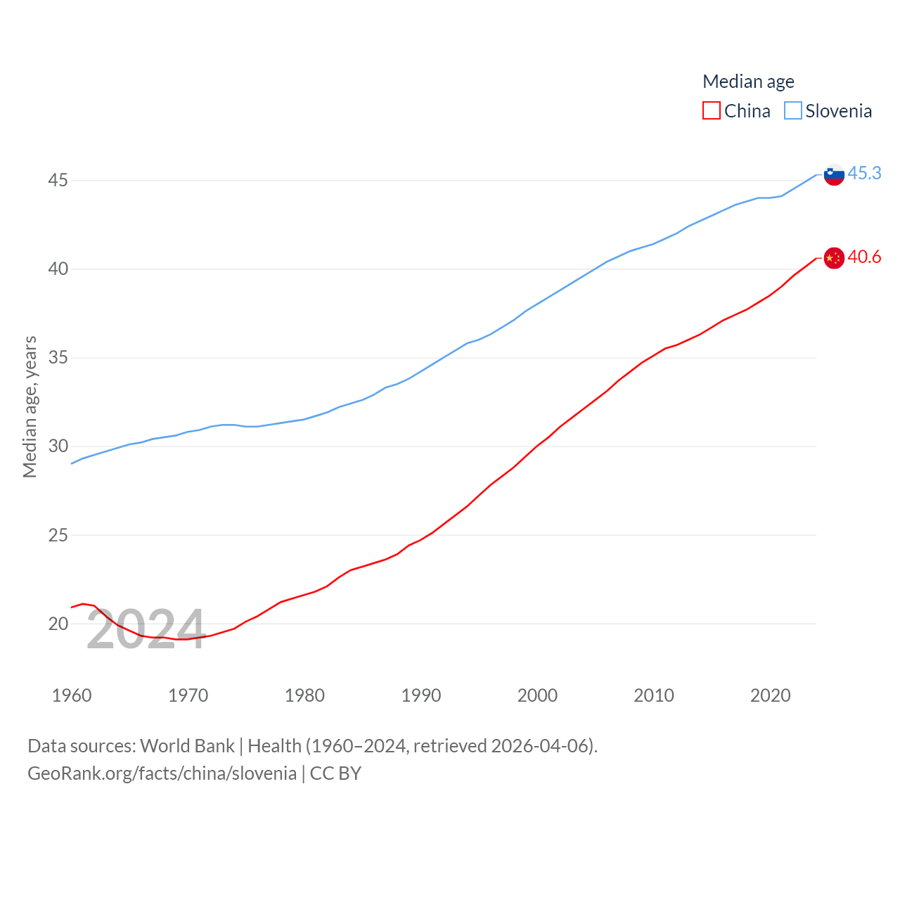 China has a population of 1.41B (ranked 2/197), compared with 2.13M in Slovenia (ranked 147/197). China's land area is 3,624,808 sq mi versus 7,774 sq mi for Slovenia (ranked 2nd vs. 151st).