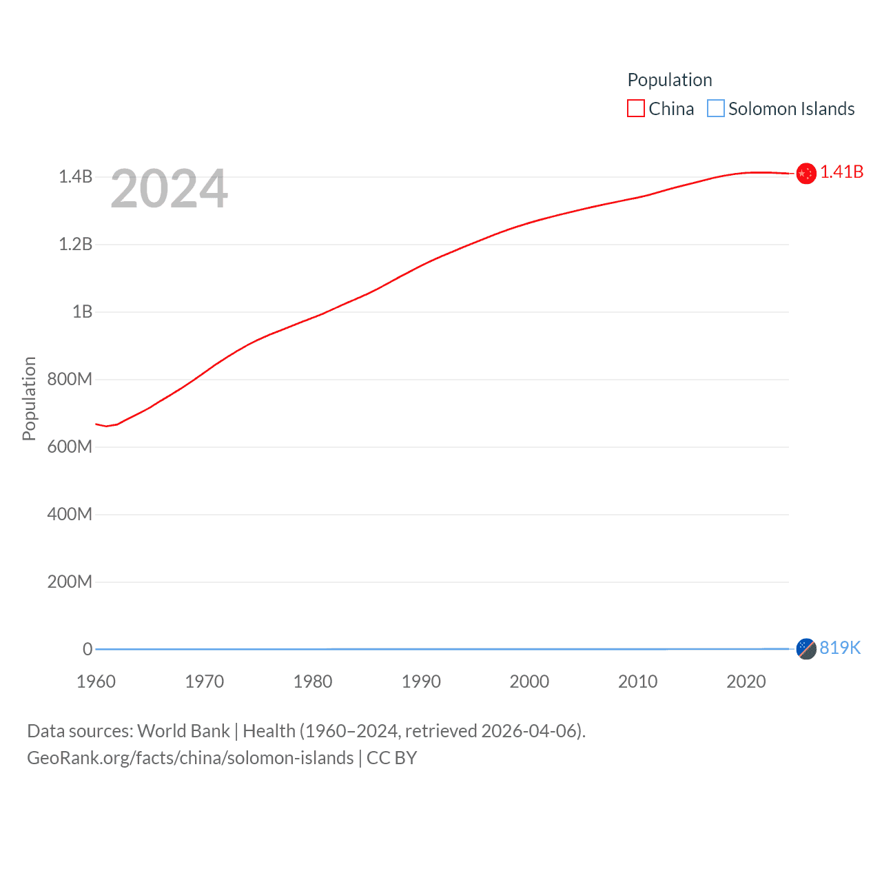 China has a population of 1.41B (ranked 2/197), compared with 819K in The Solomon Islands (ranked 162/197). China's land area is 3,624,808 sq mi versus 10,807 sq mi for The Solomon Islands (ranked 2nd vs. 141st).