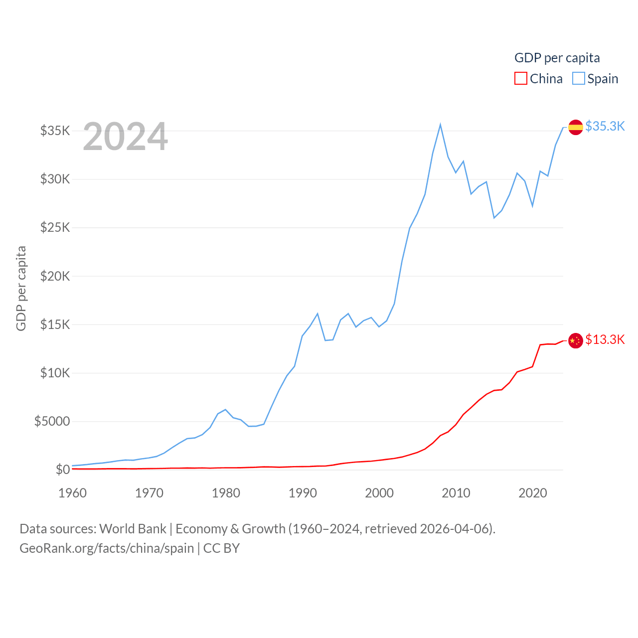 By GDP, China ranks 2/197 ($18.7T) and Spain ranks 15/197 ($1.73T). By GDP per capita, China ranks 76/197 ($13,303), while Spain ranks 32/197 ($35,327).