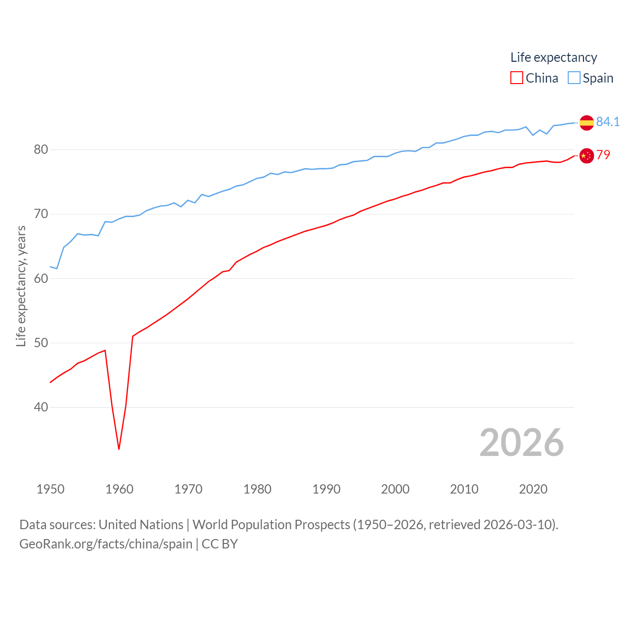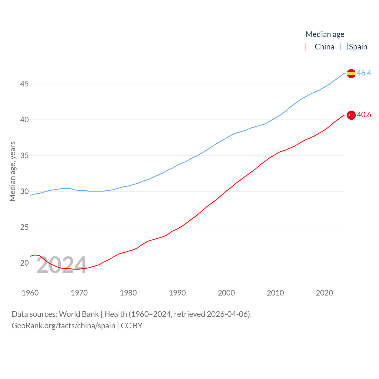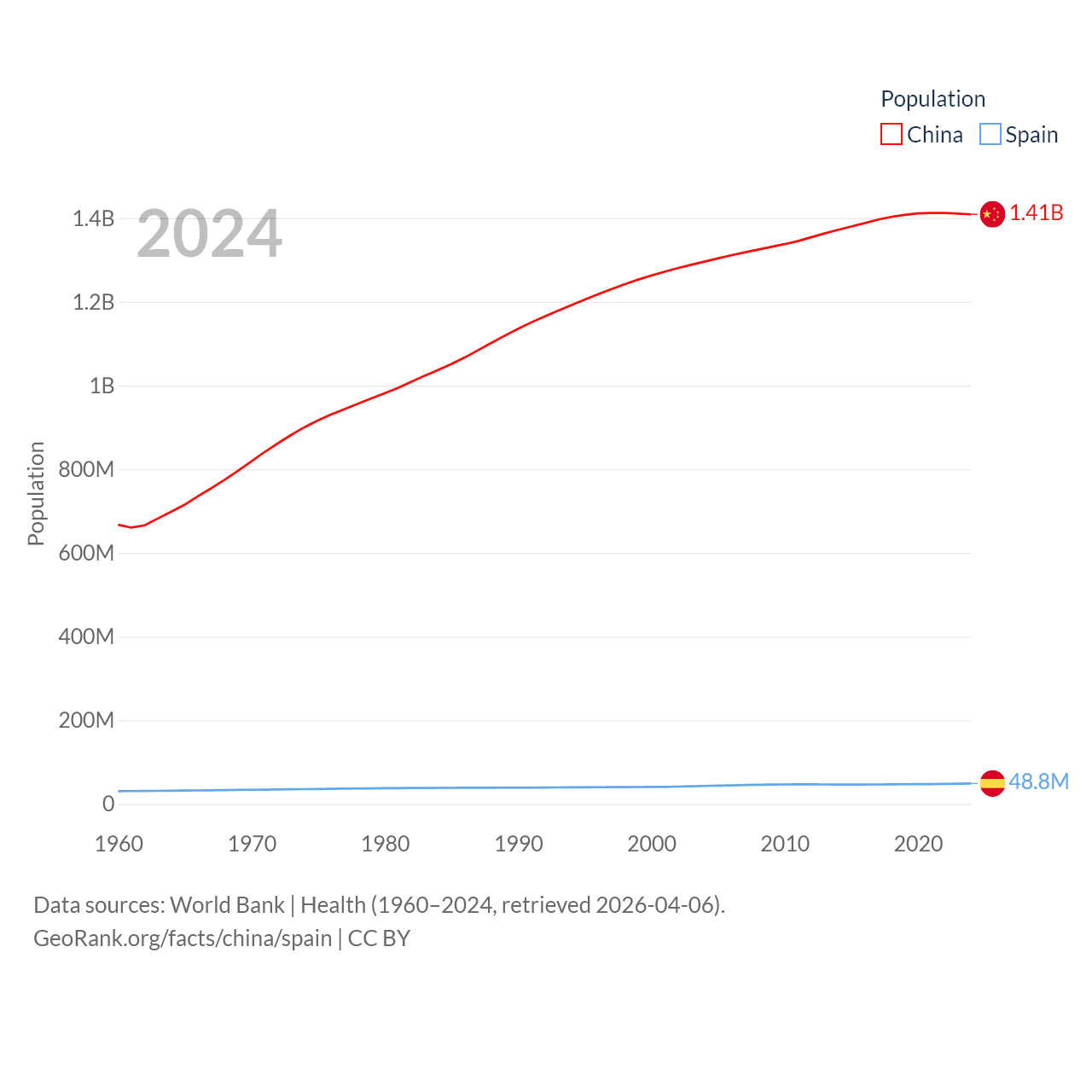 China has a population of 1.41B (ranked 2/197), compared with 48.8M in Spain (ranked 32/197). China's land area is 3,624,808 sq mi versus 192,934 sq mi for Spain (ranked 2nd vs. 51st).