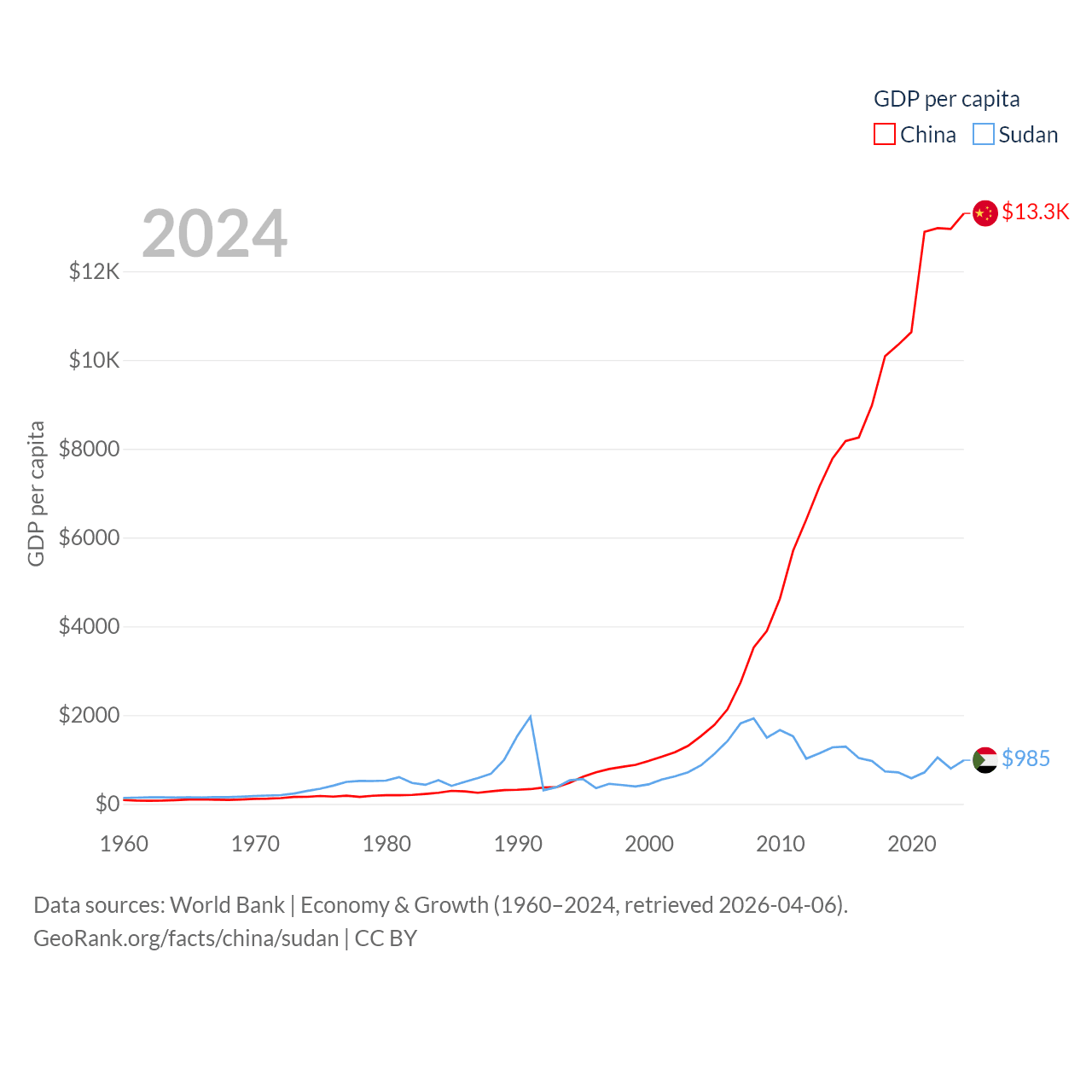 By GDP, China ranks 2/197 ($18.7T) and Sudan ranks 94/197 ($49.7B). By GDP per capita, China ranks 76/197 ($13,303), while Sudan ranks 179/197 ($985).