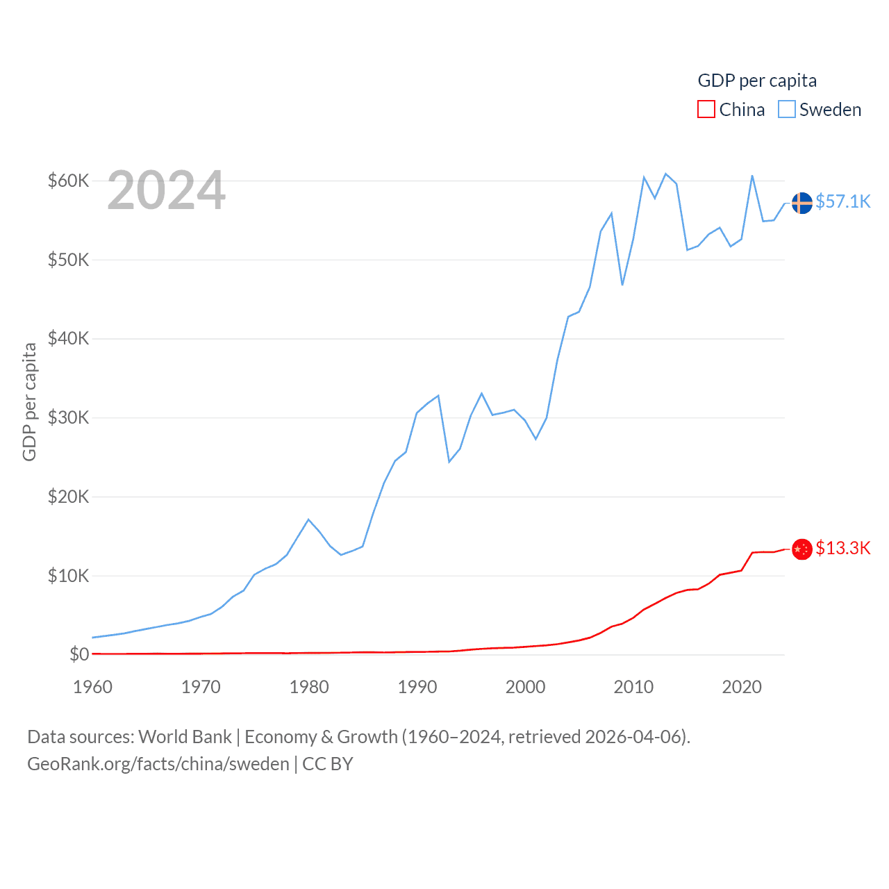 By GDP, China ranks 2/197 ($18.7T) and Sweden ranks 26/197 ($604B). By GDP per capita, China ranks 76/197 ($13,303), while Sweden ranks 17/197 ($57,117).