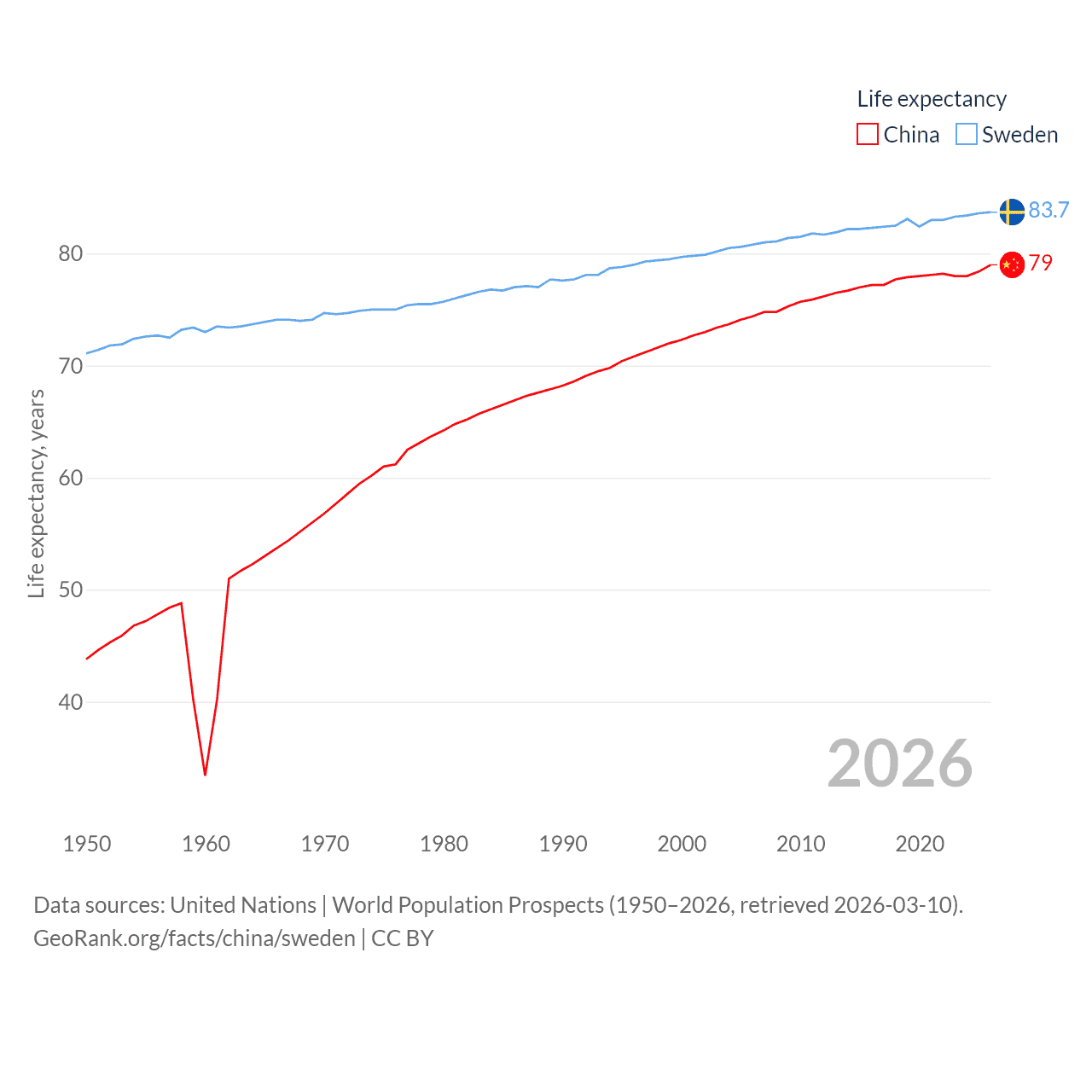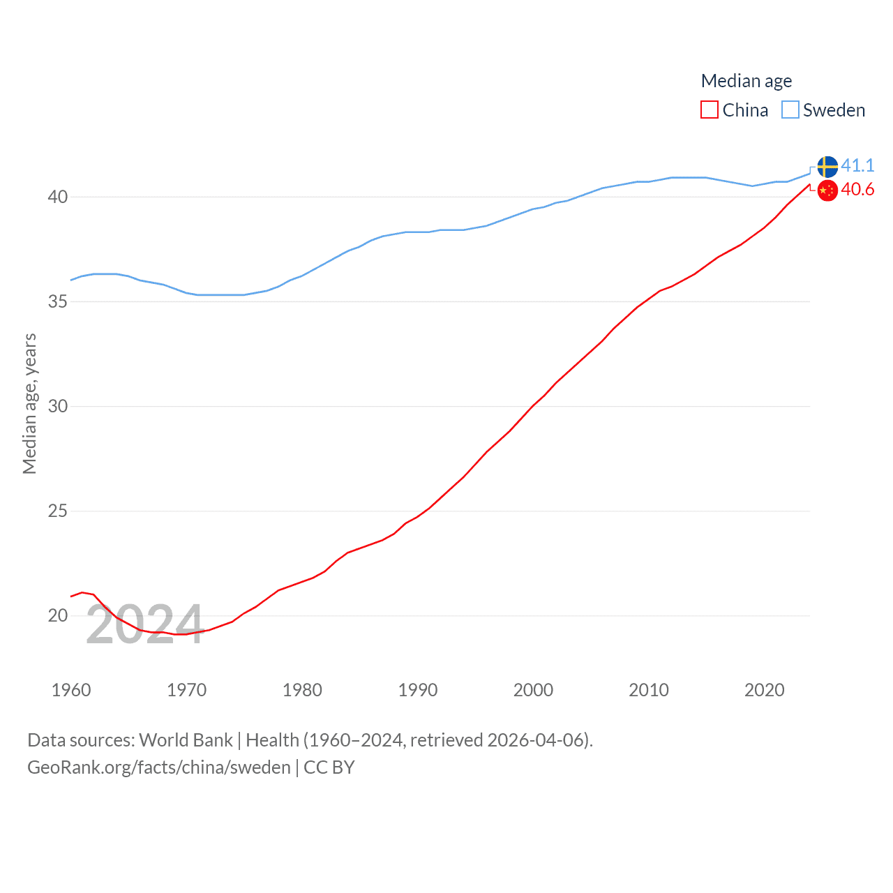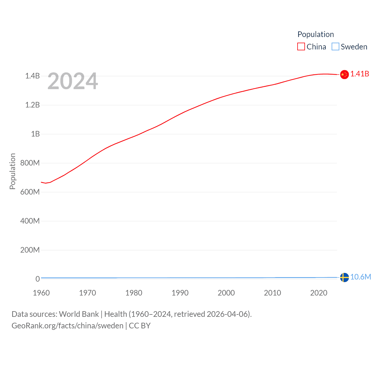 China has a population of 1.41B (ranked 2/197), compared with 10.6M in Sweden (ranked 93/197). China's land area is 3,624,808 sq mi versus 157,248 sq mi for Sweden (ranked 2nd vs. 58th).