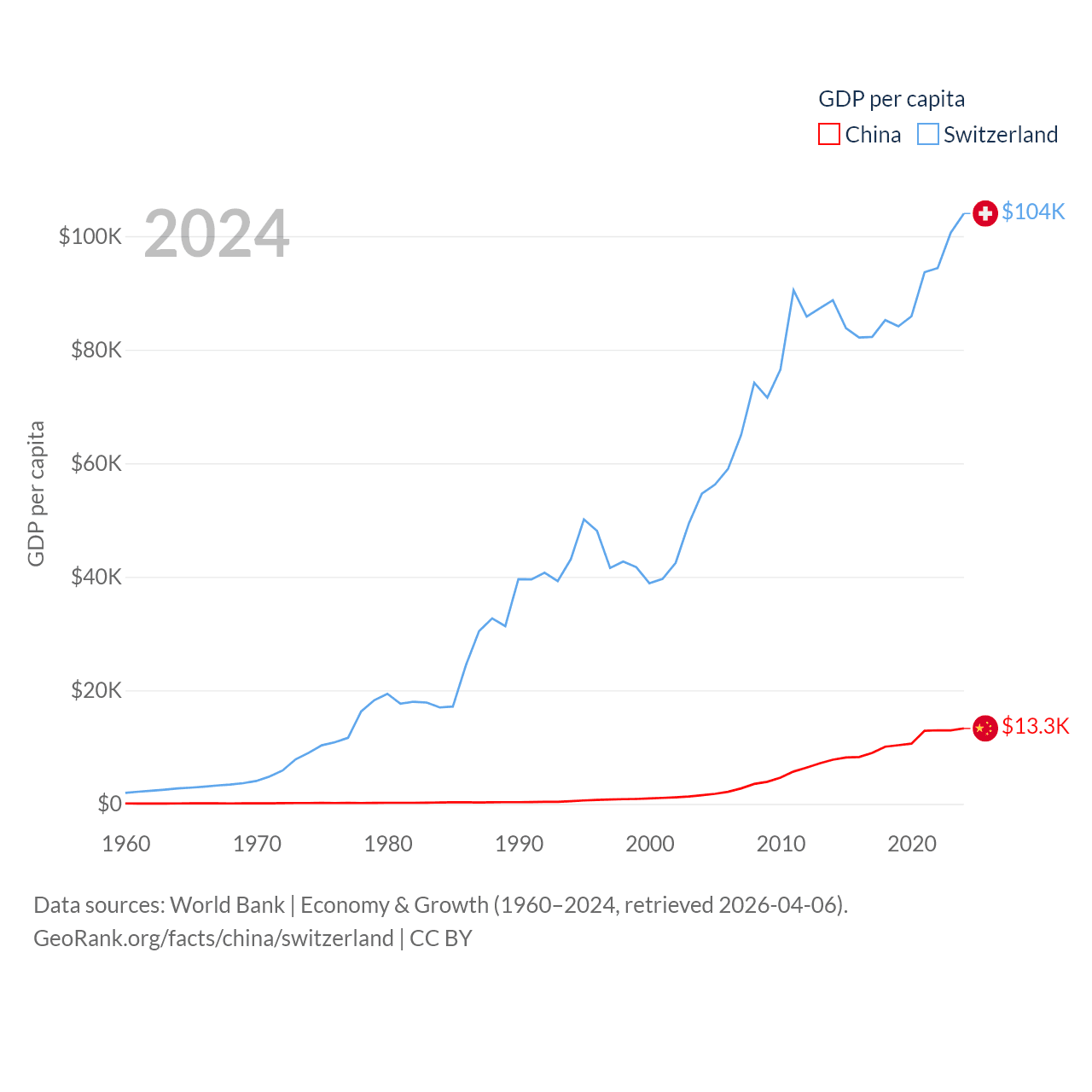 By GDP, China ranks 2/197 ($18.7T) and Switzerland ranks 20/197 ($937B). By GDP per capita, China ranks 76/197 ($13,303), while Switzerland ranks 5/197 ($103,998).