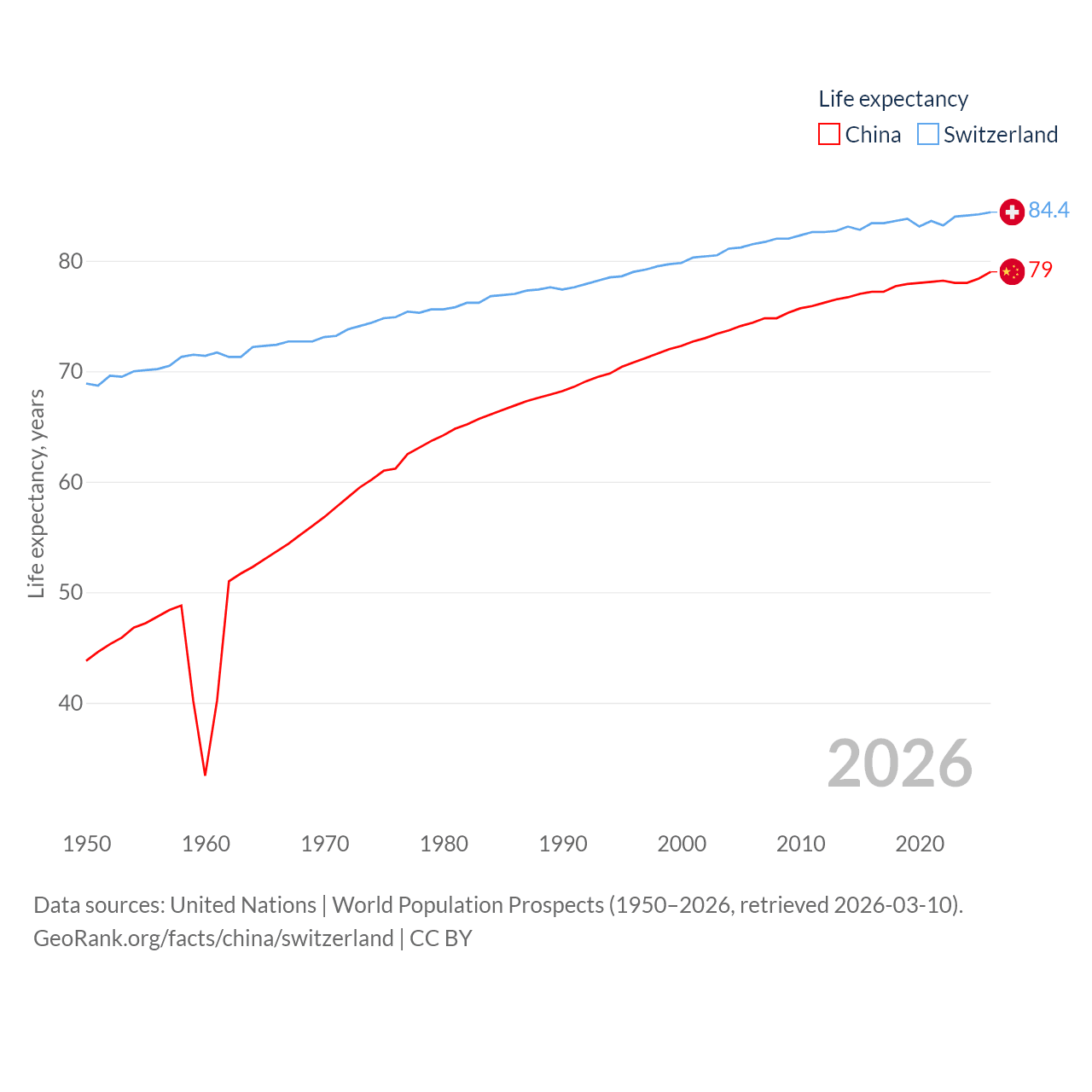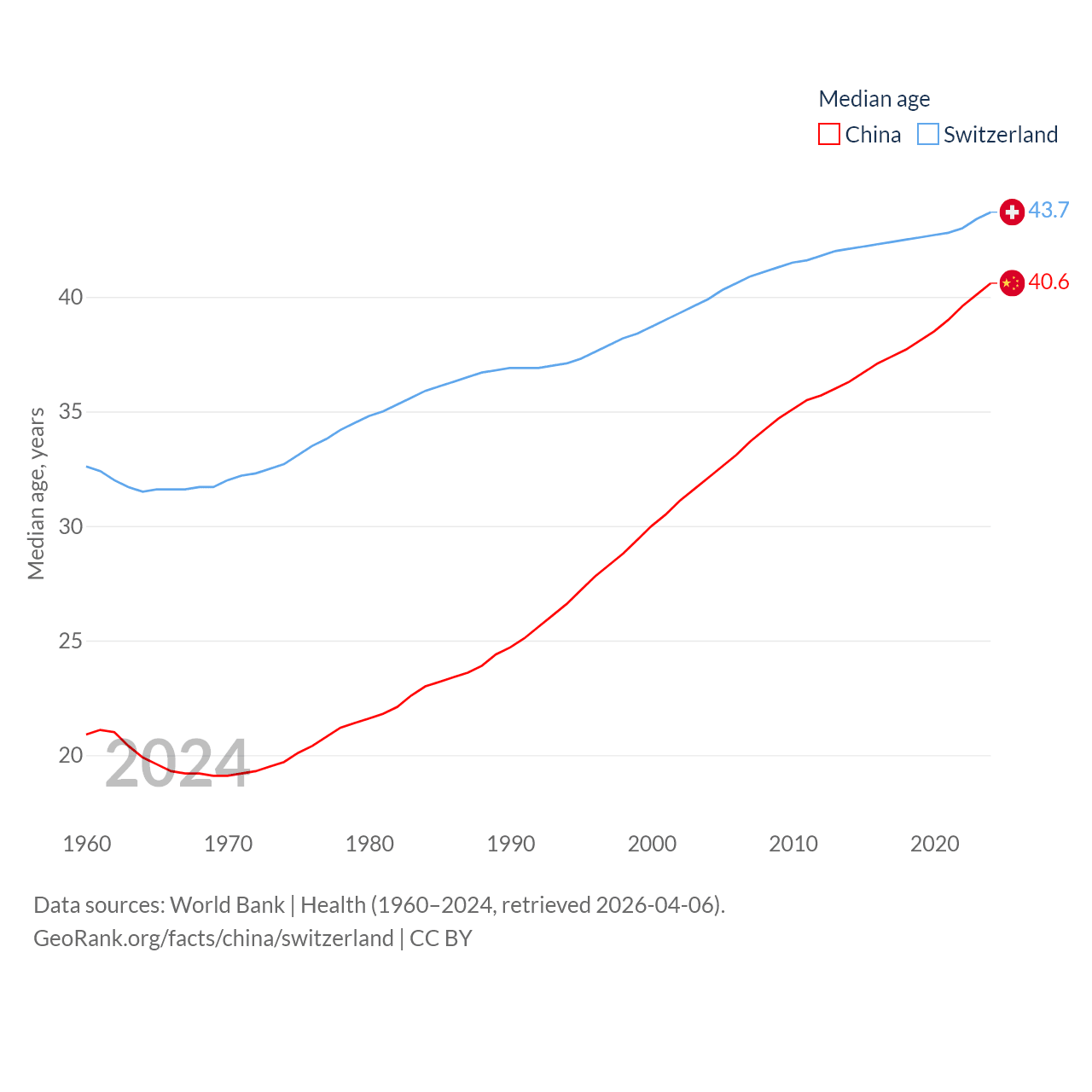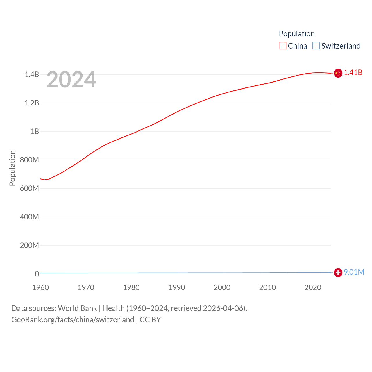 China has a population of 1.41B (ranked 2/197), compared with 9.01M in Switzerland (ranked 101/197). China's land area is 3,624,808 sq mi versus 15,255 sq mi for Switzerland (ranked 2nd vs. 131st).