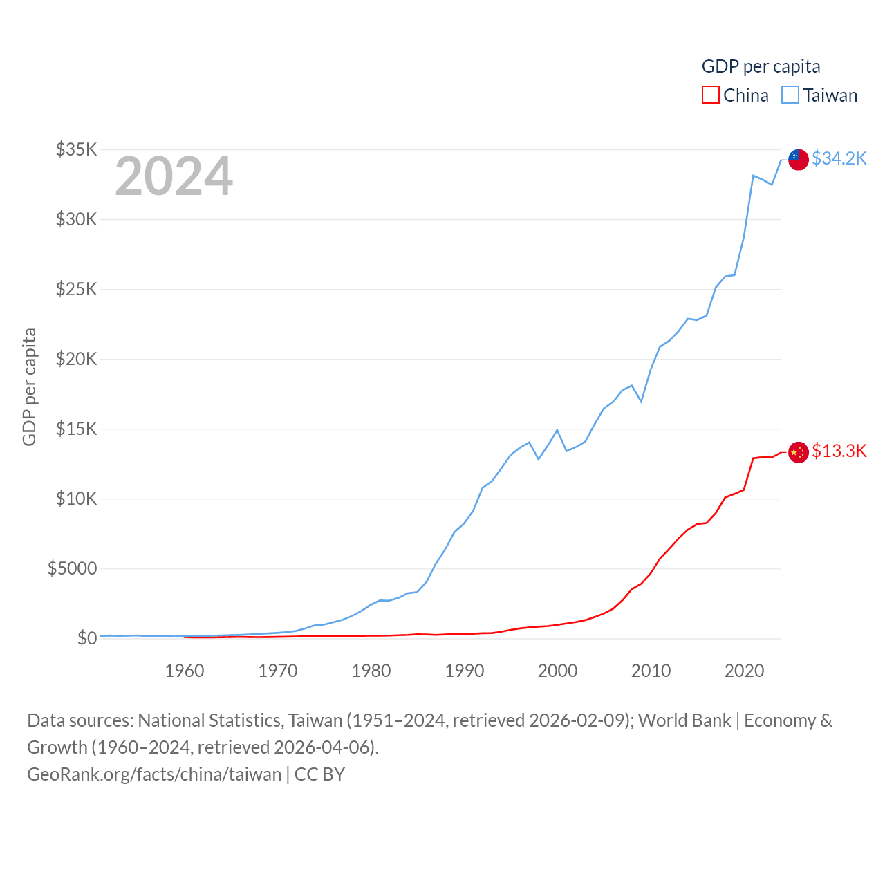 By GDP, China ranks 2/197 ($18.7T) and Taiwan ranks 22/197 ($802B). By GDP per capita, China ranks 76/197 ($13,303), while Taiwan ranks 35/197 ($34,238).