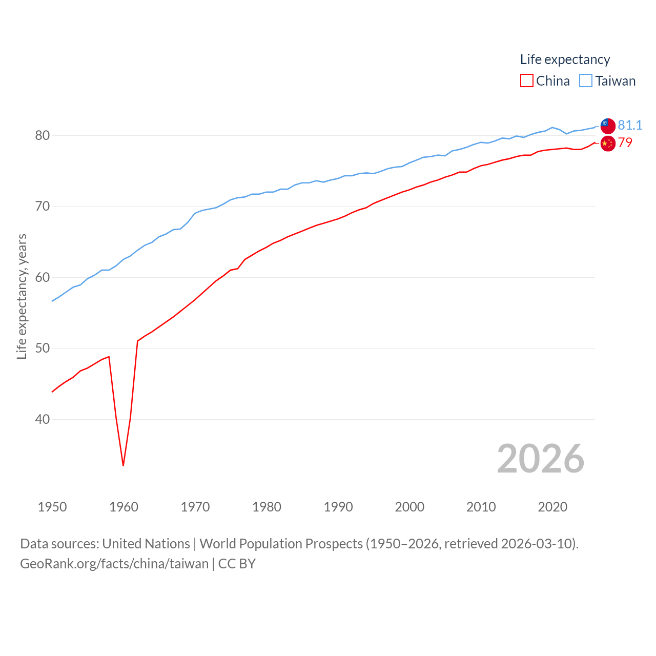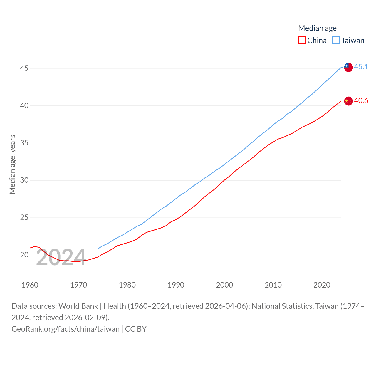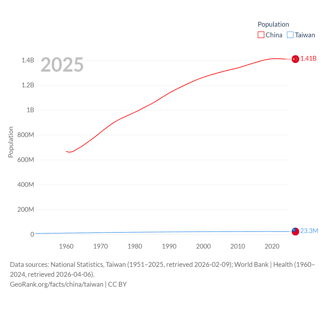 China has a population of 1.41B (ranked 2/197), compared with 23.3M in Taiwan (ranked 60/197). China's land area is 3,624,808 sq mi versus 13,976 sq mi for Taiwan (ranked 2nd vs. 133rd).