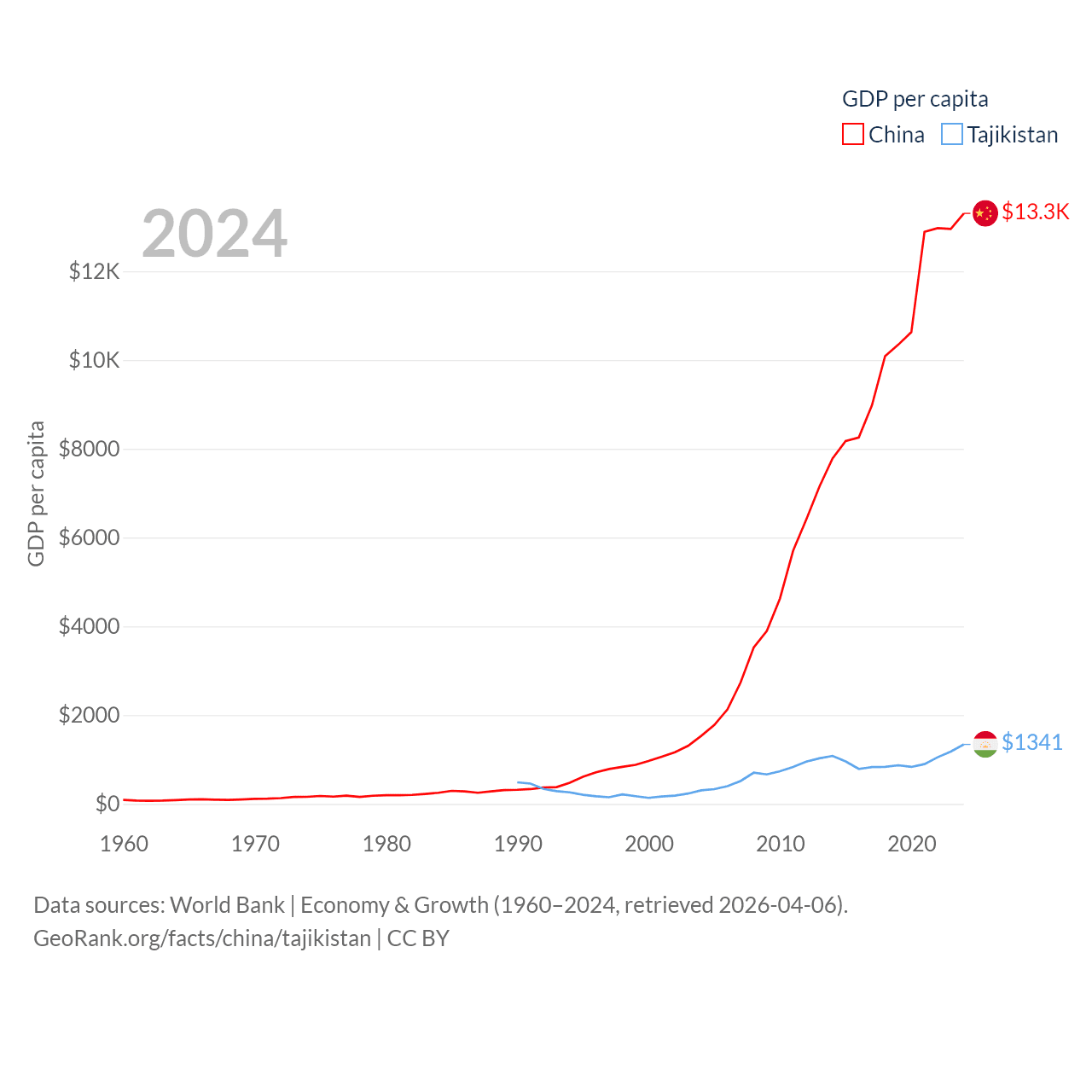 By GDP, China ranks 2/197 ($18.7T) and Tajikistan ranks 145/197 ($14.2B). By GDP per capita, China ranks 76/197 ($13,303), while Tajikistan ranks 166/197 ($1,341).