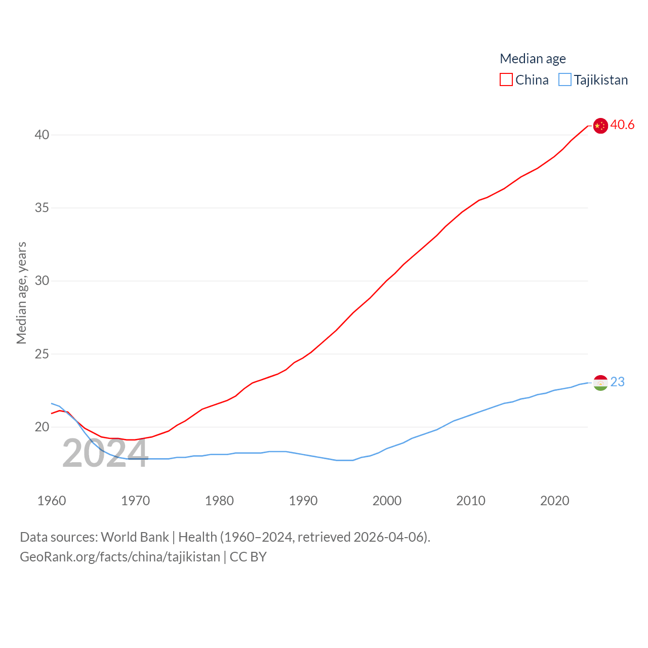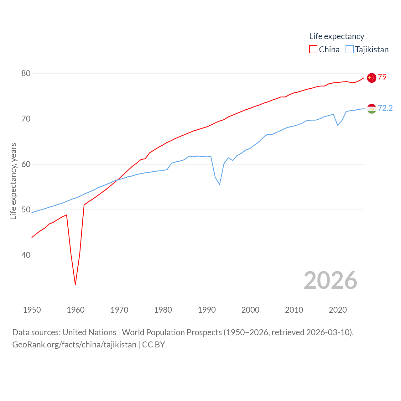 China has a population of 1.41B (ranked 2/197), compared with 10.6M in Tajikistan (ranked 91/197). China's land area is 3,624,808 sq mi versus 53,587 sq mi for Tajikistan (ranked 2nd vs. 93rd).