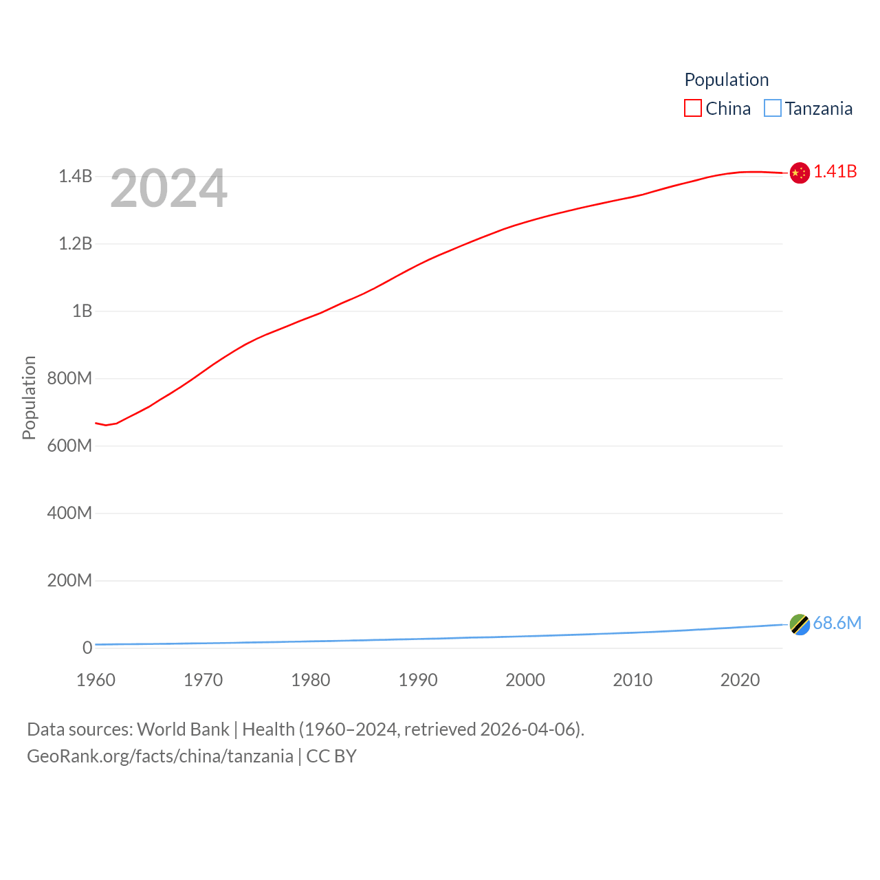 China has a population of 1.41B (ranked 2/197), compared with 68.6M in Tanzania (ranked 22/197). China's land area is 3,624,808 sq mi versus 342,009 sq mi for Tanzania (ranked 2nd vs. 31st).