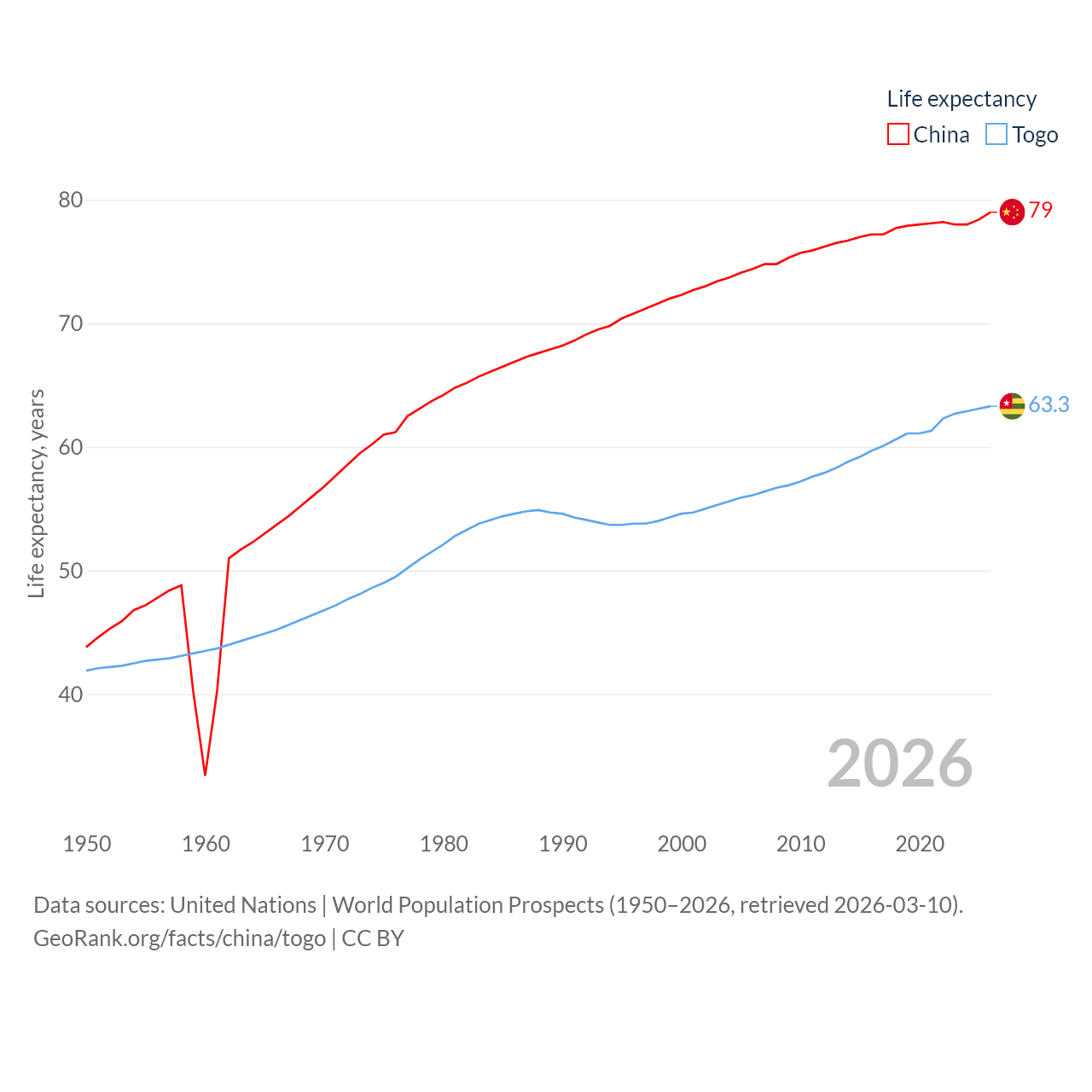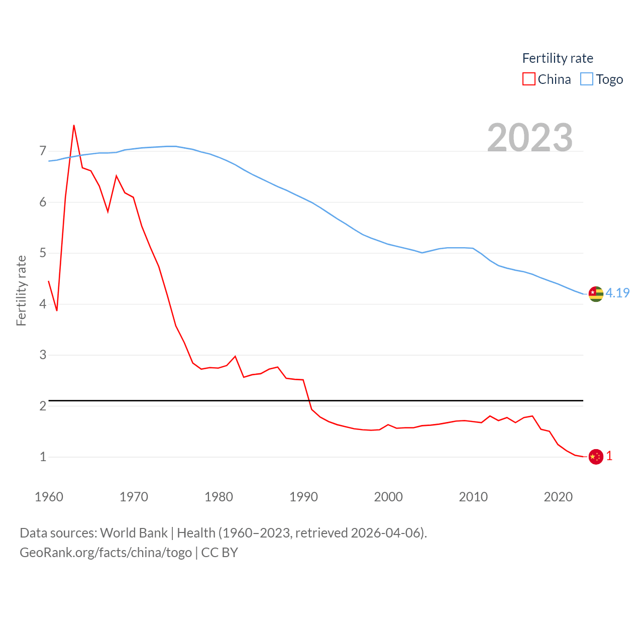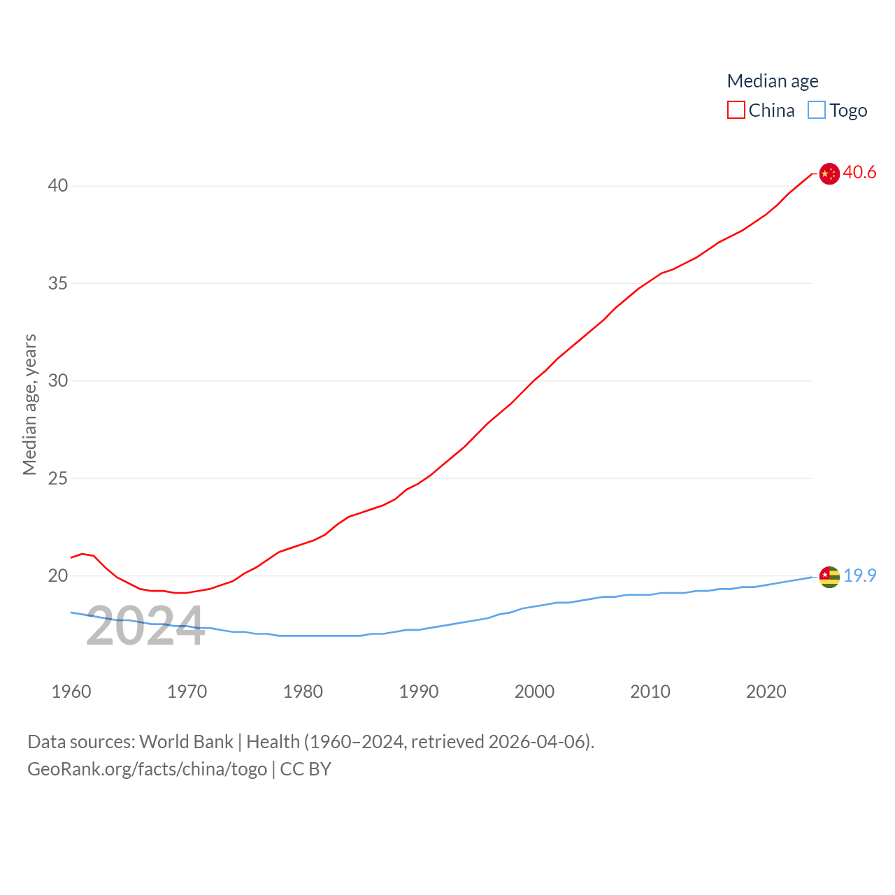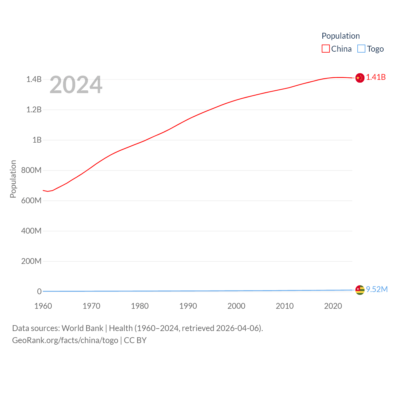 China has a population of 1.41B (ranked 2/197), compared with 9.52M in Togo (ranked 98/197). China's land area is 3,624,808 sq mi versus 21,000 sq mi for Togo (ranked 2nd vs. 124th).