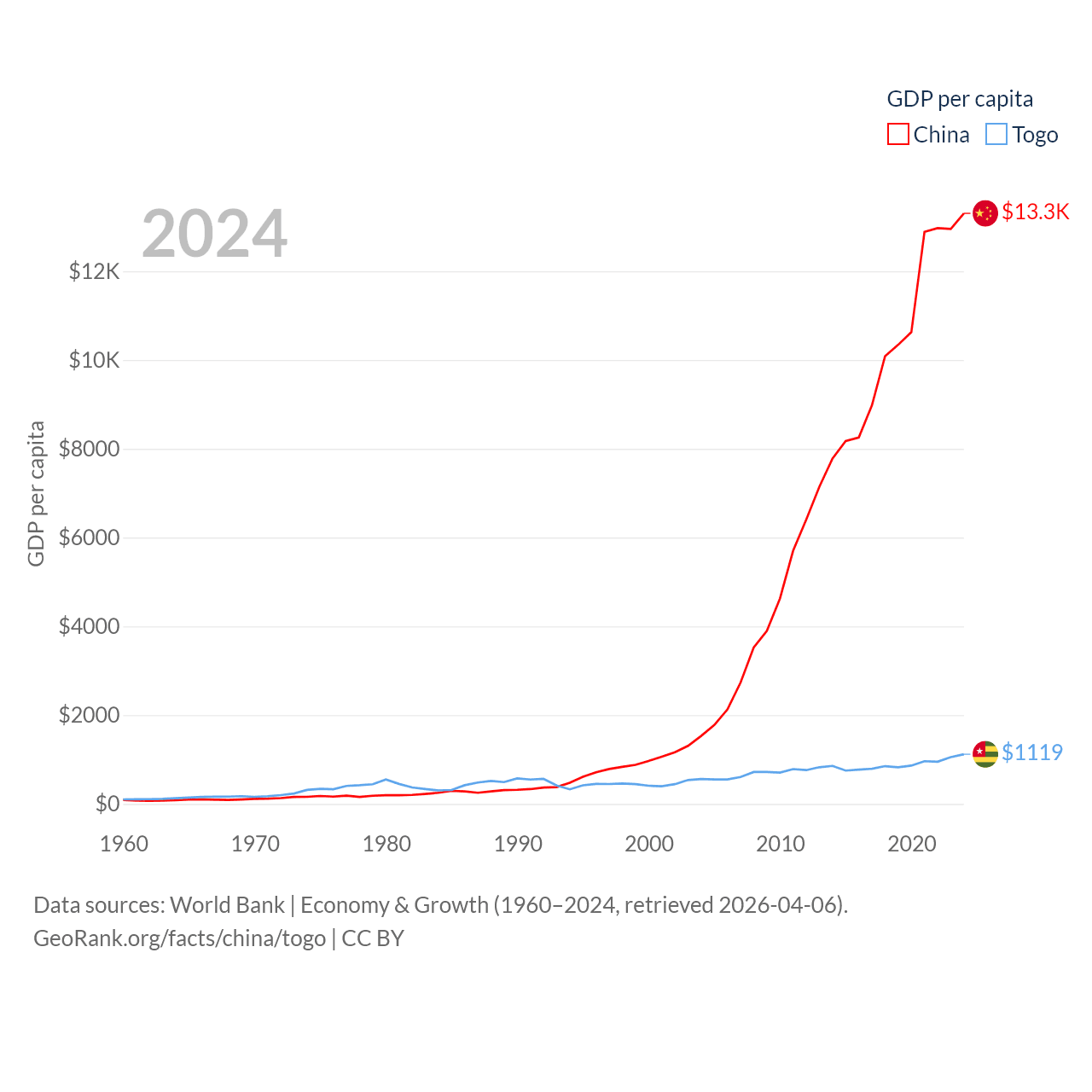By GDP, China ranks 2/197 ($18.7T) and Togo ranks 154/197 ($10.7B). By GDP per capita, China ranks 76/197 ($13,303), while Togo ranks 172/197 ($1,119).
