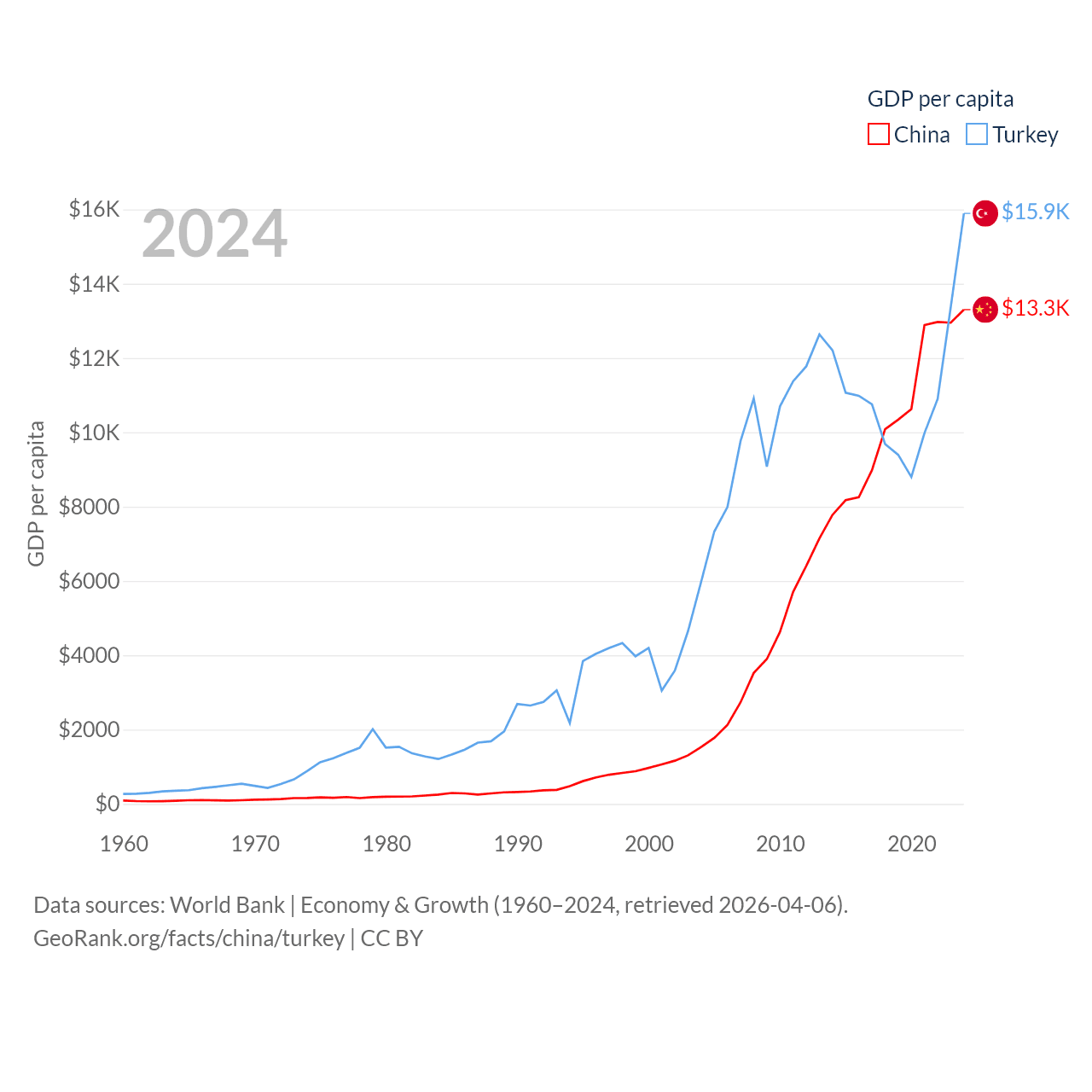 By GDP, China ranks 2/197 ($18.7T) and Turkey ranks 17/197 ($1.36T). By GDP per capita, China ranks 76/197 ($13,303), while Turkey ranks 66/197 ($15,893).