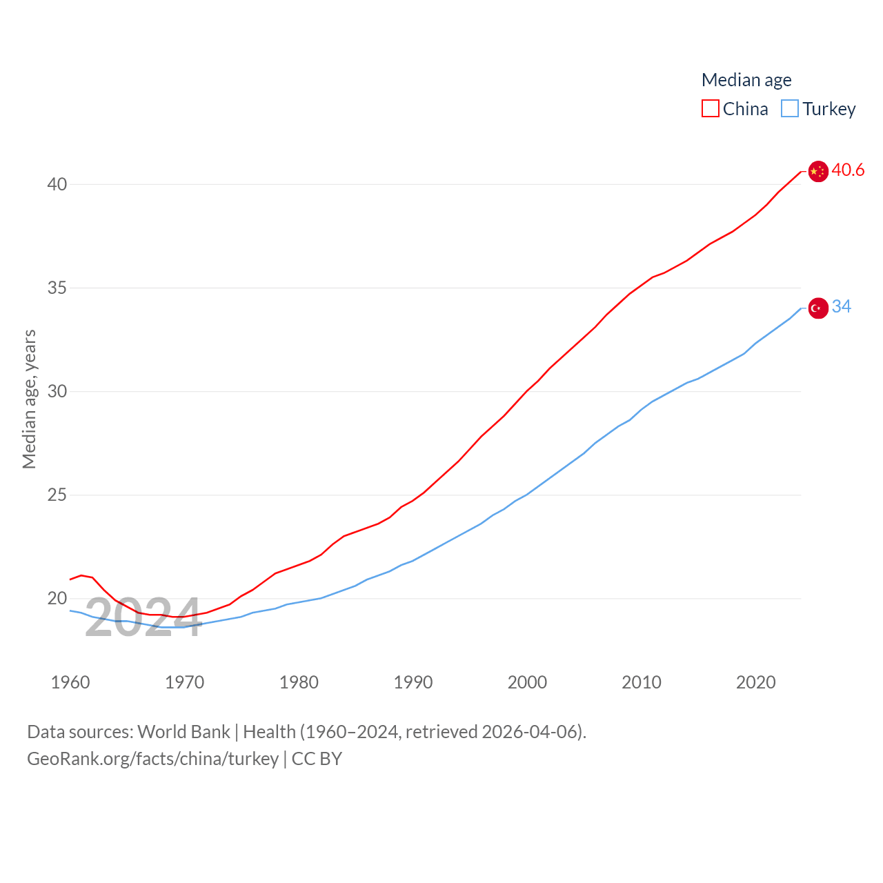 China has a population of 1.41B (ranked 2/197), compared with 85.5M in Turkey (ranked 18/197). China's land area is 3,624,808 sq mi versus 297,156 sq mi for Turkey (ranked 2nd vs. 36th).