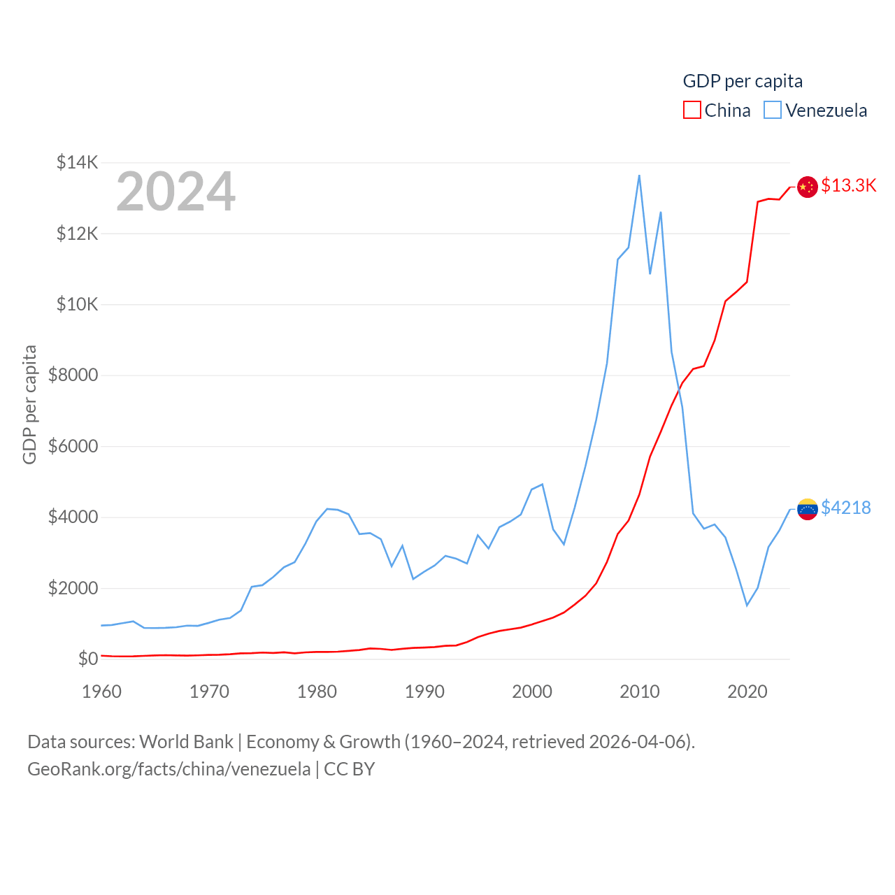 By GDP, China ranks 2/197 ($18.7T) and Venezuela ranks 65/197 ($120B). By GDP per capita, China ranks 76/197 ($13,303), while Venezuela ranks 128/197 ($4,218).