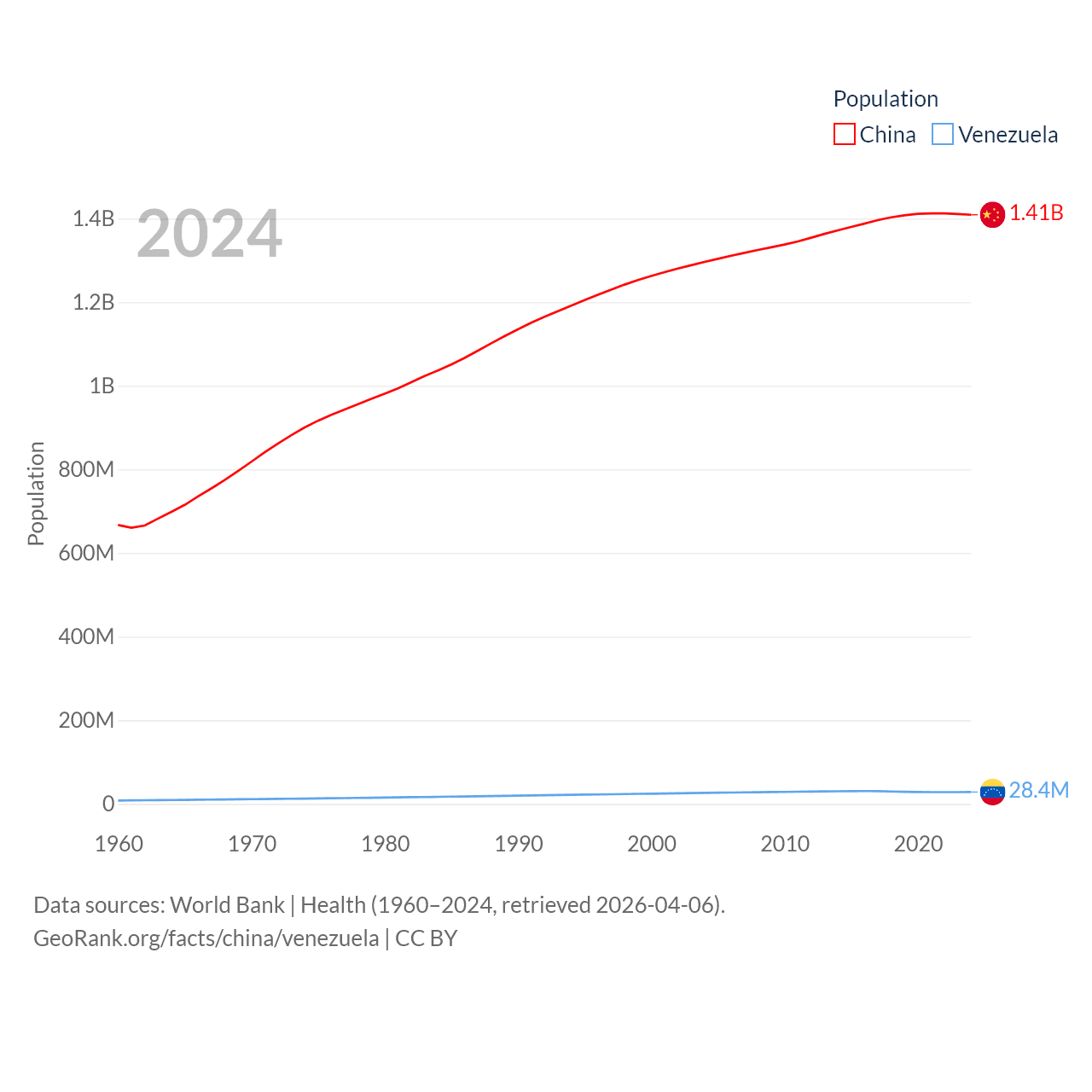 China has a population of 1.41B (ranked 2/197), compared with 28.4M in Venezuela (ranked 53/197). China's land area is 3,624,808 sq mi versus 340,561 sq mi for Venezuela (ranked 2nd vs. 32nd).
