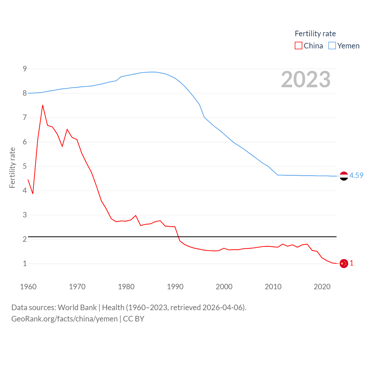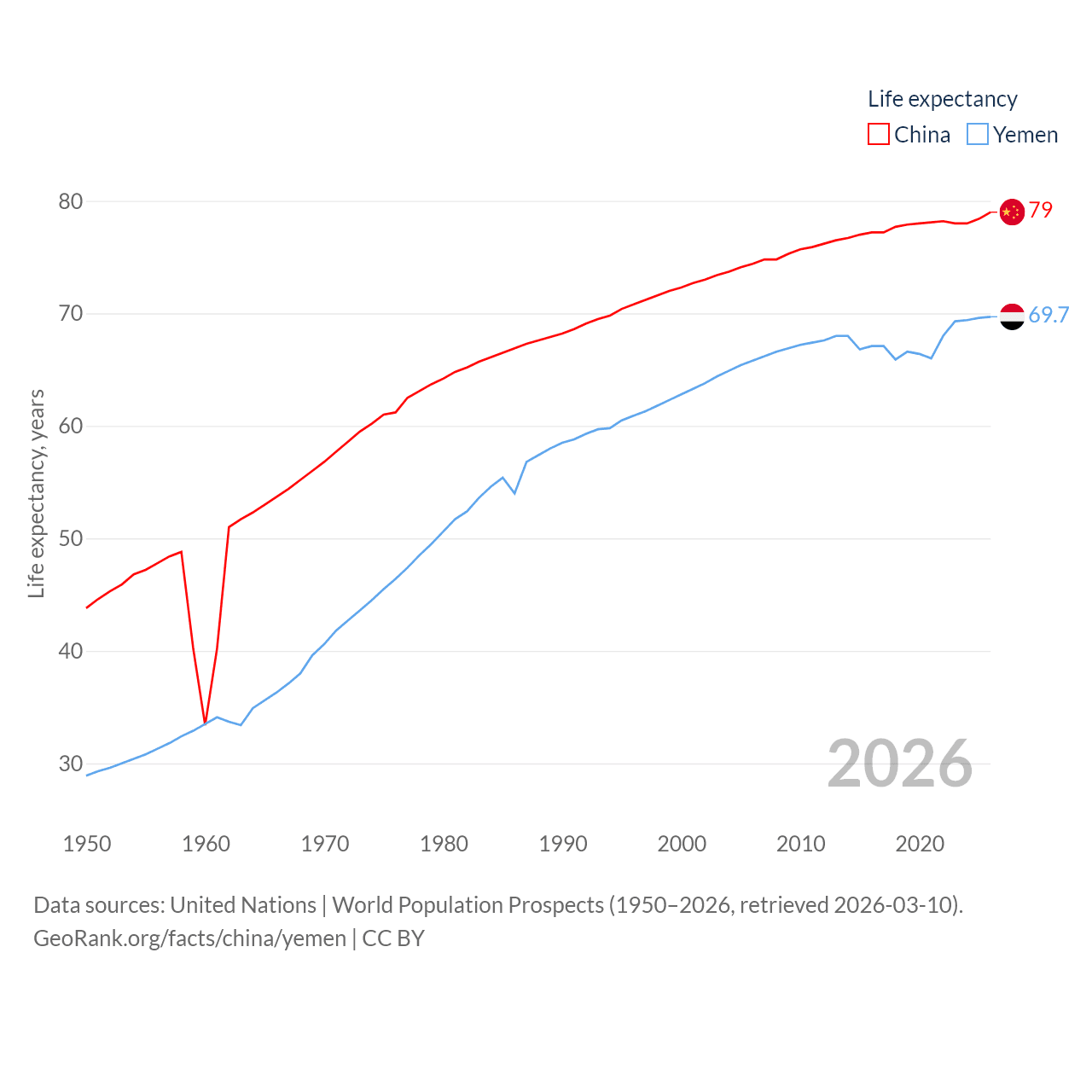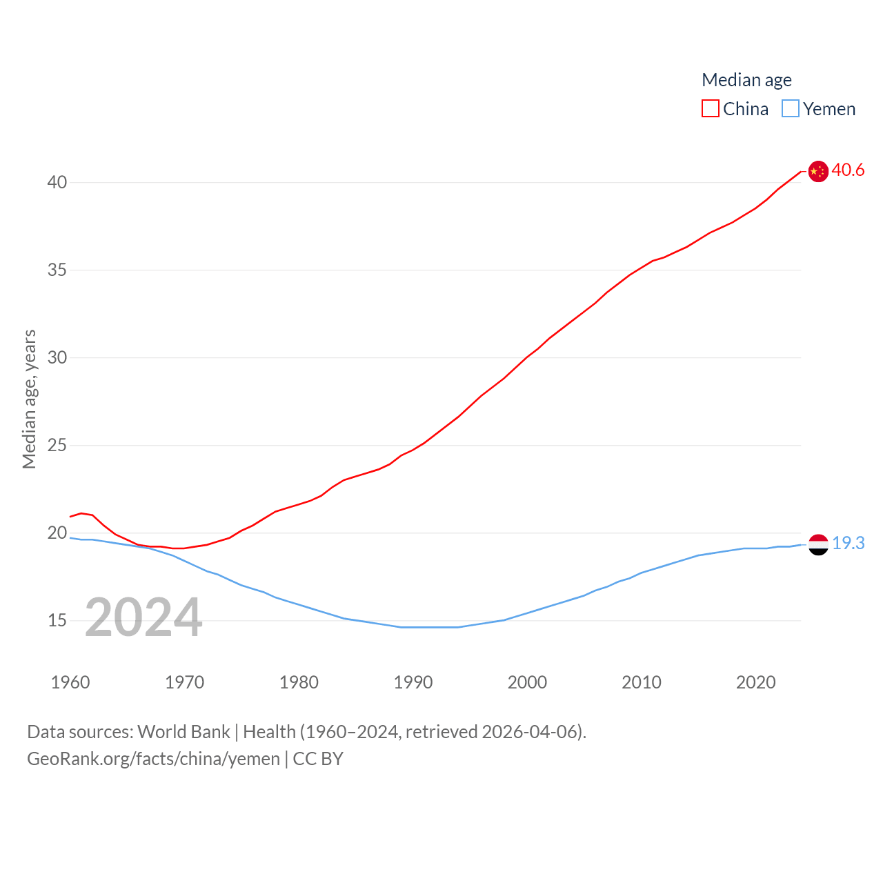China has a population of 1.41B (ranked 2/197), compared with 40.6M in Yemen (ranked 38/197). China's land area is 3,624,808 sq mi versus 203,850 sq mi for Yemen (ranked 2nd vs. 49th).