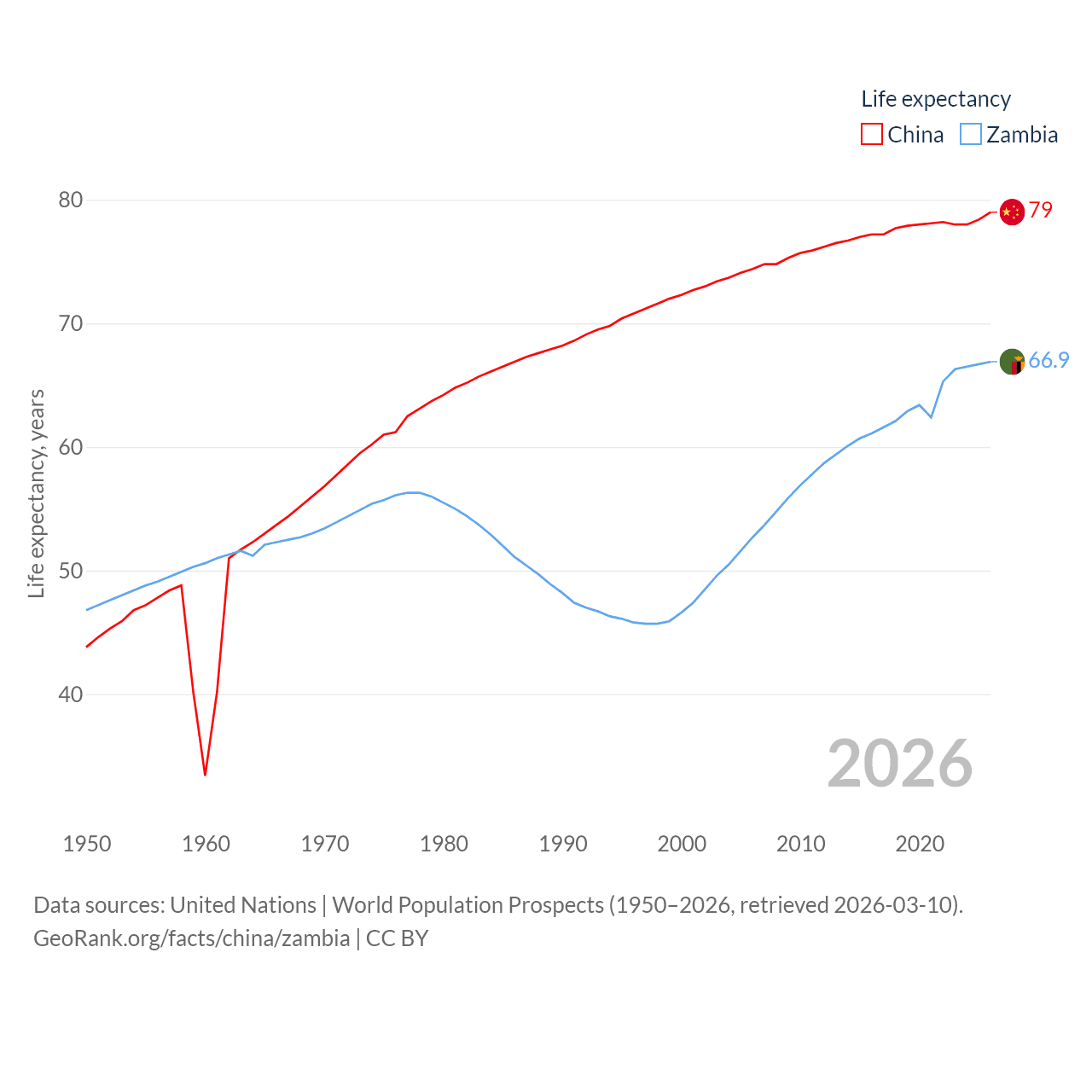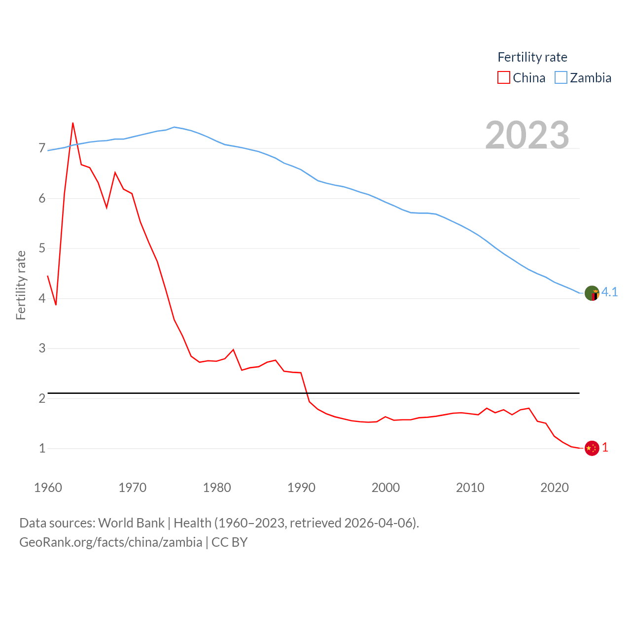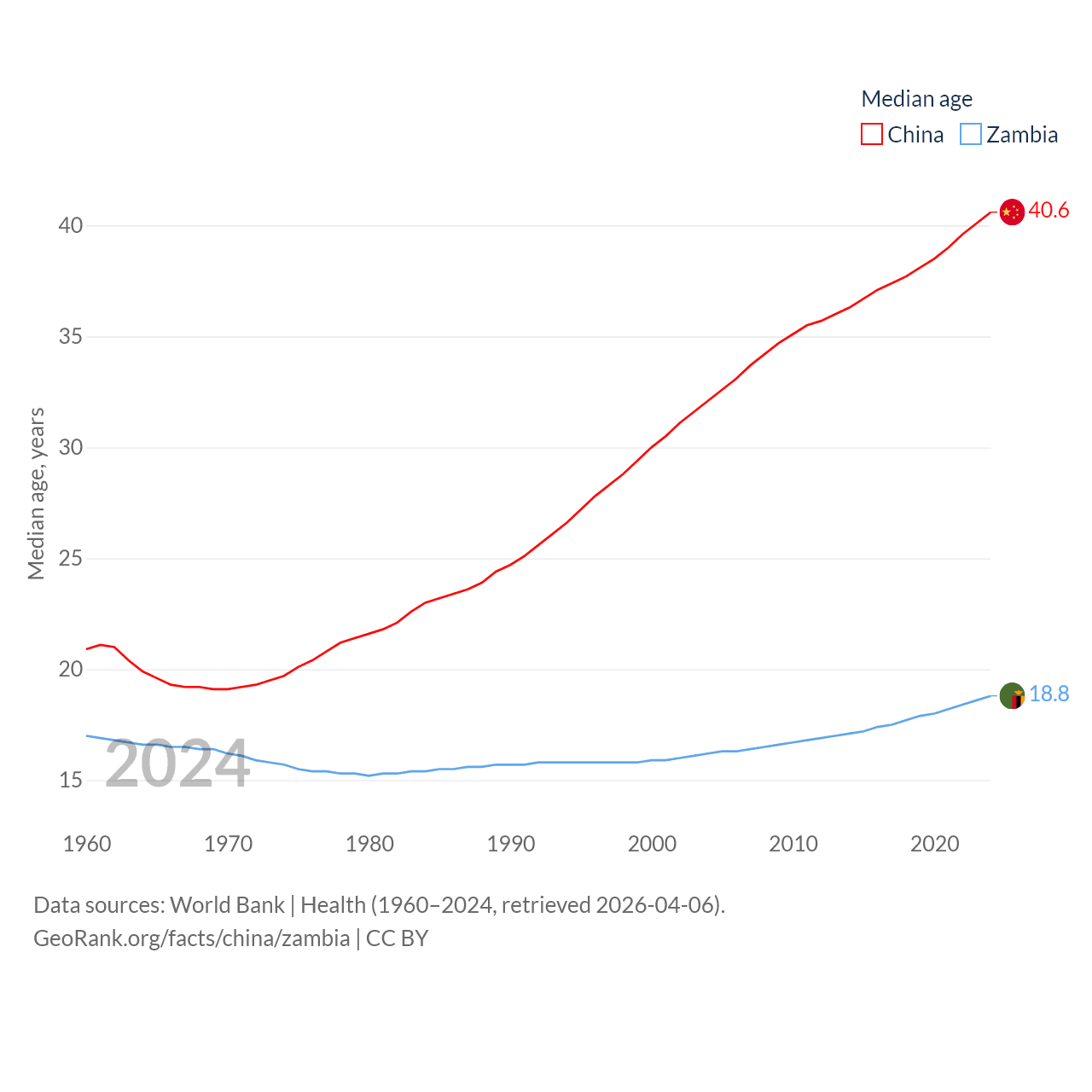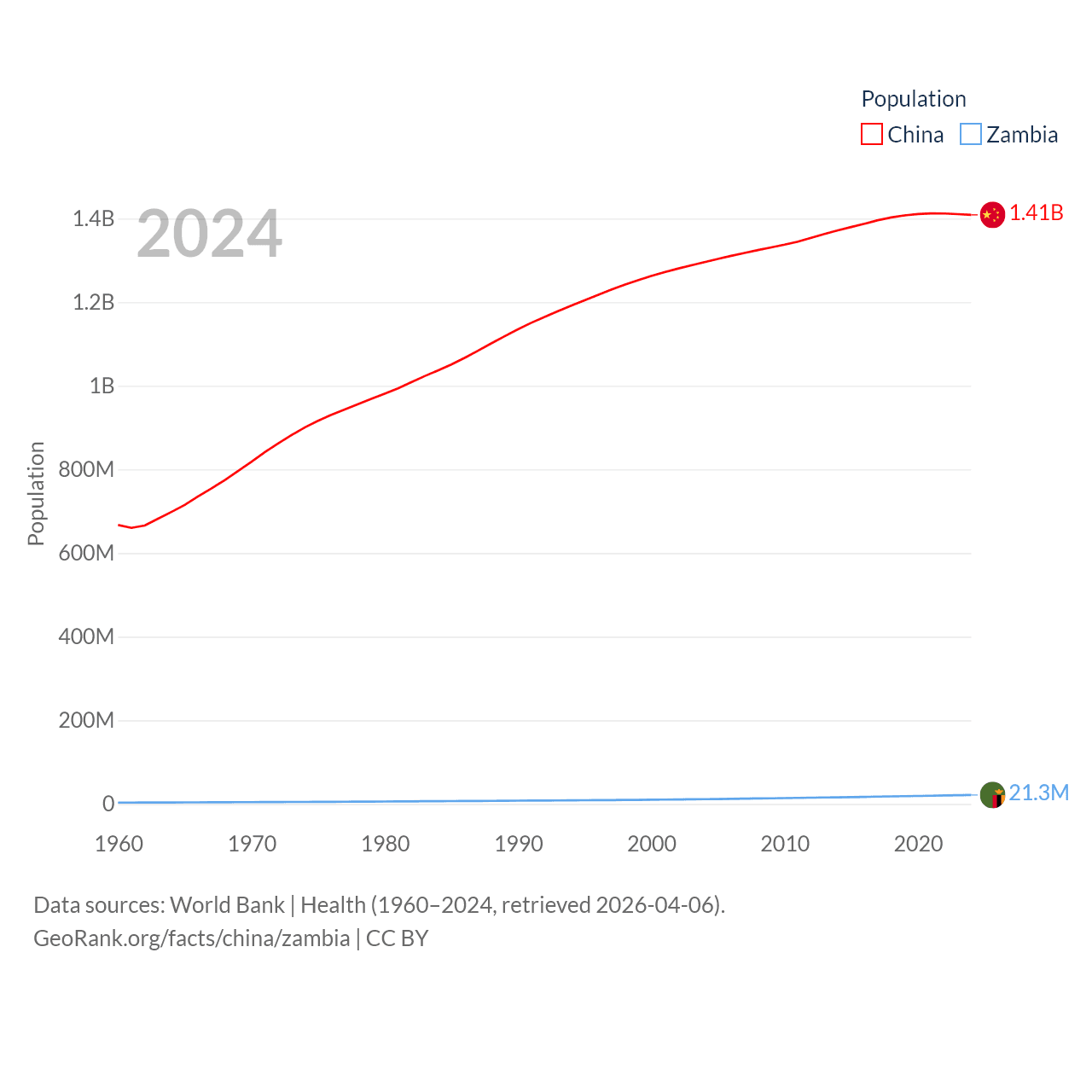 China has a population of 1.41B (ranked 2/197), compared with 21.3M in Zambia (ranked 63/197). China's land area is 3,624,808 sq mi versus 287,024 sq mi for Zambia (ranked 2nd vs. 37th).