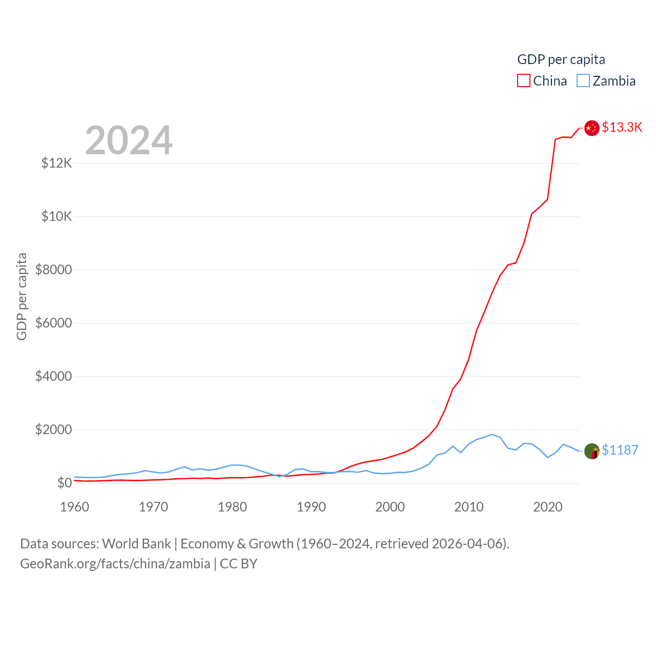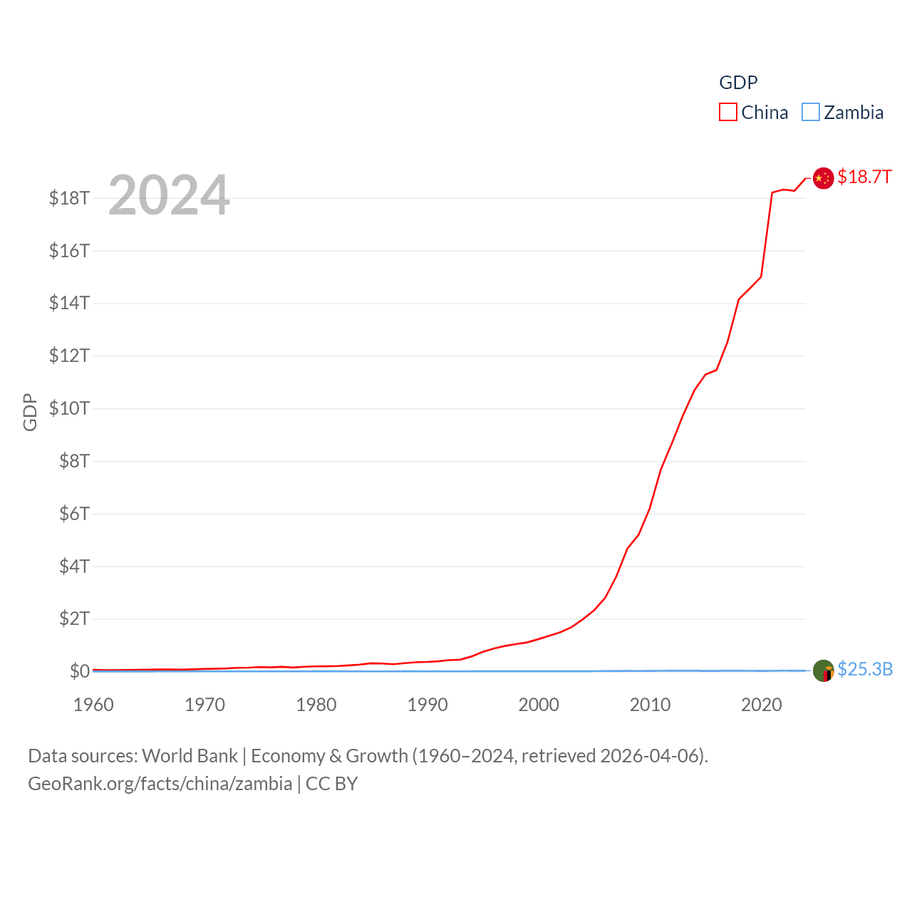 By GDP, China ranks 2/197 ($18.7T) and Zambia ranks 116/197 ($25.3B). By GDP per capita, China ranks 76/197 ($13,303), while Zambia ranks 169/197 ($1,187).