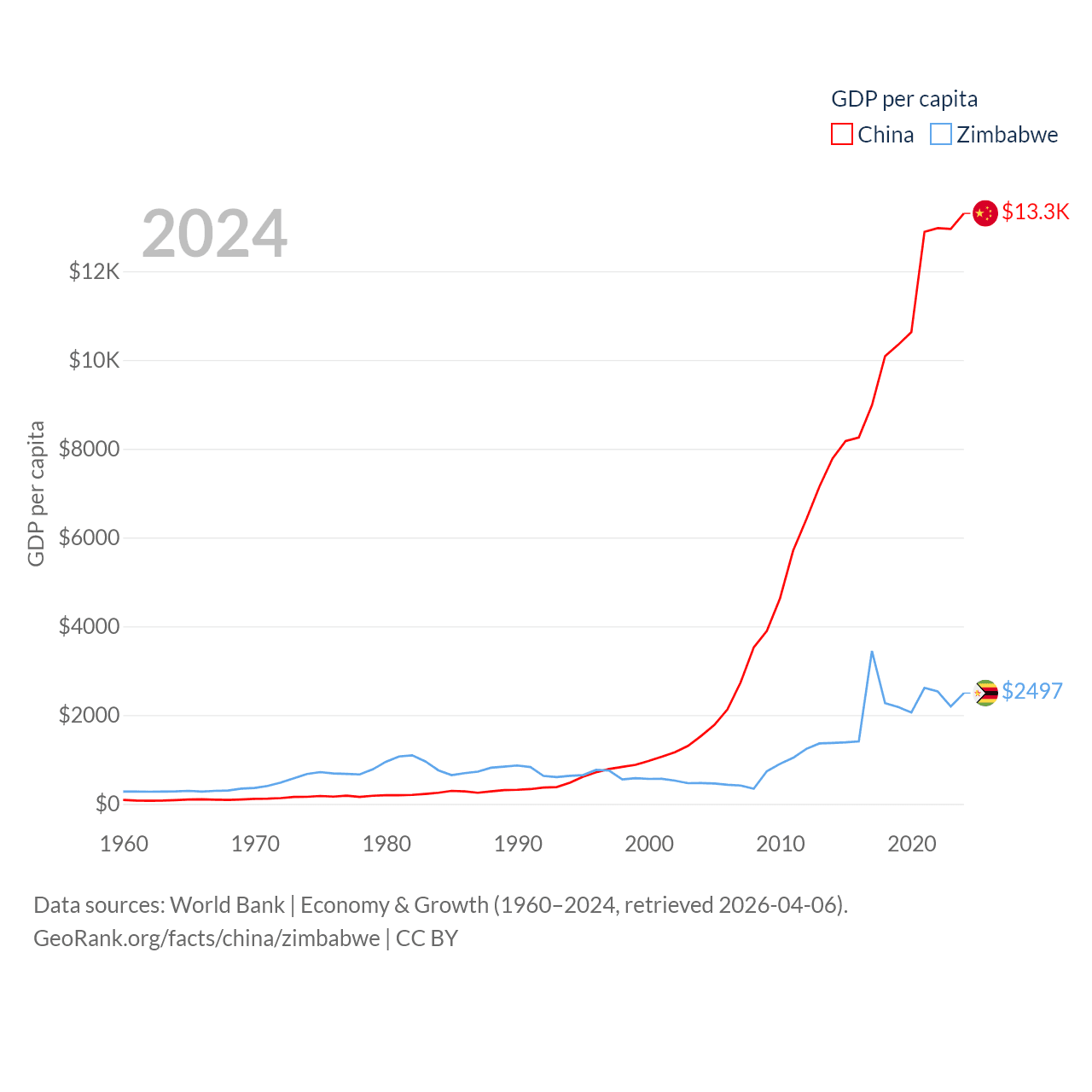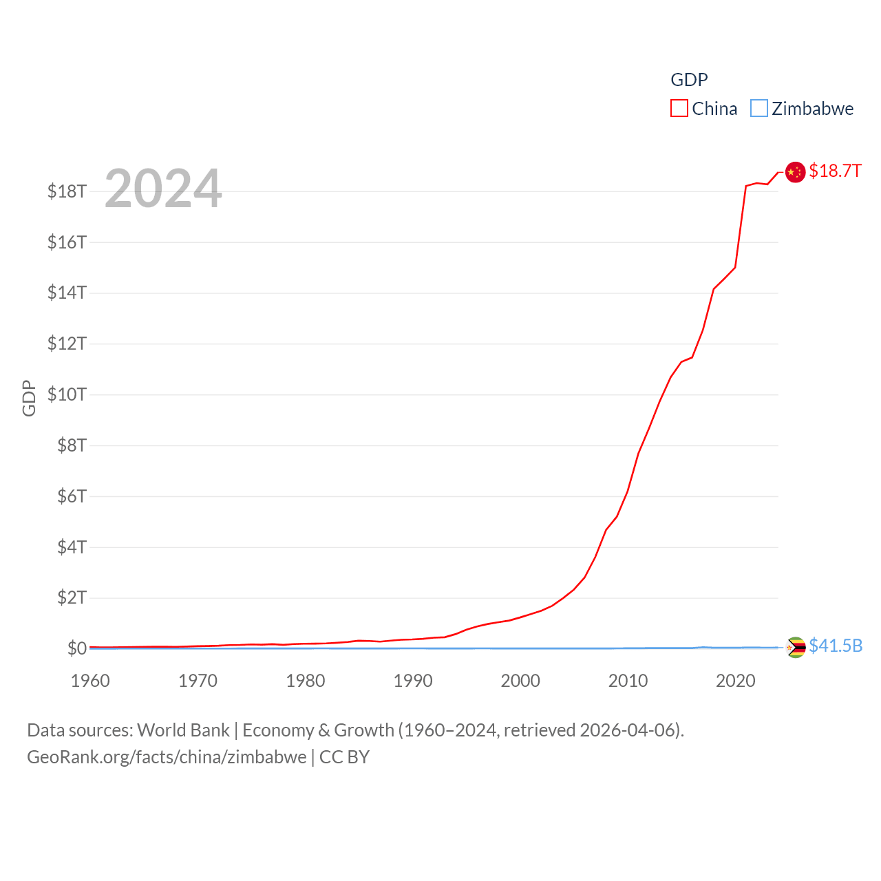 By GDP, China ranks 2/197 ($18.7T) and Zimbabwe ranks 102/197 ($41.5B). By GDP per capita, China ranks 76/197 ($13,303), while Zimbabwe ranks 148/197 ($2,497).