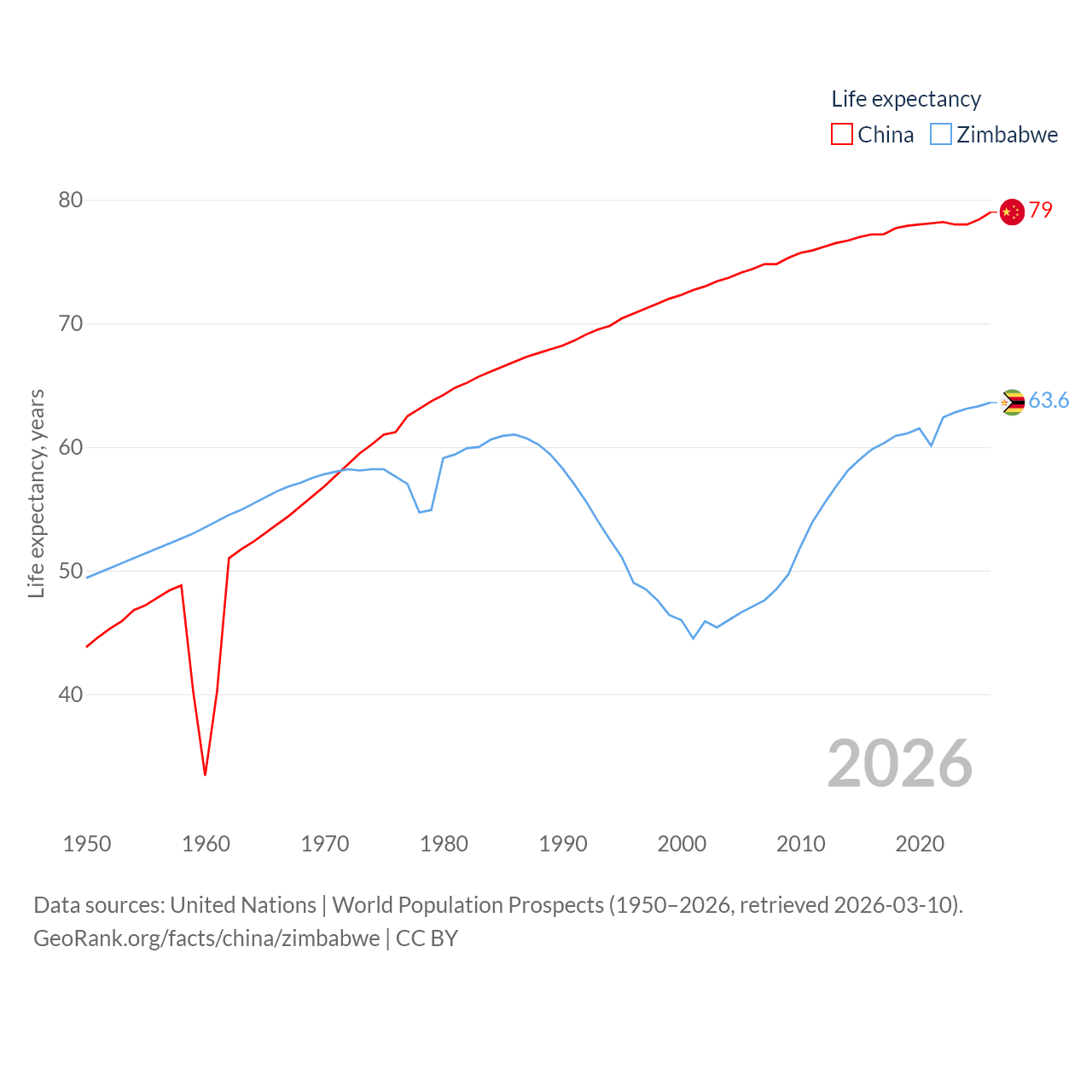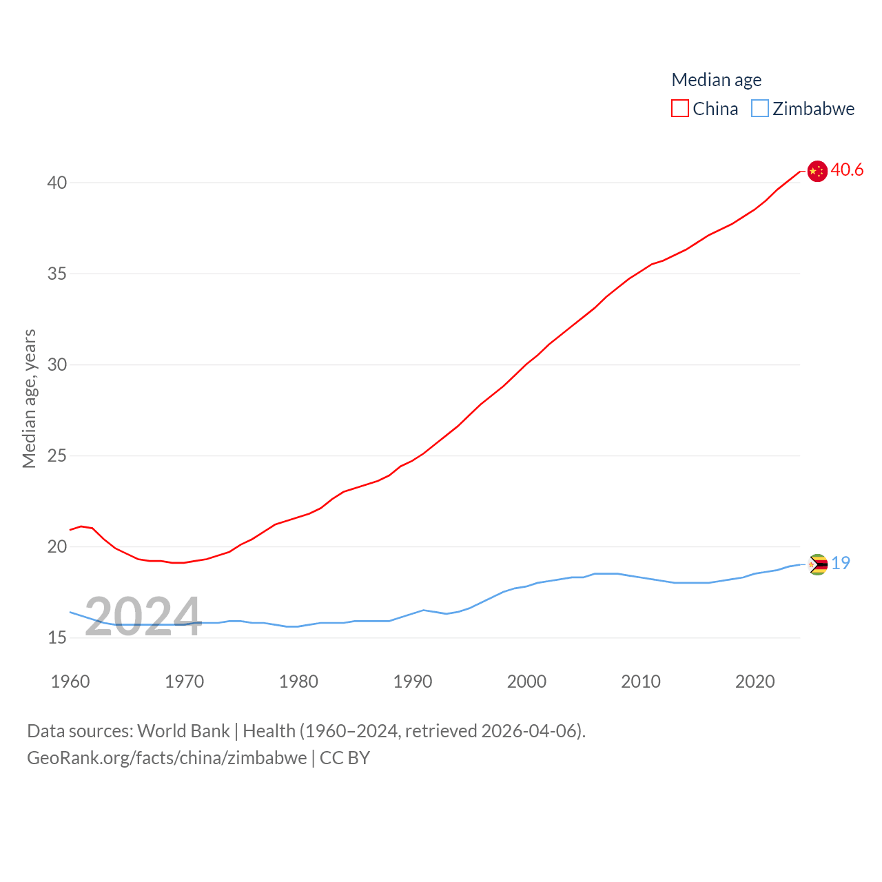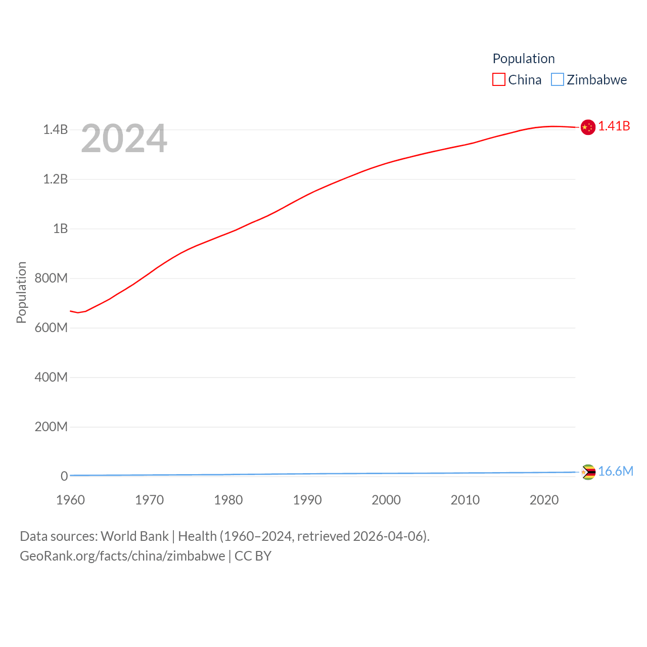 China has a population of 1.41B (ranked 2/197), compared with 16.6M in Zimbabwe (ranked 74/197). China's land area is 3,624,808 sq mi versus 149,364 sq mi for Zimbabwe (ranked 2nd vs. 60th).