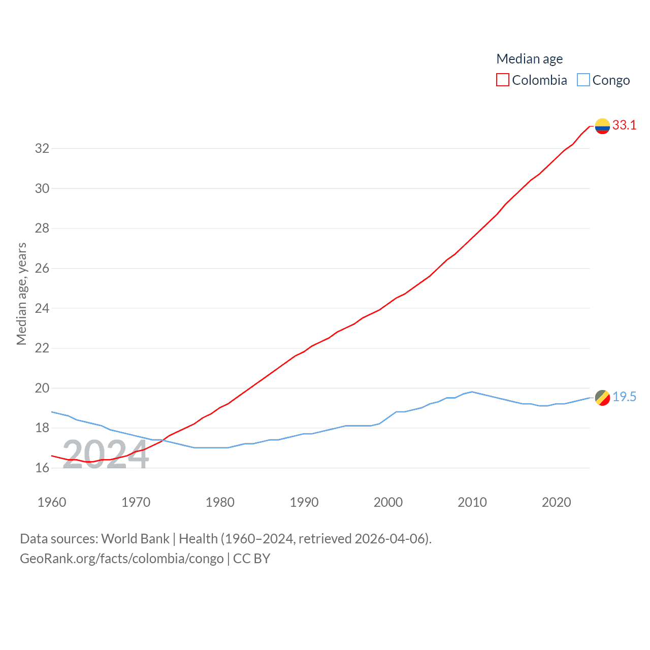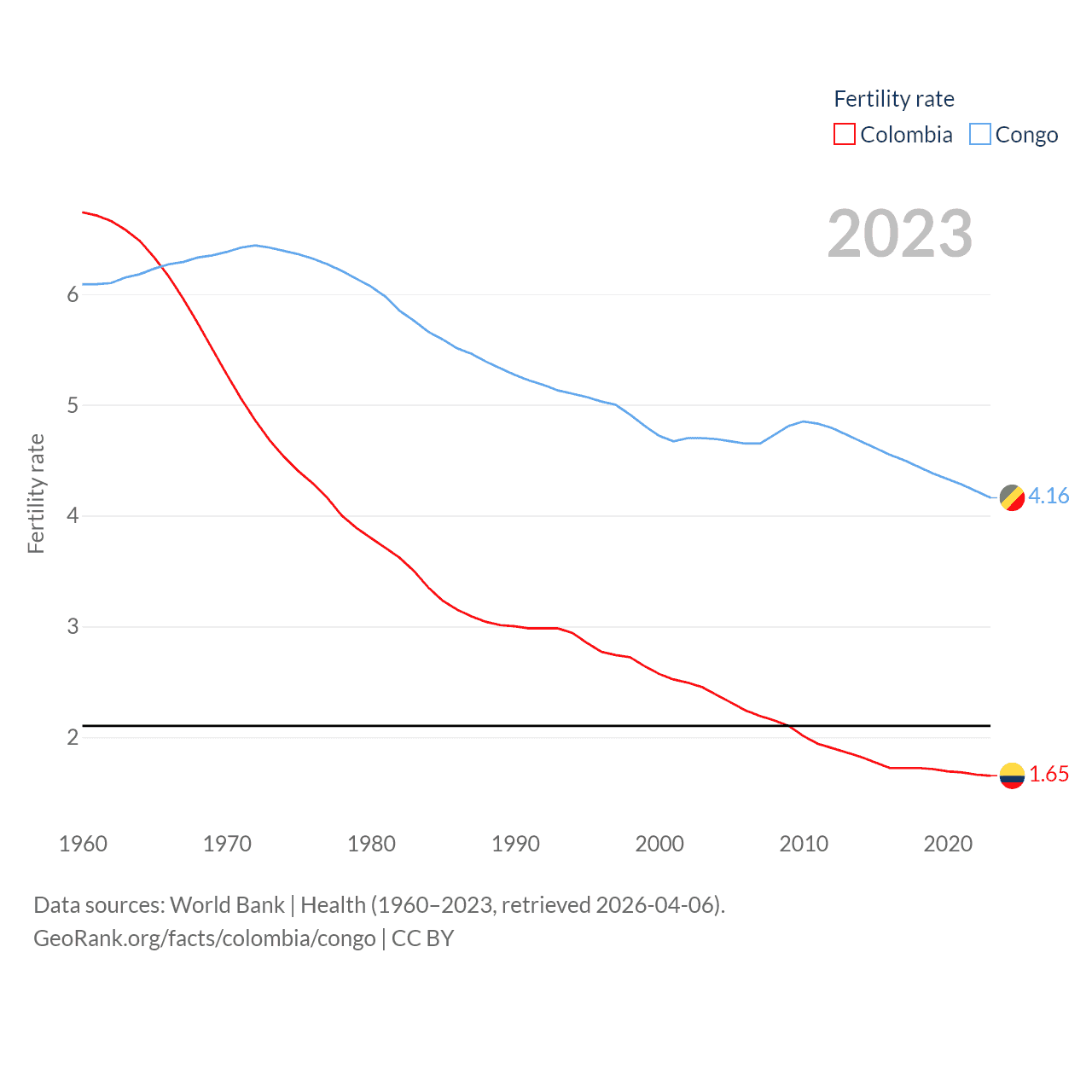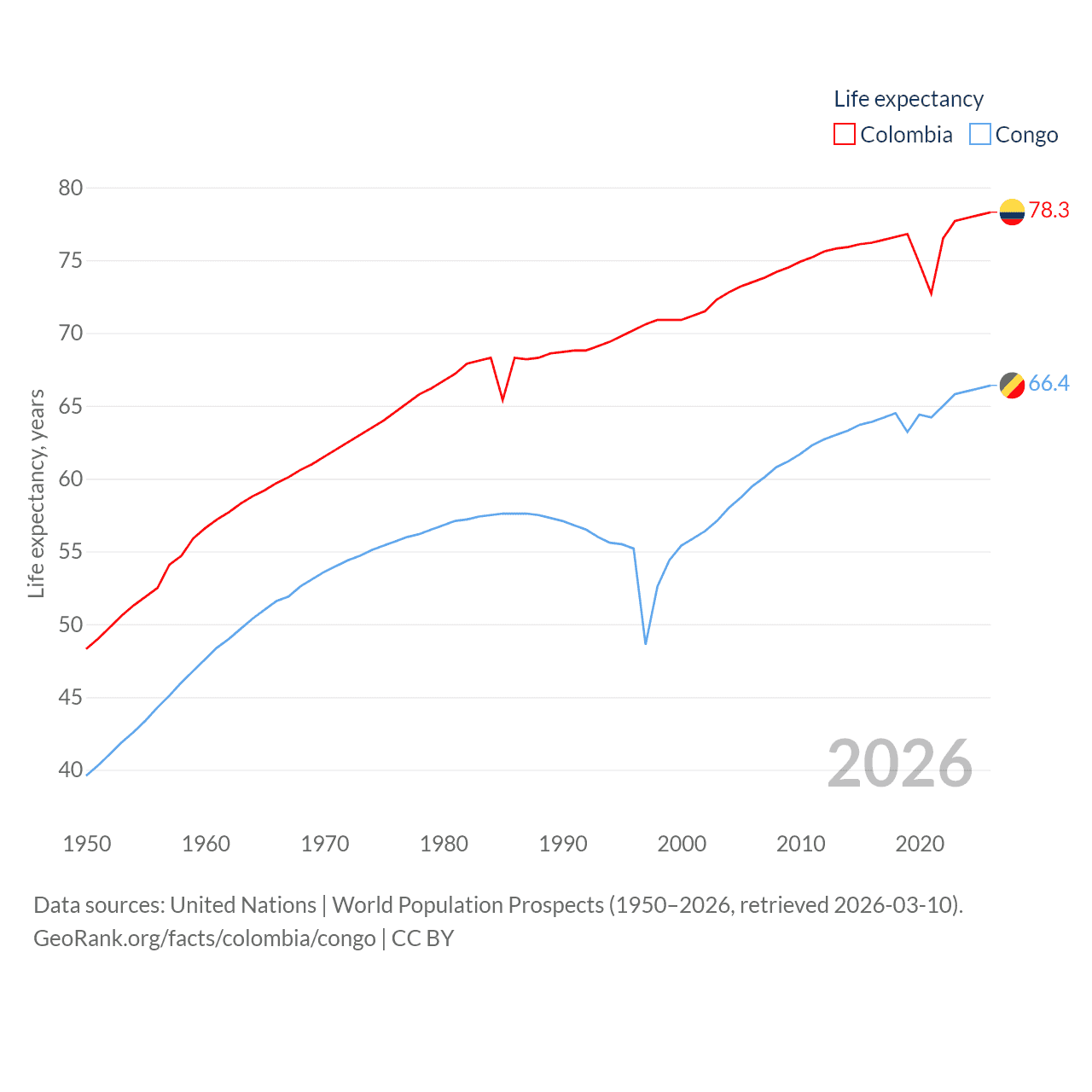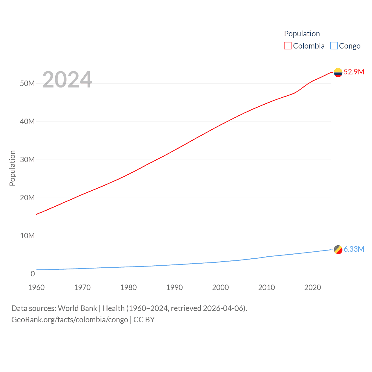 Colombia has a population of 52.9M (ranked 28/197), compared with 6.33M in The Congo (ranked 112/197). Colombia's land area is 428,380 sq mi versus 131,854 sq mi for The Congo (ranked 26th vs. 64th).