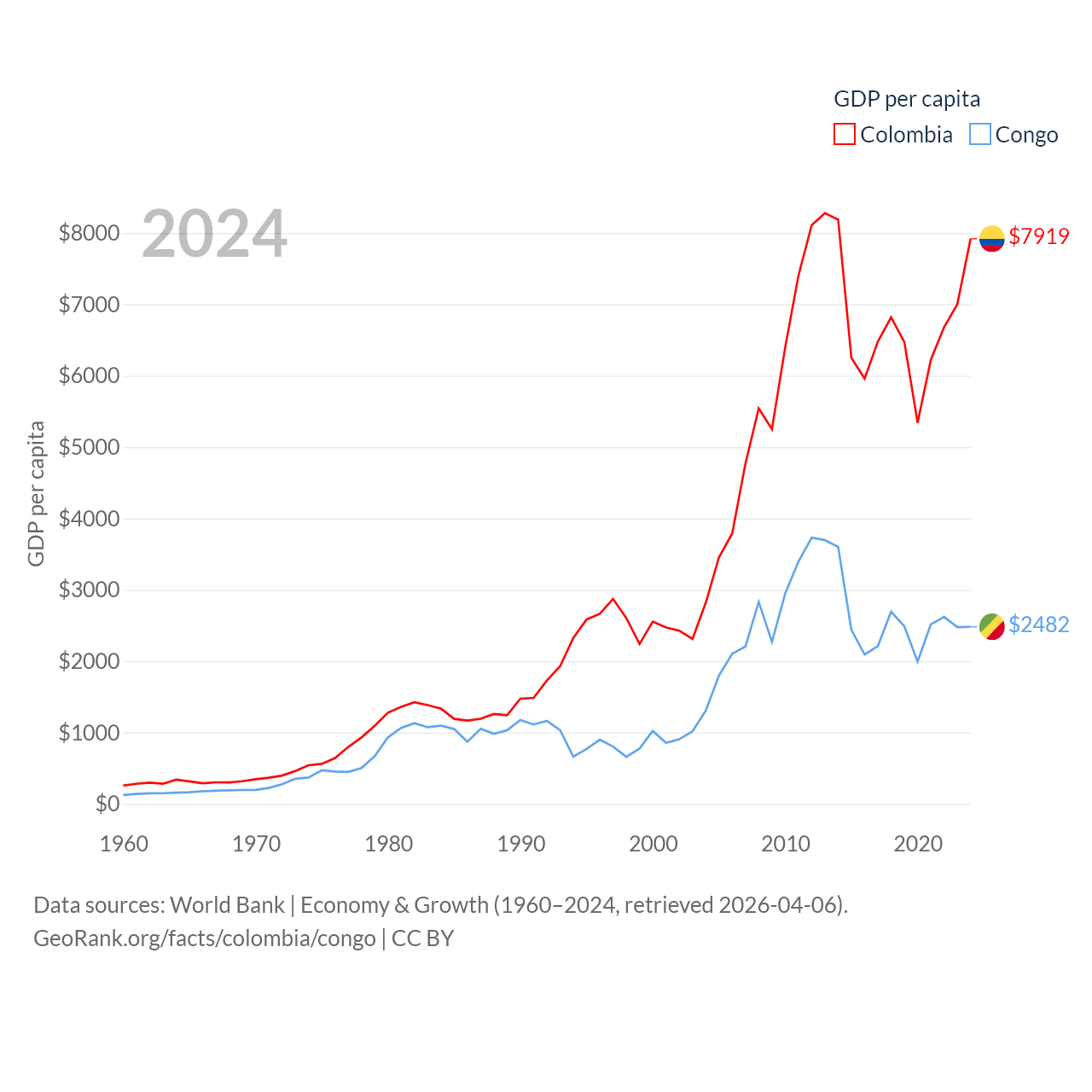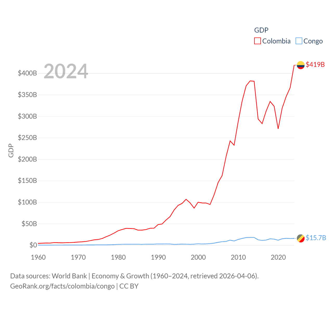 By GDP, Colombia ranks 39/197 ($419B) and The Congo ranks 141/197 ($15.7B). By GDP per capita, Colombia ranks 94/197 ($7,919), while The Congo ranks 149/197 ($2,482).