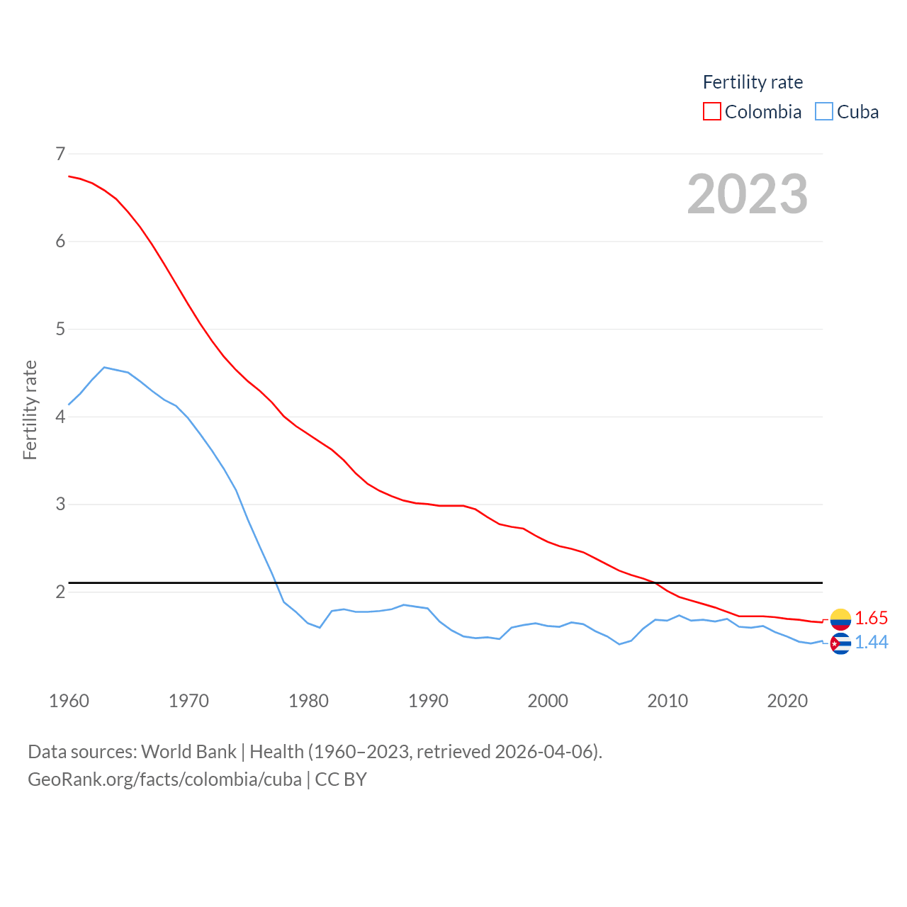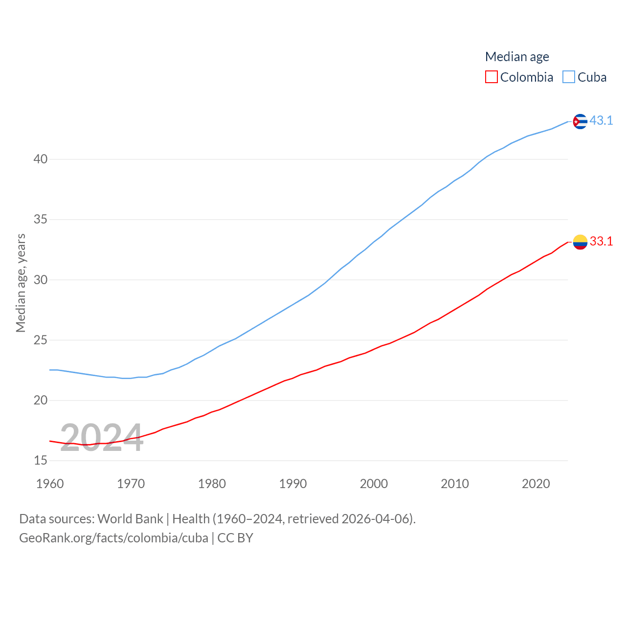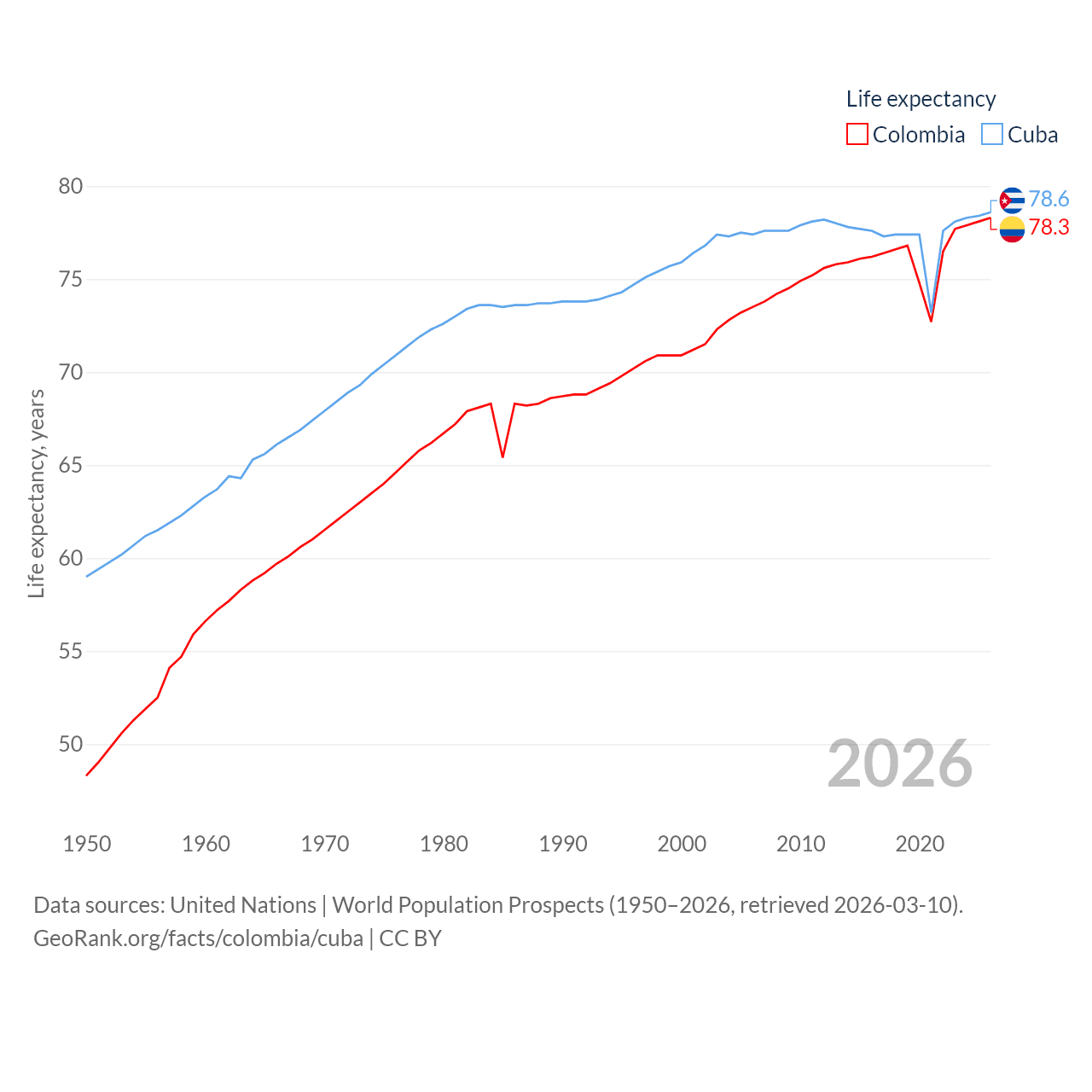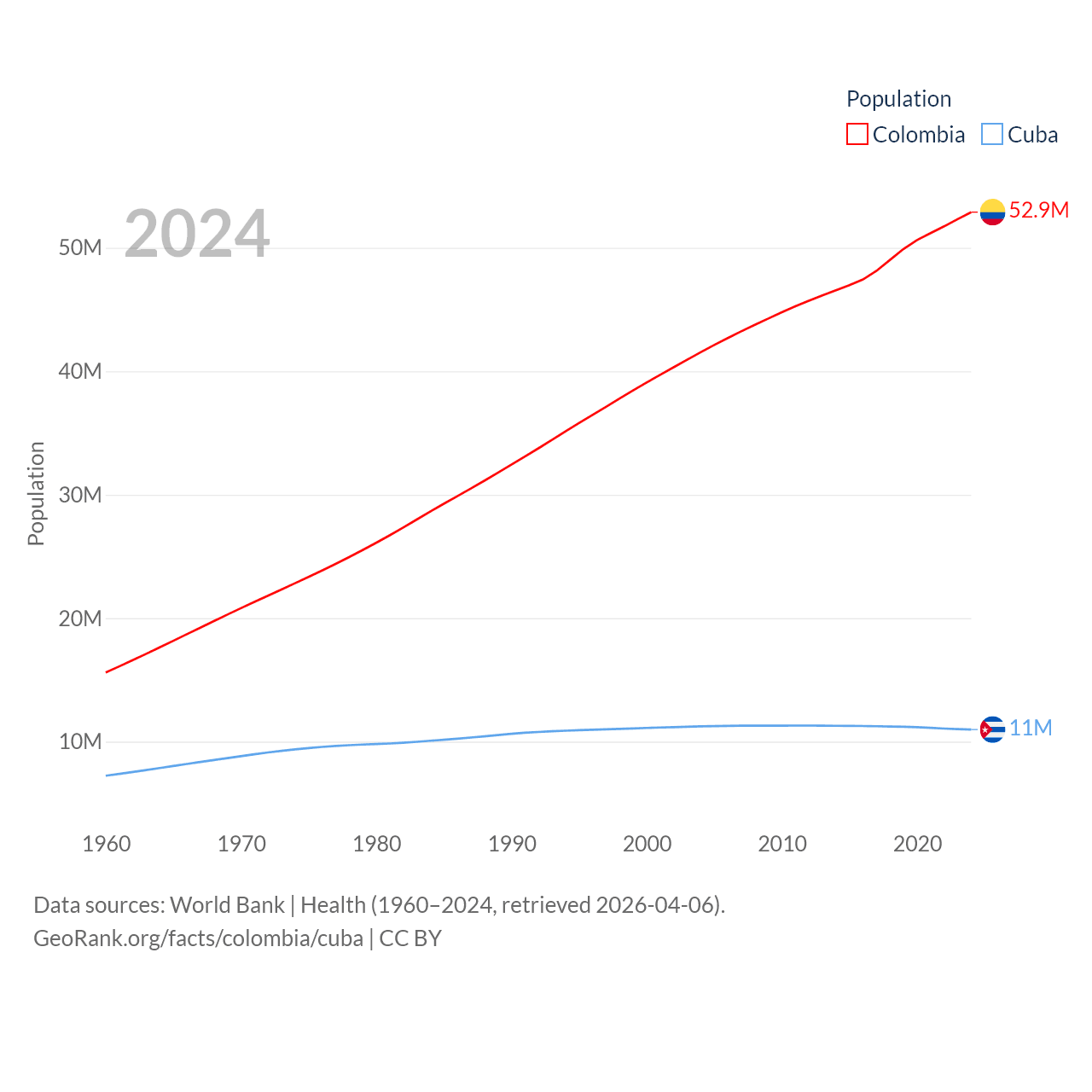 Colombia has a population of 52.9M (ranked 28/197), compared with 11M in Cuba (ranked 87/197). Colombia's land area is 428,380 sq mi versus 40,077 sq mi for Cuba (ranked 26th vs. 103rd).
