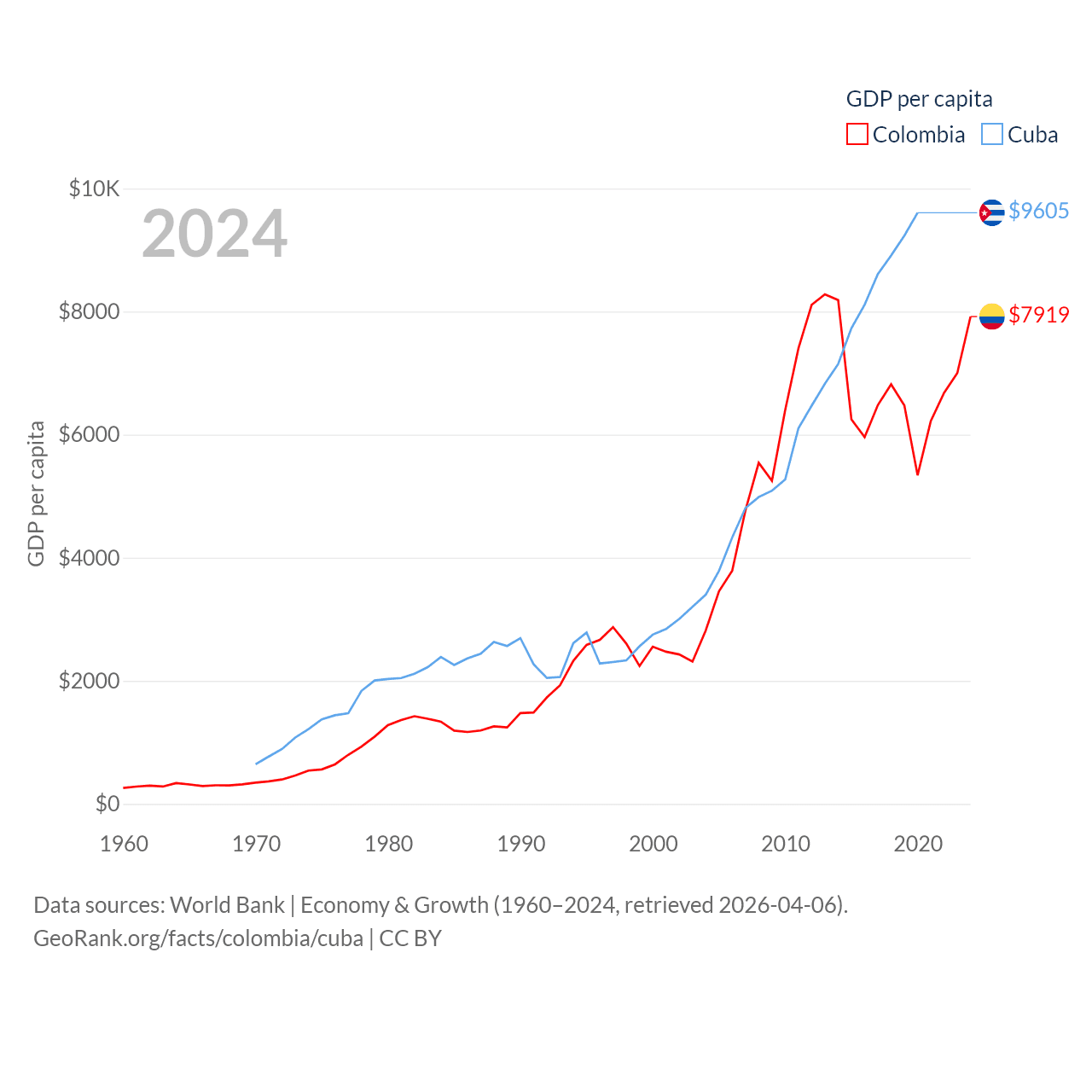 By GDP, Colombia ranks 39/197 ($419B) and Cuba ranks 69/197 ($107B). By GDP per capita, Colombia ranks 94/197 ($7,919), while Cuba ranks 86/197 ($9,605).