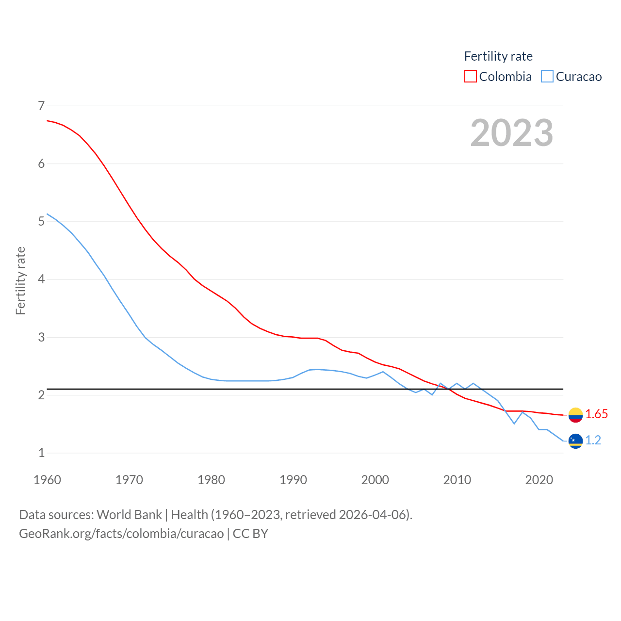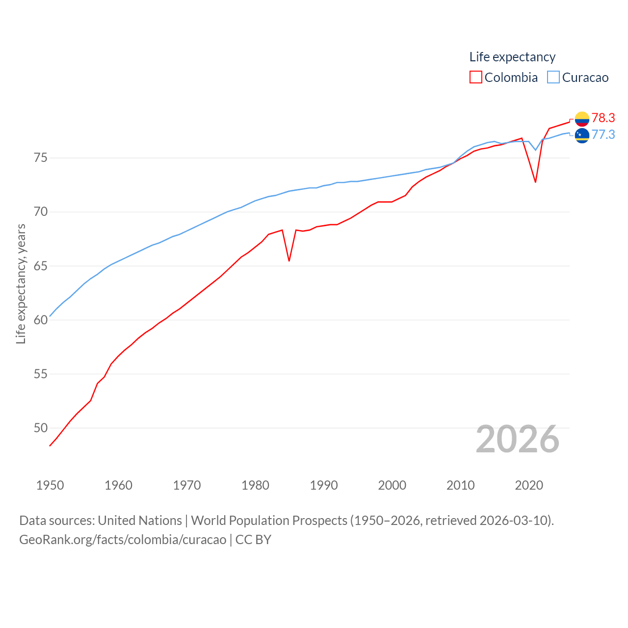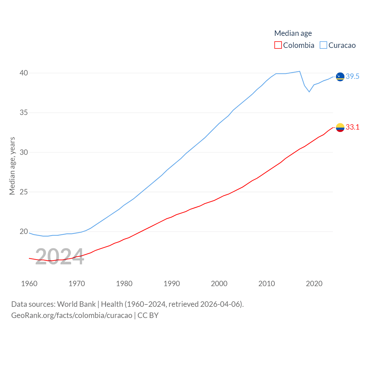Colombia has a population of 52.9M (ranked 28/197), compared with 156K in Curacao (ranked 179/197). Colombia's land area is 428,380 sq mi versus 171.4 sq mi for Curacao (ranked 26th vs. 182nd).