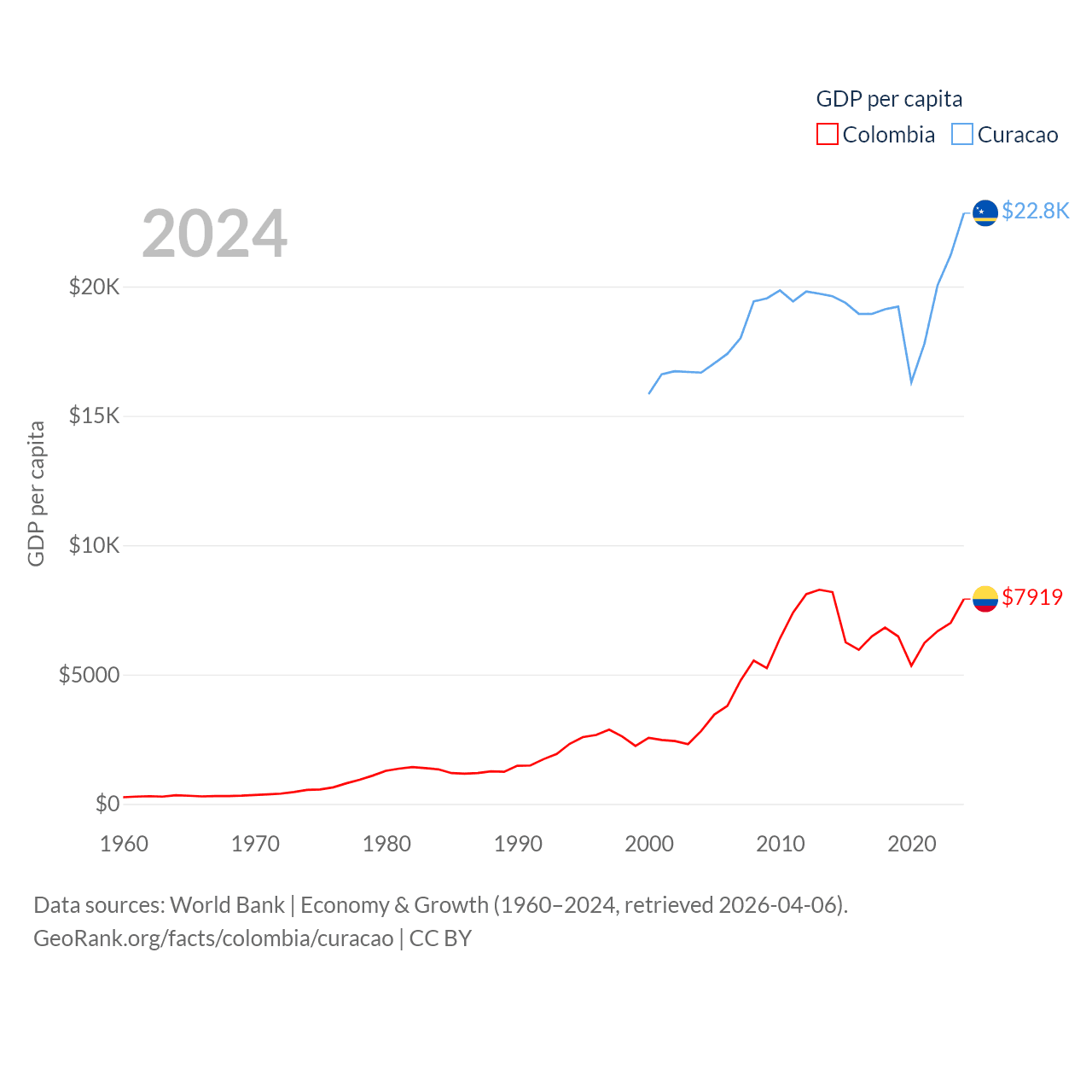 By GDP, Colombia ranks 39/197 ($419B) and Curacao ranks 167/197 ($3.56B). By GDP per capita, Colombia ranks 94/197 ($7,919), while Curacao ranks 56/197 ($22,833).