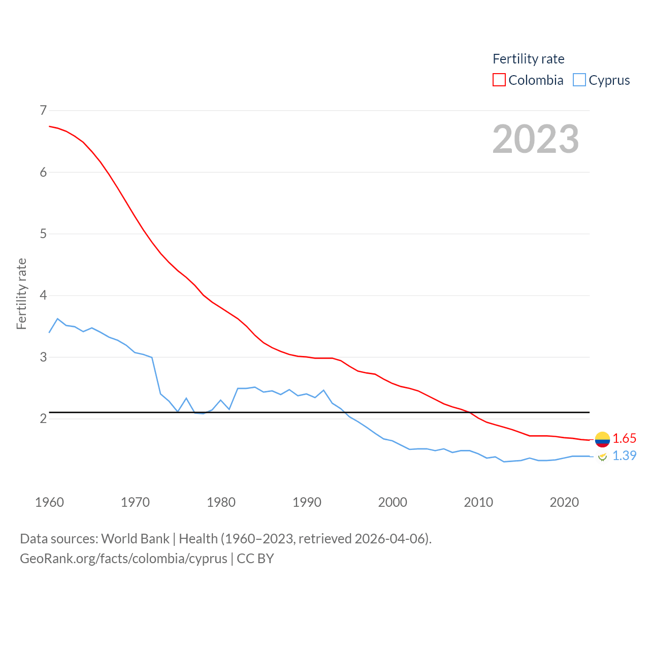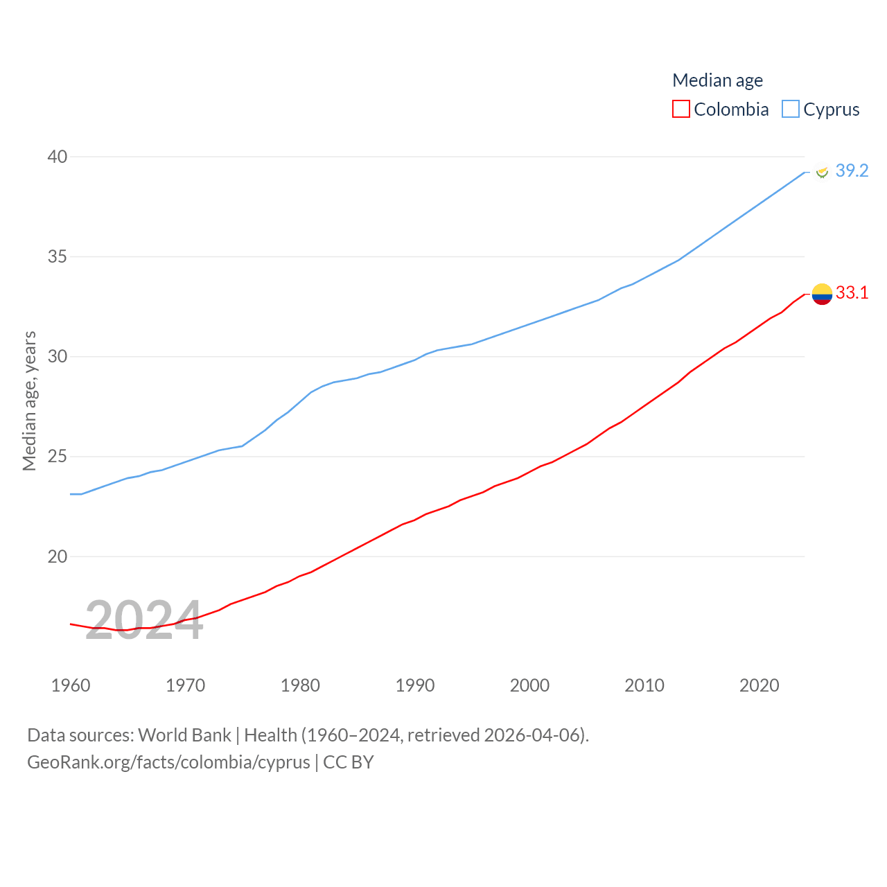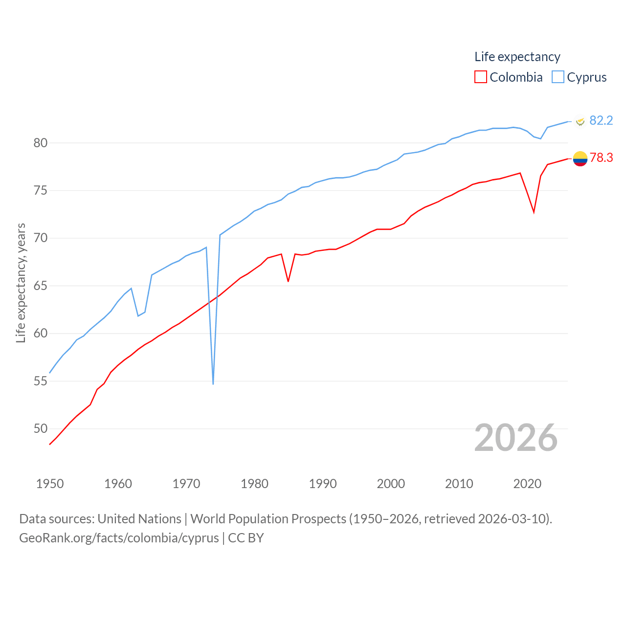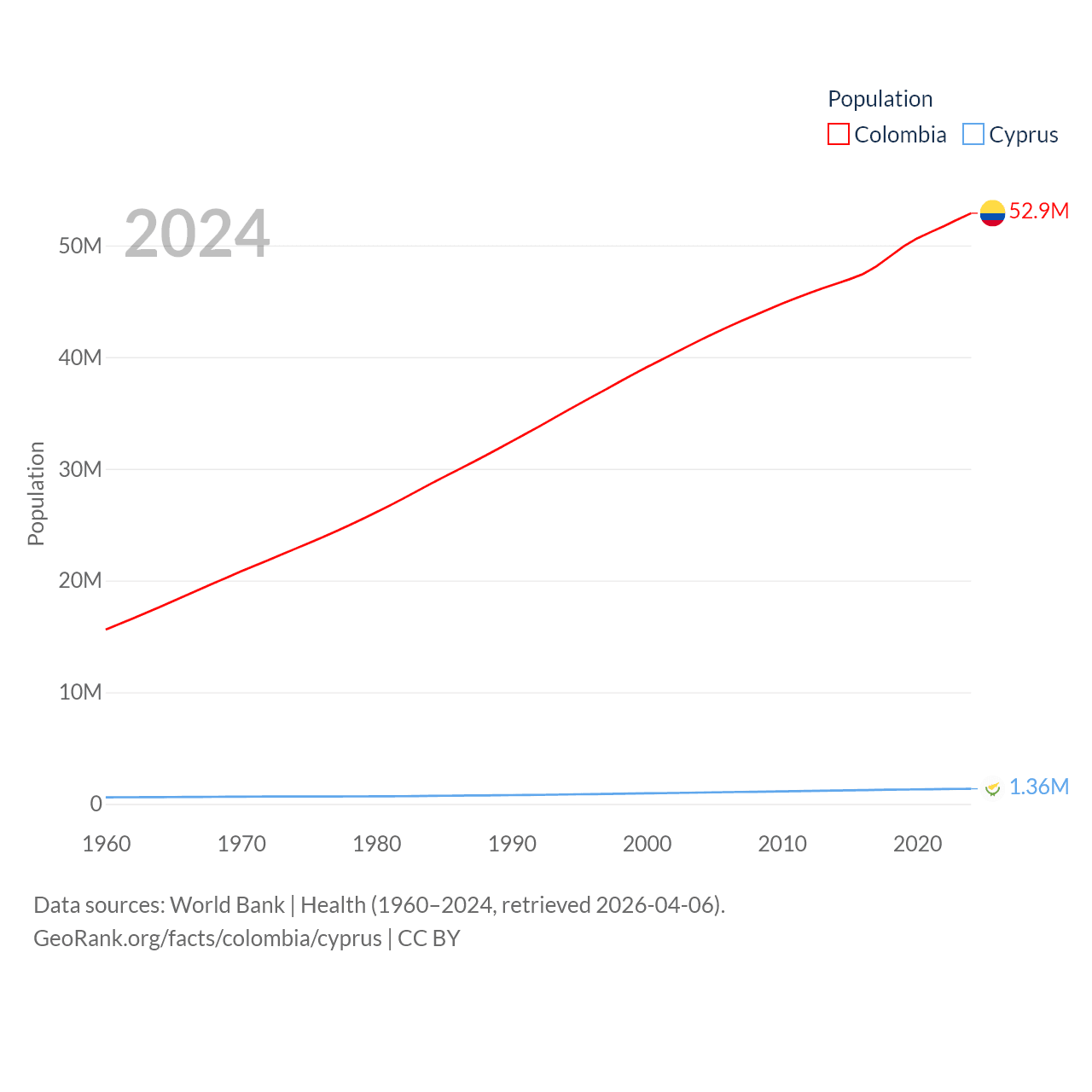 Colombia has a population of 52.9M (ranked 28/197), compared with 1.36M in Cyprus (ranked 155/197). Colombia's land area is 428,380 sq mi versus 3,568 sq mi for Cyprus (ranked 26th vs. 163rd).