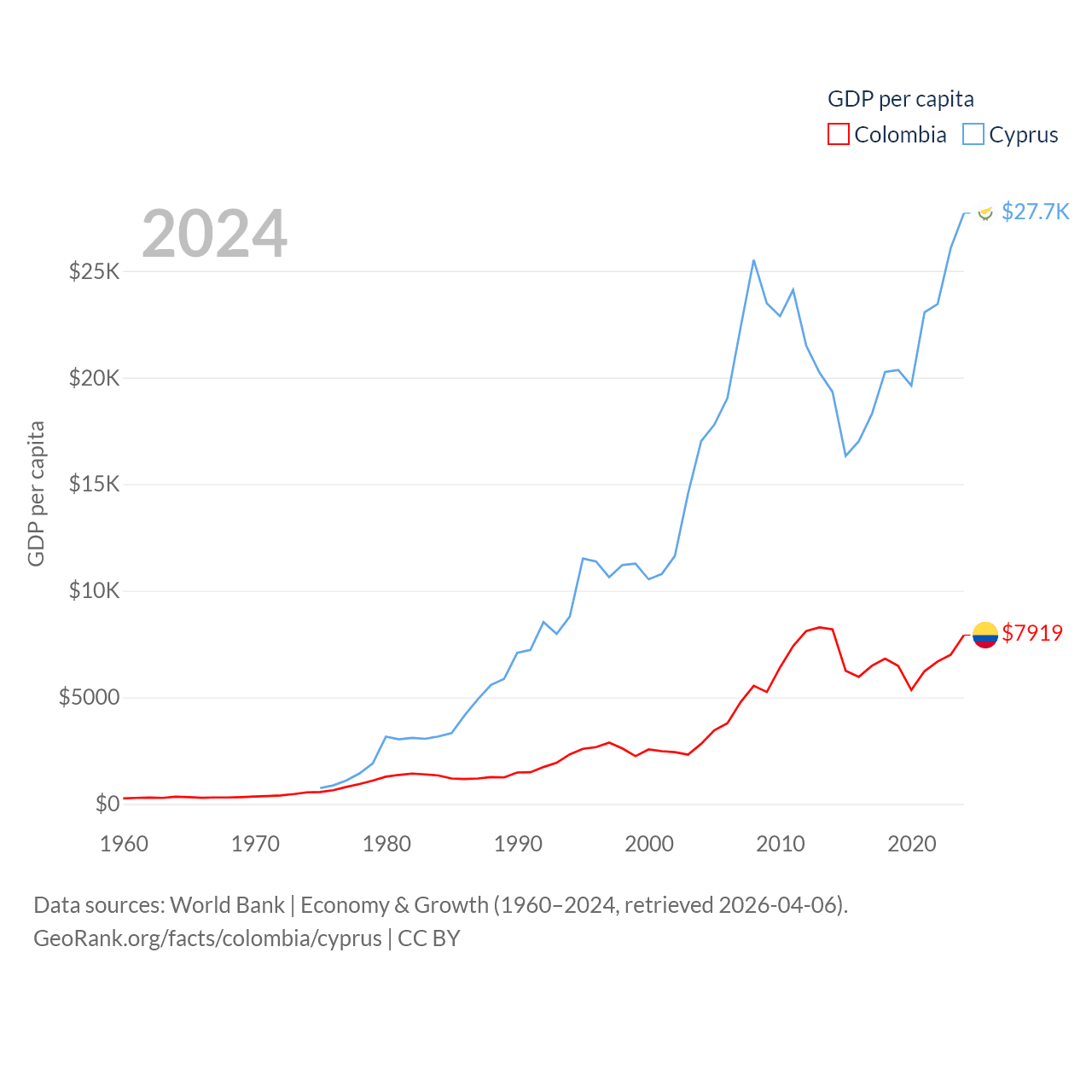 By GDP, Colombia ranks 39/197 ($419B) and Cyprus ranks 103/197 ($37.6B). By GDP per capita, Colombia ranks 94/197 ($7,919), while Cyprus ranks 45/197 ($27,707).