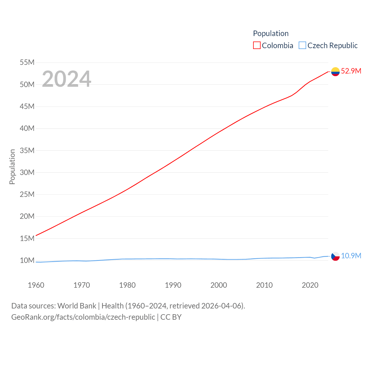 Colombia has a population of 52.9M (ranked 28/197), compared with 10.9M in The Czech Republic (ranked 88/197). Colombia's land area is 428,380 sq mi versus 29,794 sq mi for The Czech Republic (ranked 26th vs. 114th).