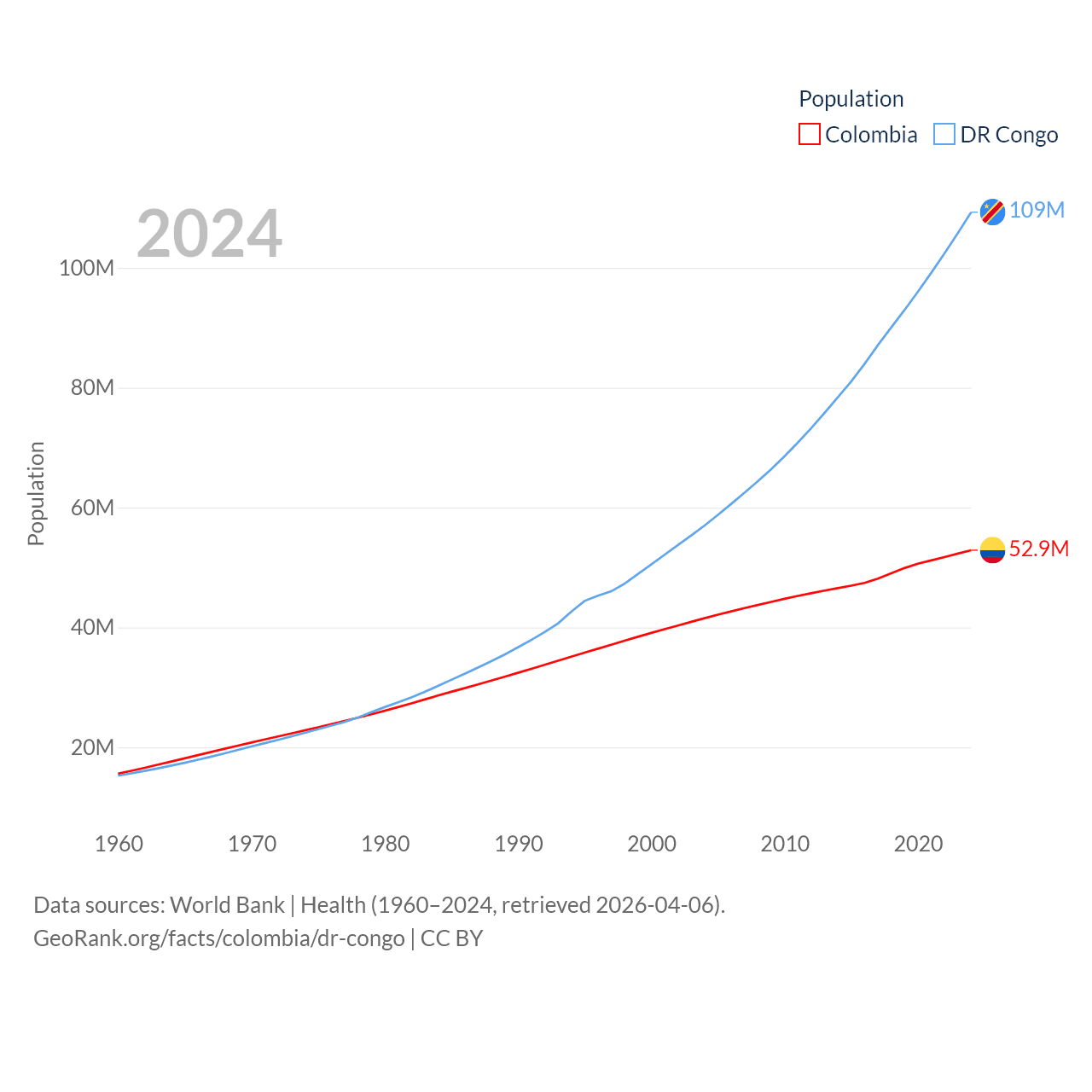 Colombia has a population of 52.9M (ranked 28/197), compared with 109M in The DR Congo (ranked 15/197). Colombia's land area is 428,380 sq mi versus 875,313 sq mi for The DR Congo (ranked 26th vs. 11th).
